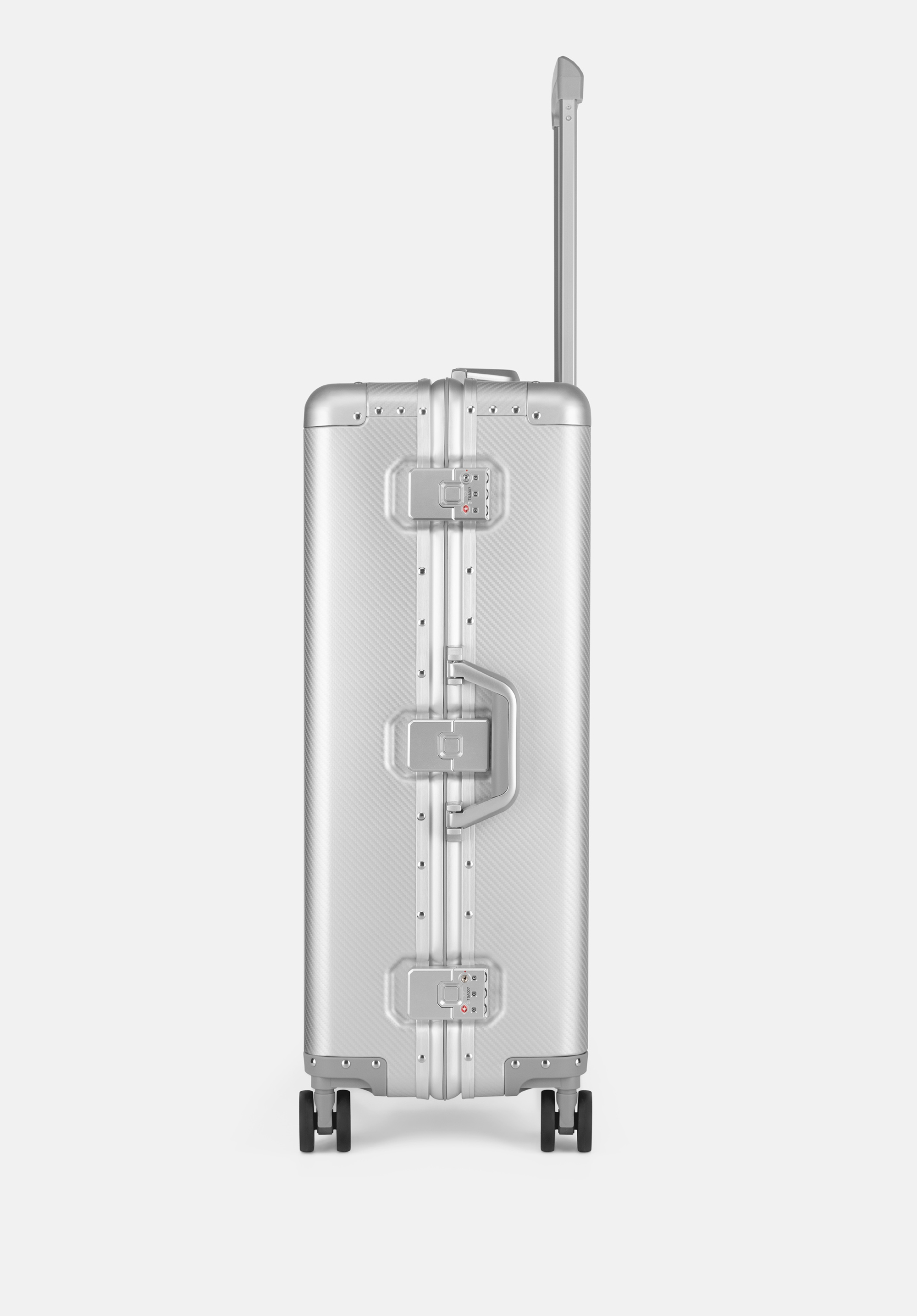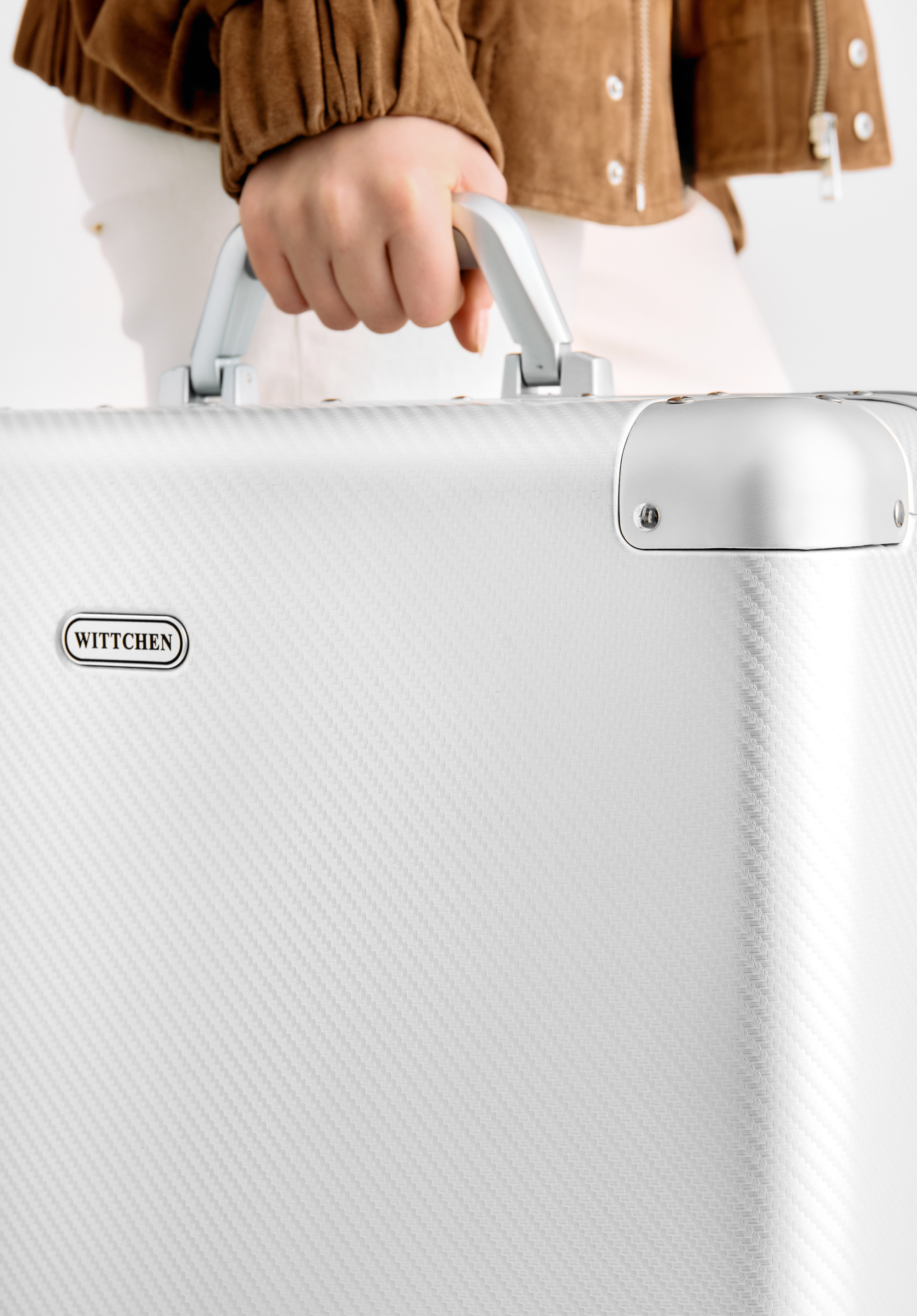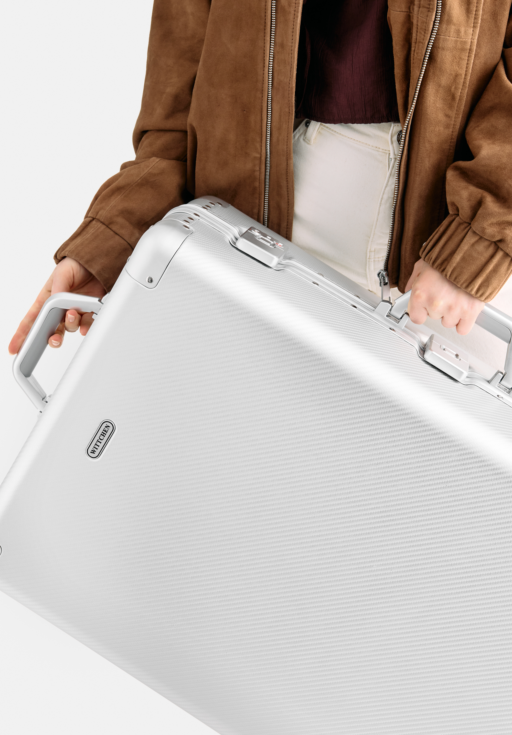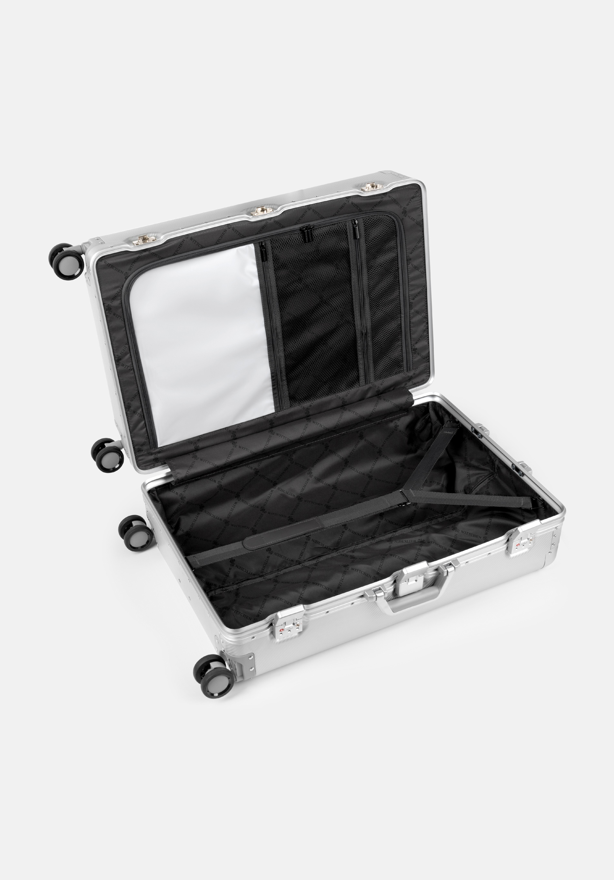 Fedezze fel az exkluzív, közepes méretű WITTCHEN bőröndöt, amely 100%-ban alumíniumból készült. A megerősített, szegecselt borítások és a precízen kidolgozott részletek különleges dizájnt biztosítanak, míg a masszív szerkezet megvédi a holmidat az utazás során. A négy dupla kerék és a teleszkópos fogantyú kényelmes mozgást tesz lehetővé, a további TSA zárak pedig garantálják a poggyász biztonságát.