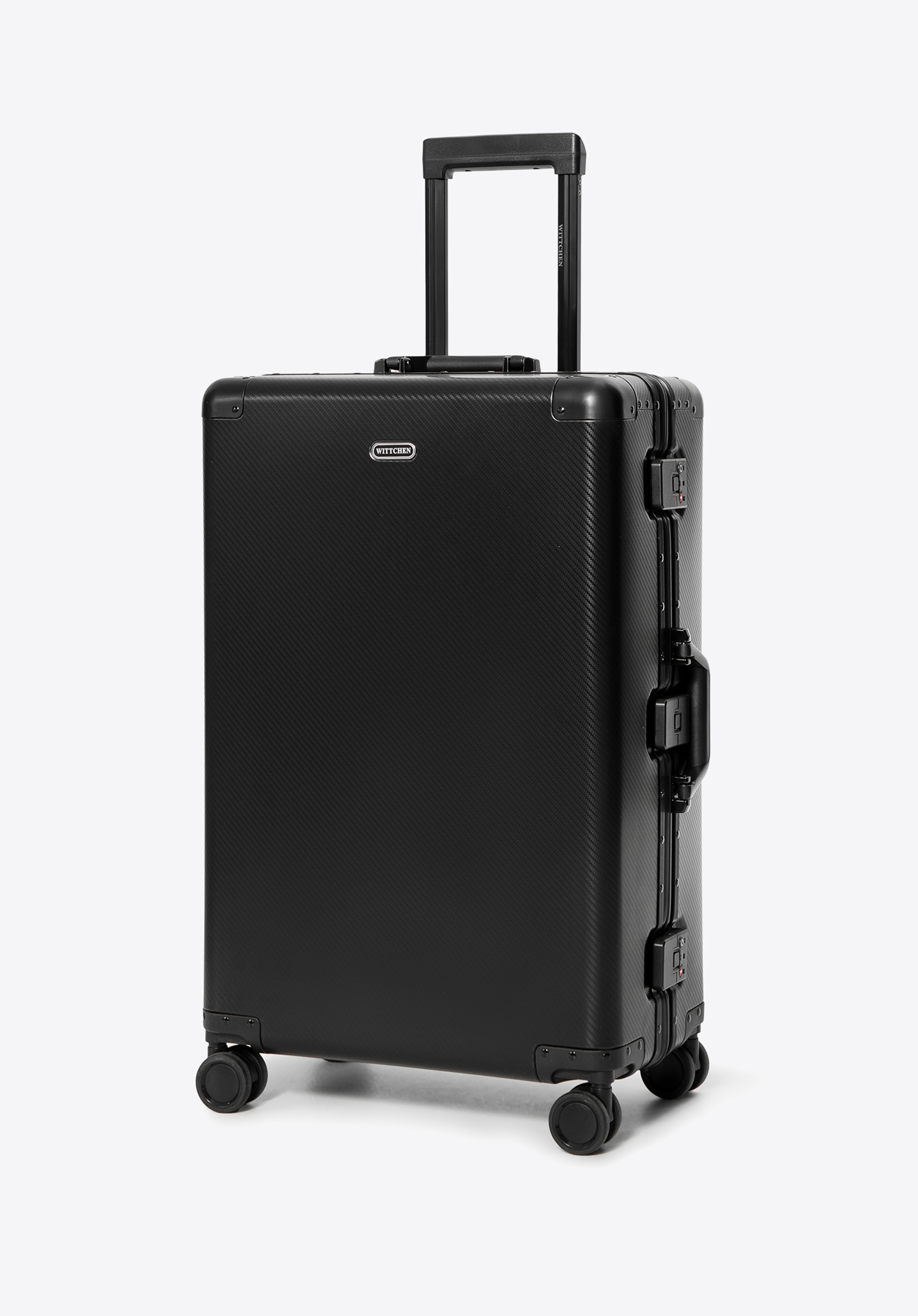 Fedezze fel az exkluzív, közepes méretű WITTCHEN bőröndöt, amely 100%-ban alumíniumból készült. A megerősített, szegecselt borítások és a precízen kidolgozott részletek különleges dizájnt biztosítanak, míg a masszív szerkezet megvédi a holmidat az utazás során. A négy dupla kerék és a teleszkópos fogantyú kényelmes mozgást tesz lehetővé, a további TSA zárak pedig garantálják a poggyász biztonságát.