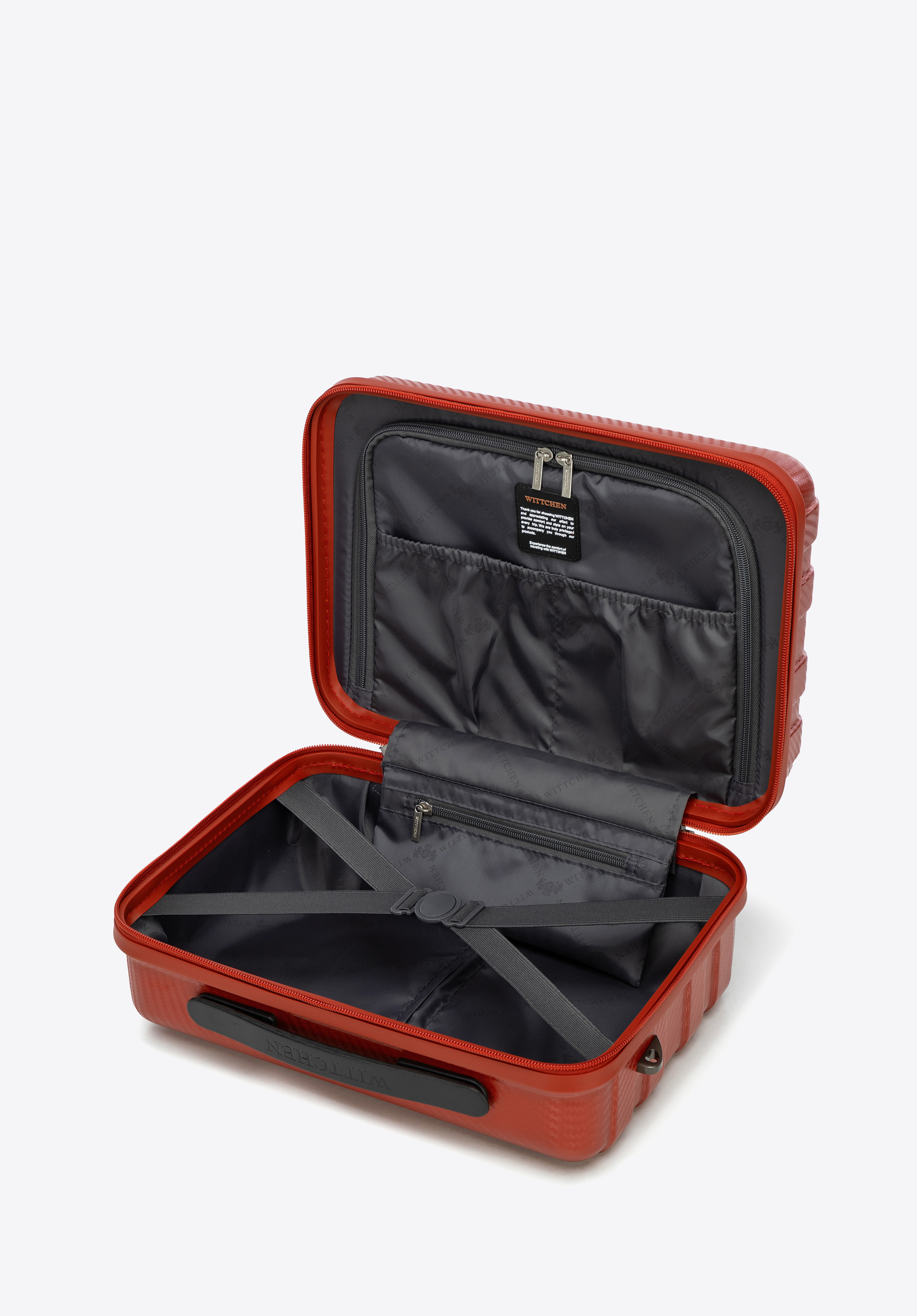 - Kozmetikai táska: Fogantyúval, levehető és állítható vállpánttal és a bőrönd fogantyújához rögzíthető rugalmas pánttal ellátva.
