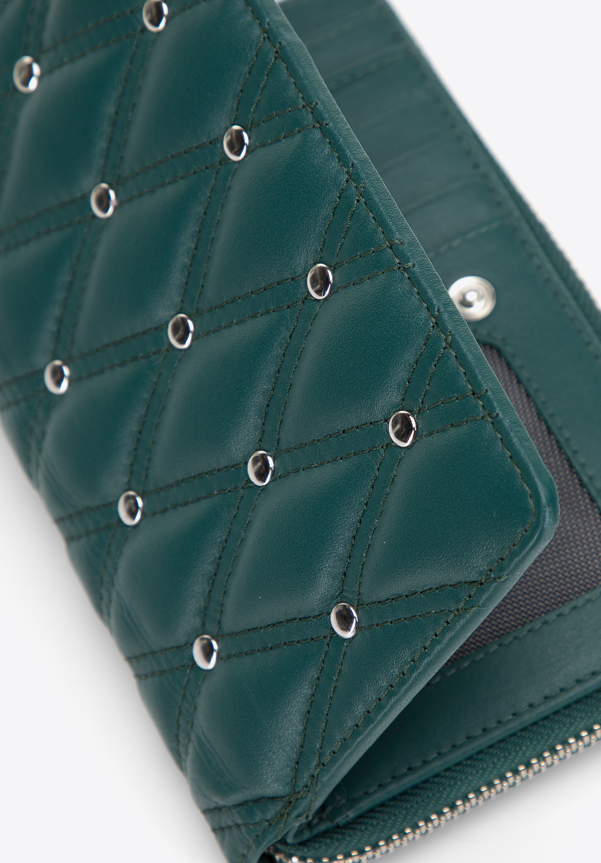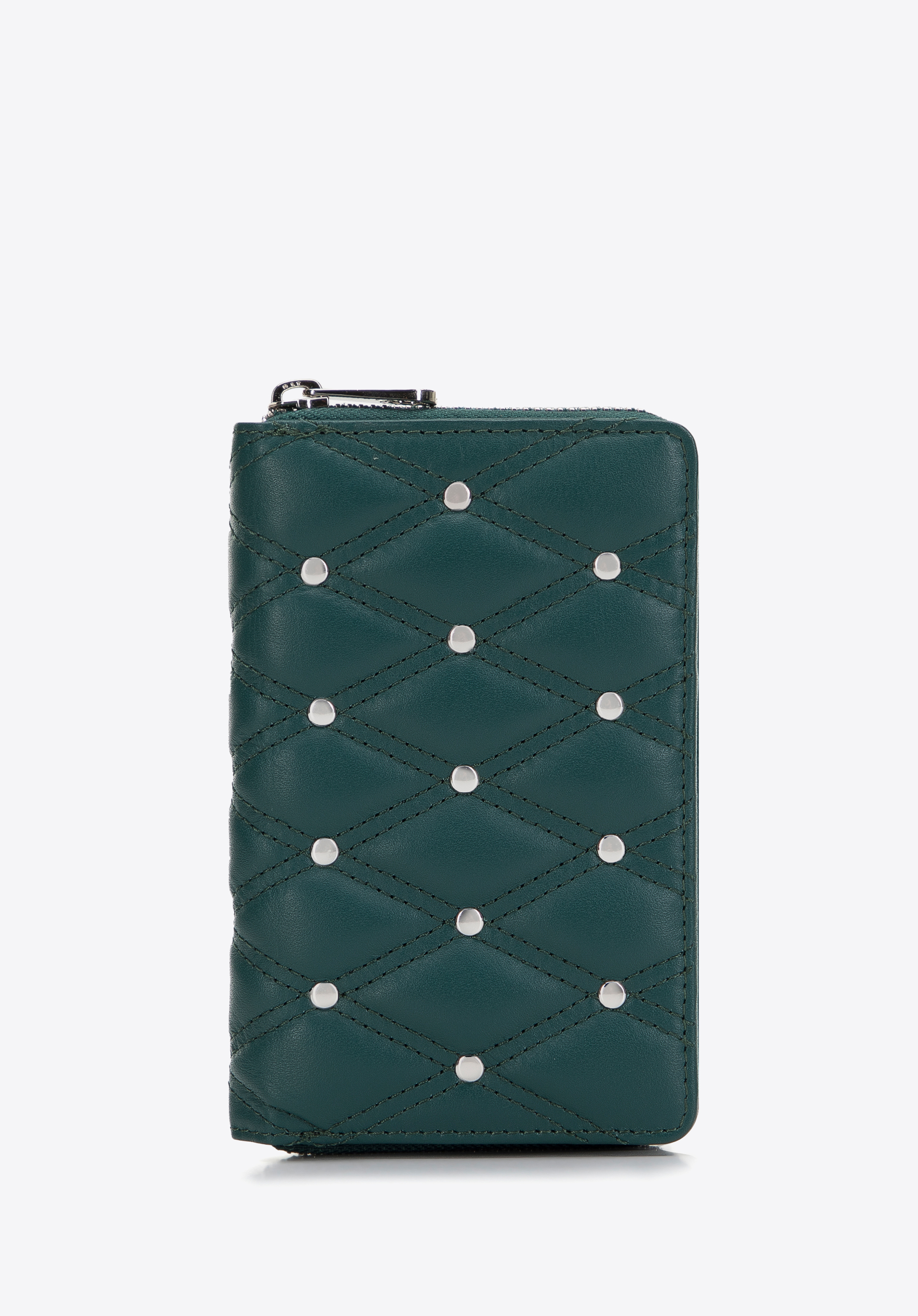 Ez az elegáns és stílusos pénztárca az egyedi kiegészítők rajongóinak felettéb tetszeni fog. Kiváló minőségű természetes bőrből készült. A mértani pontosságú steppelést apró szegecsek hangsúlyozzák. Ez a modell kétoldalas: az egyik oldalon egy cipzáras érmezseb, a másikon pedig egy rekesz található, mely pattintós zárral van ellátva. Belül számos nyitott zseb, kártyatartó tok és egy hálós zseb található, ahová például egy jegyet vagy fényképet tárolhat. Ezenkívül speciális béléssel van ellátva , amely megvédi a kártyákat az adatleolvasástól (RFID). A közepes méretű steppelt női bőrtárca dekoratív szegecsekkel számos évszakra remek választás.