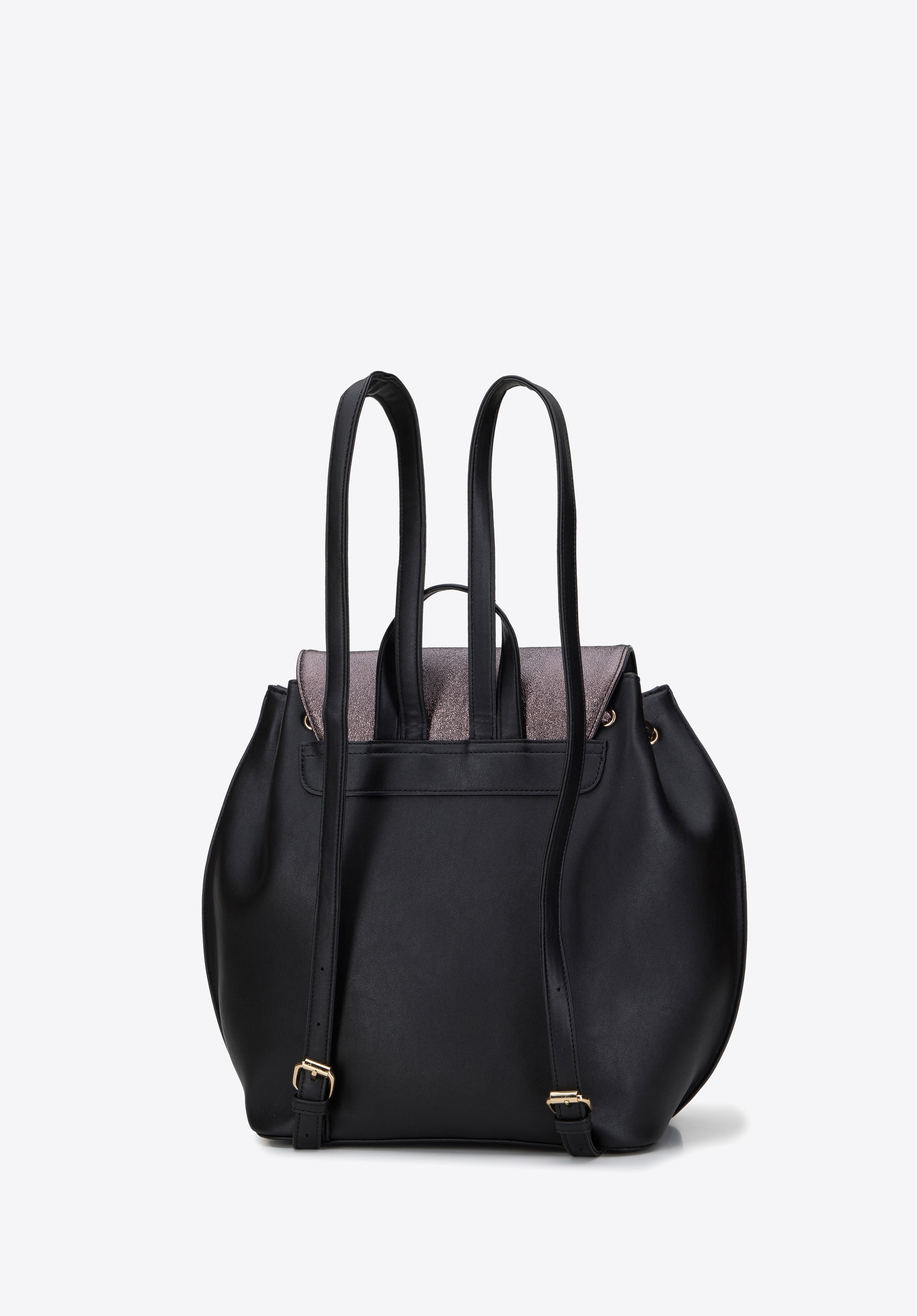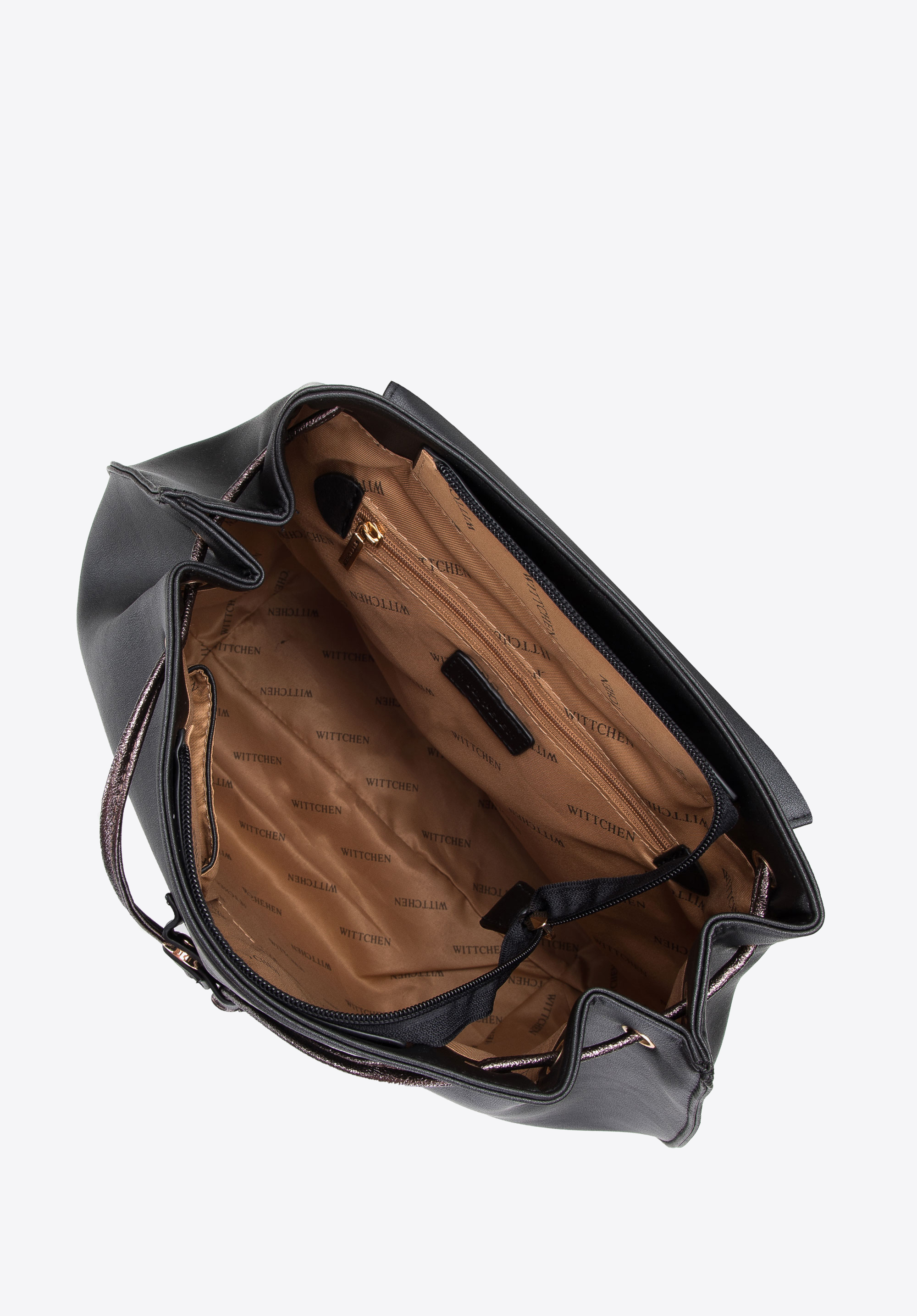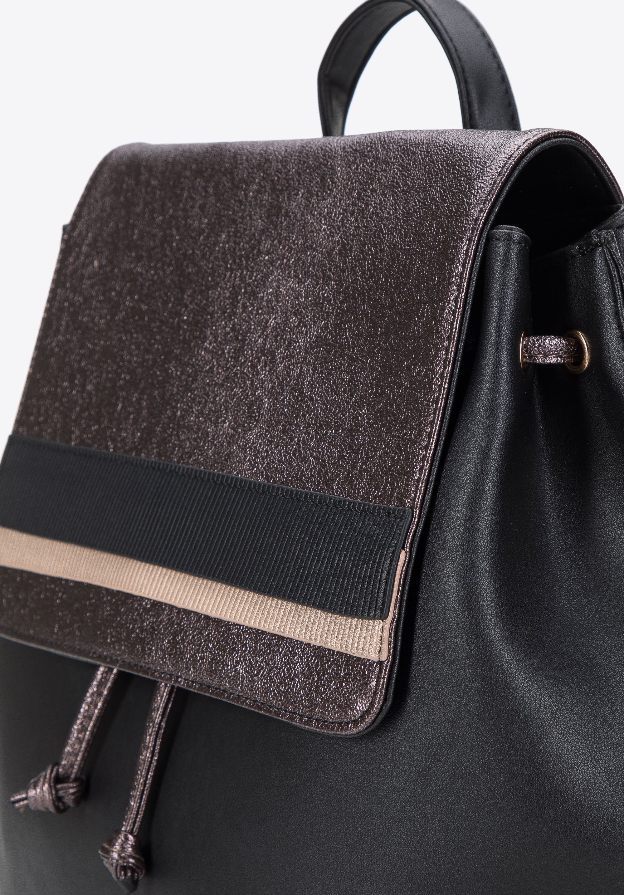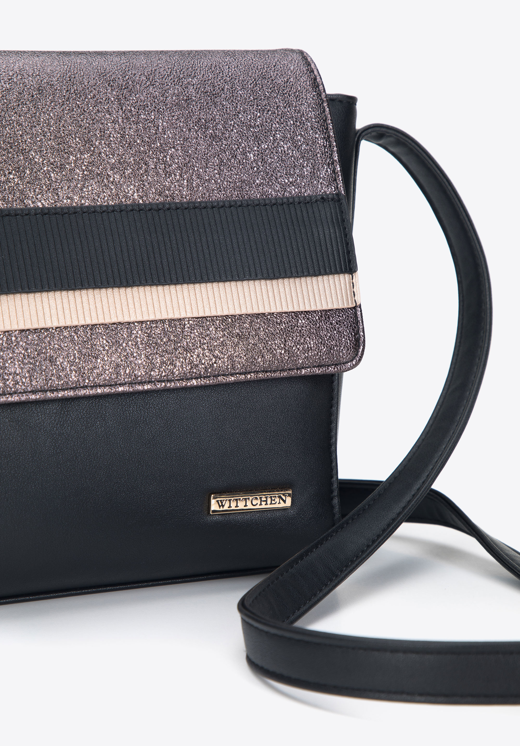 Ez a női kistáska klasszikus szabással rendelkezik, modern kivitelben. Fényes ökológiai bőrből készült. Vízszintes csíkokkal ellátott fémesen csillogó fedél díszíti. Elég tágas, elfér benne egy pénztárca, telefon, naptár, egy kis üveg víz és néhány apróság. Ez a modell jól mutat egy meleg pulóverrel és egy vastag platformon lévő bokacsizmával, de akár kedvenc ruháddal is viselheted. Ez a táska egy dekoratív kiegészítő, amitől minden nap különleges leszel.