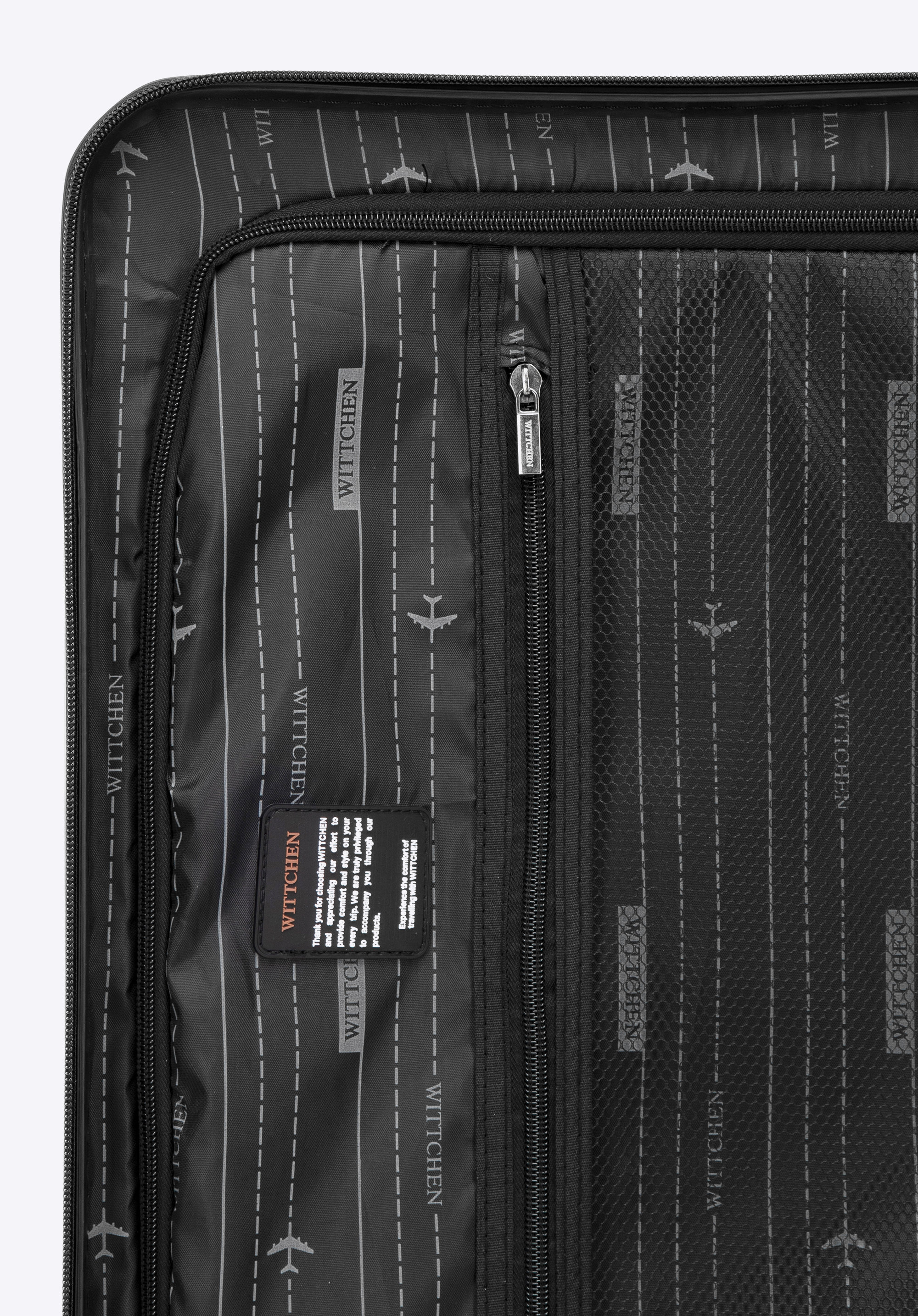 - Átgondolt belső tér : A bőrönd egyik oldala állítható pántokkal van felszerelve, amelyek a helyükön tartják a ruhákat, míg a másik oldalon cipzáras elválasztó található egy hálós cipzáras zsebbel .