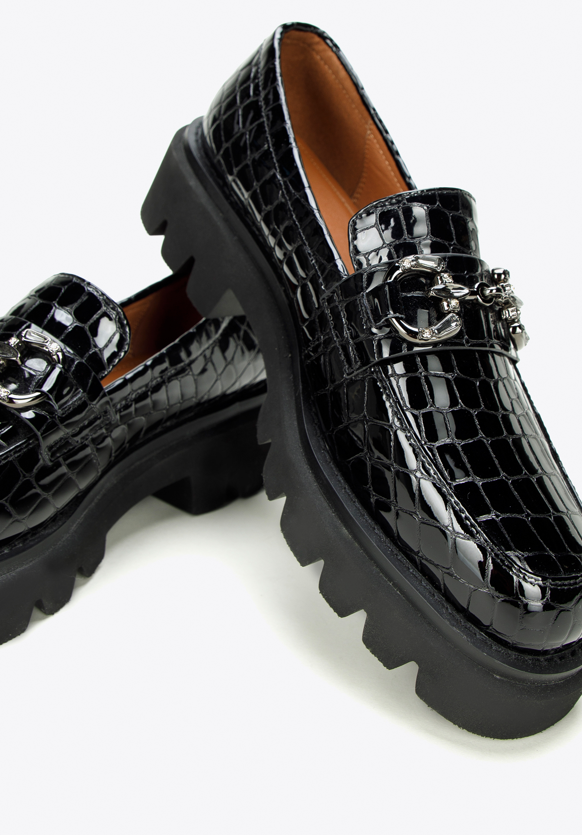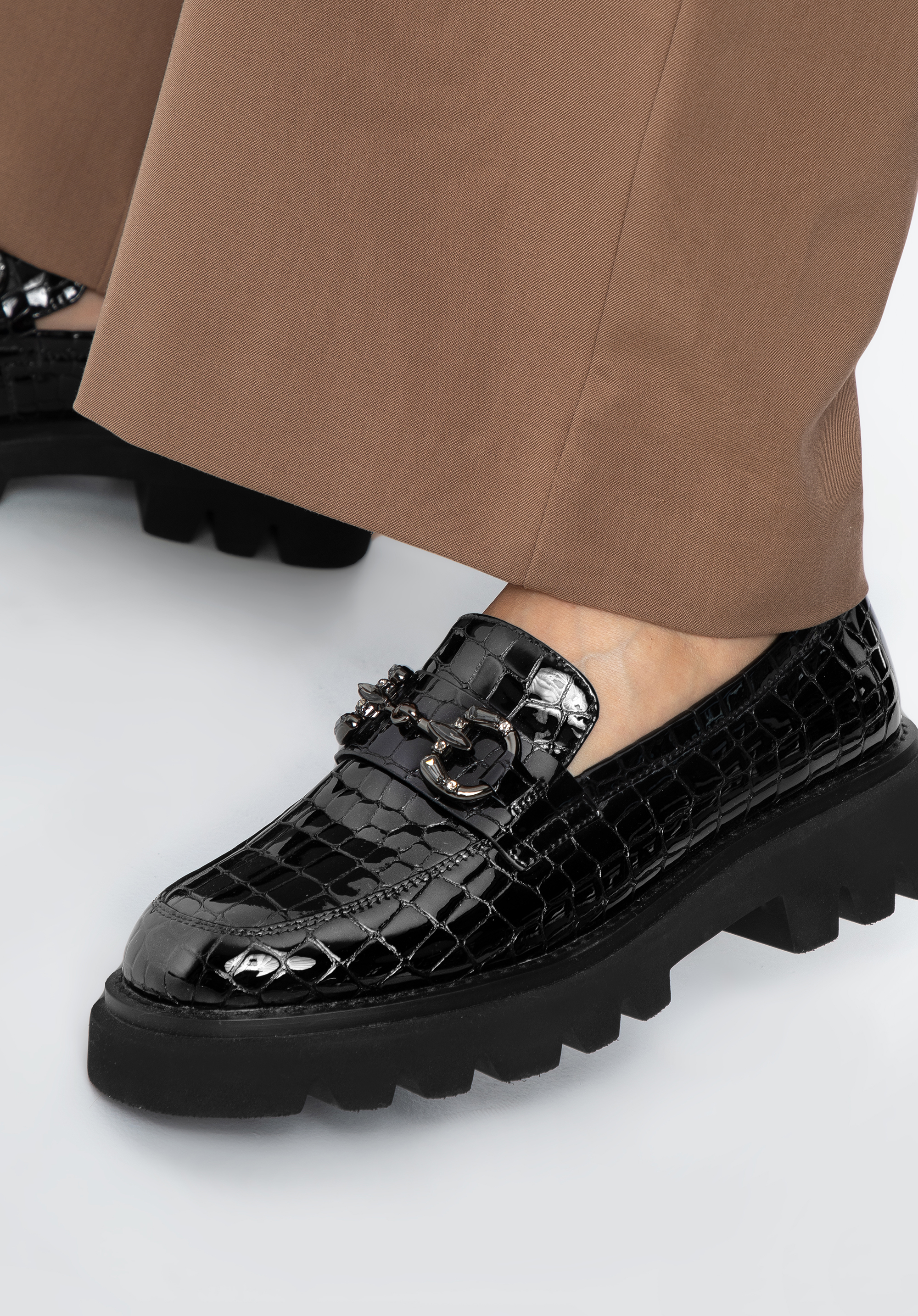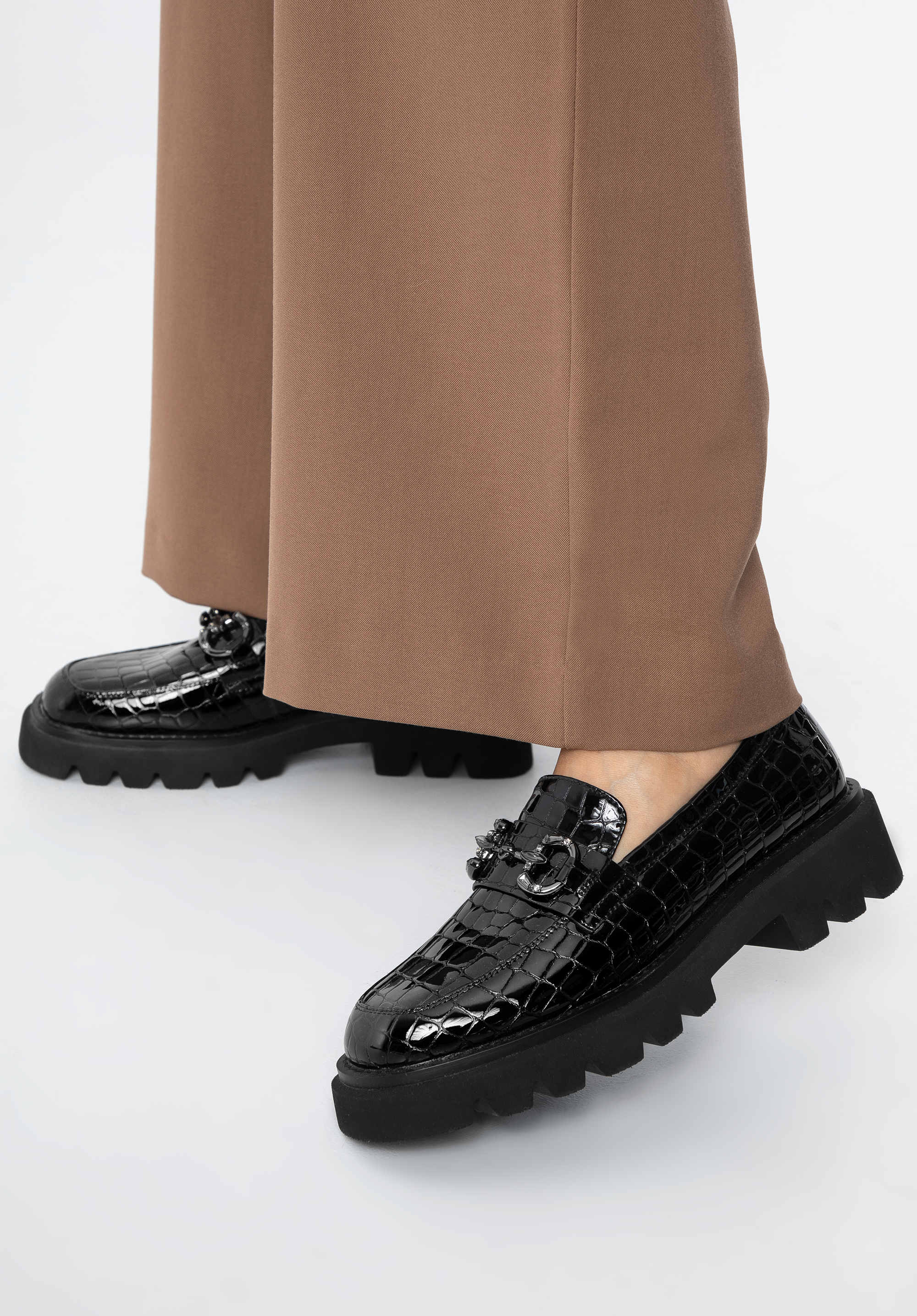 Sok figyelmet vonz majd ezekben az eredeti mokaszinokban. Elegáns lakkbőrből készültek . A kristályokkal díszített csat ragyogást ad. A platformnak köszönhetően több órán keresztül, szinte minden körülmény között kényelmesen viselheted őket. Viseld kedvenc miniruháddal vagy kombináld klasszikus kabáttal és farmerrel a mindennapi viselethez. A fényes platformos csatokkal ellátott női lakkcipő divatos kiegészítő, amelyet munka közben és után is viselhetsz – minden helyzetben stílusosan fogsz kinézni.