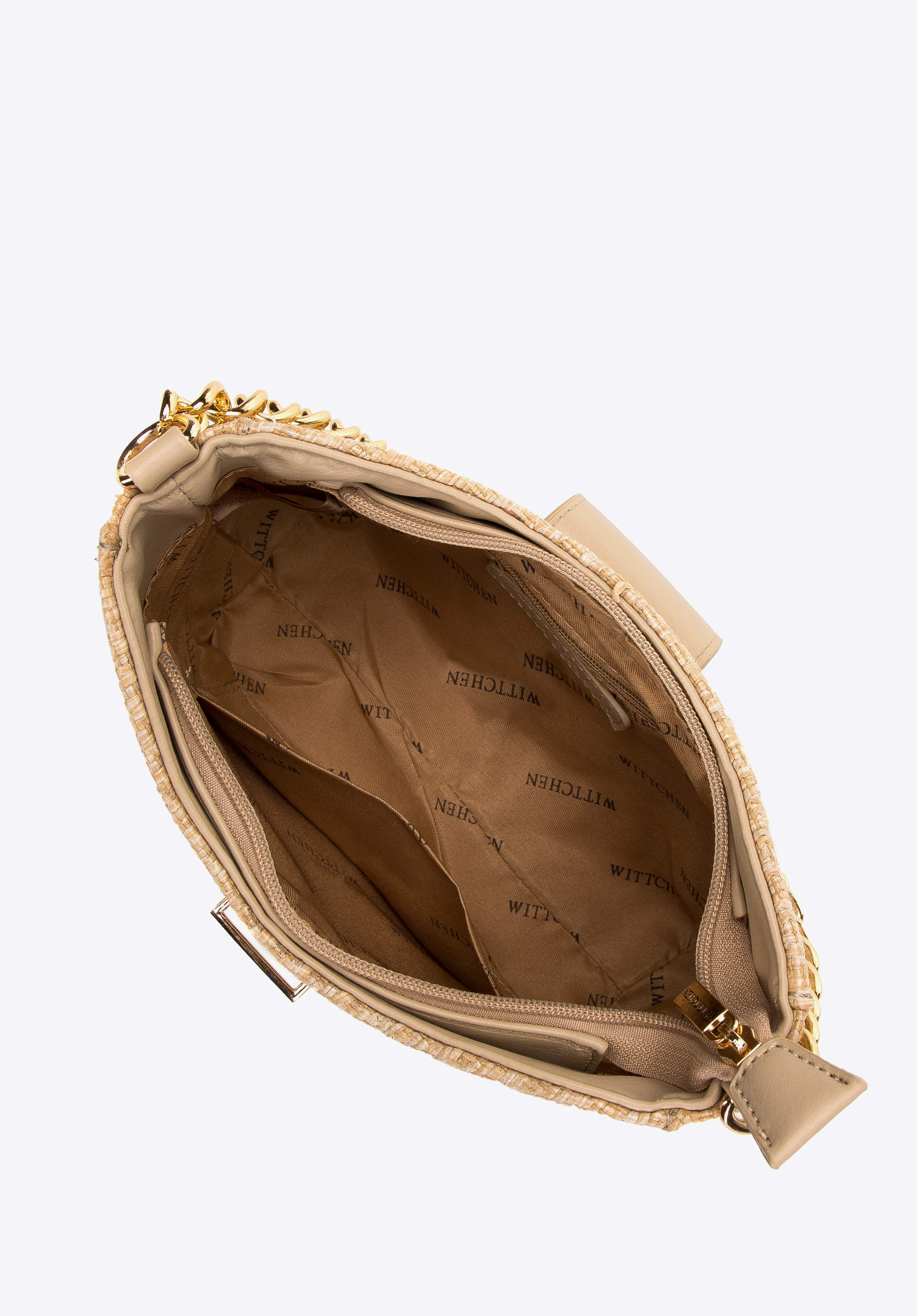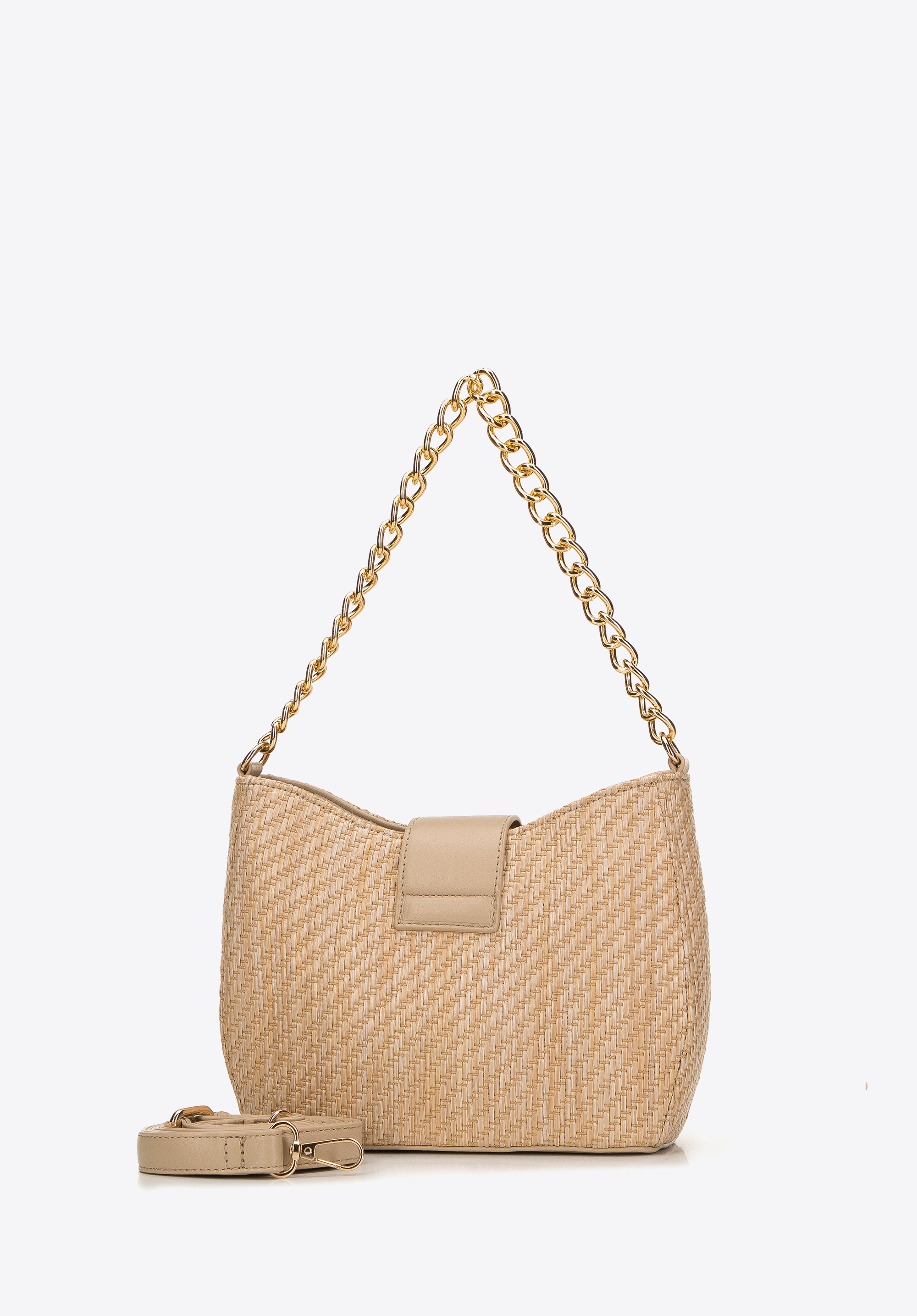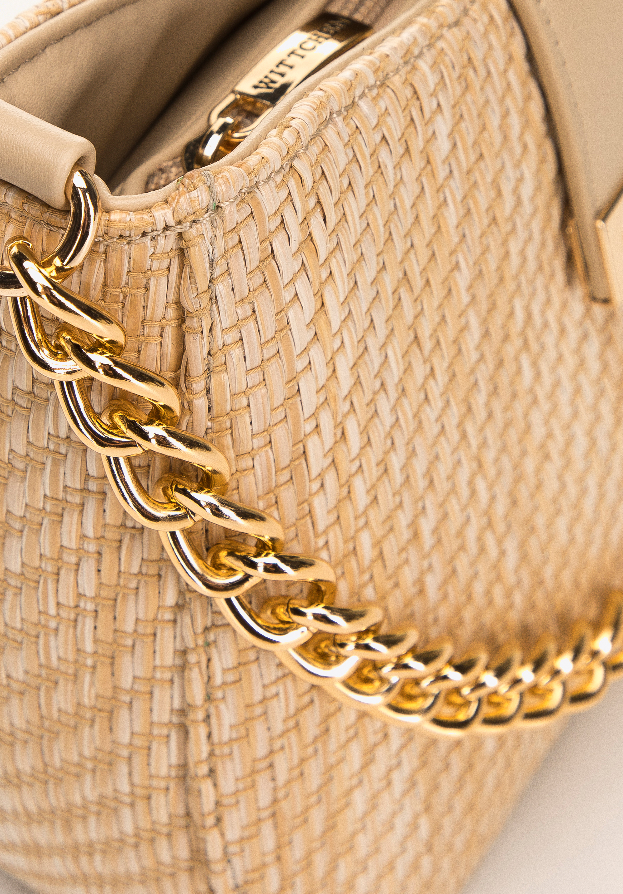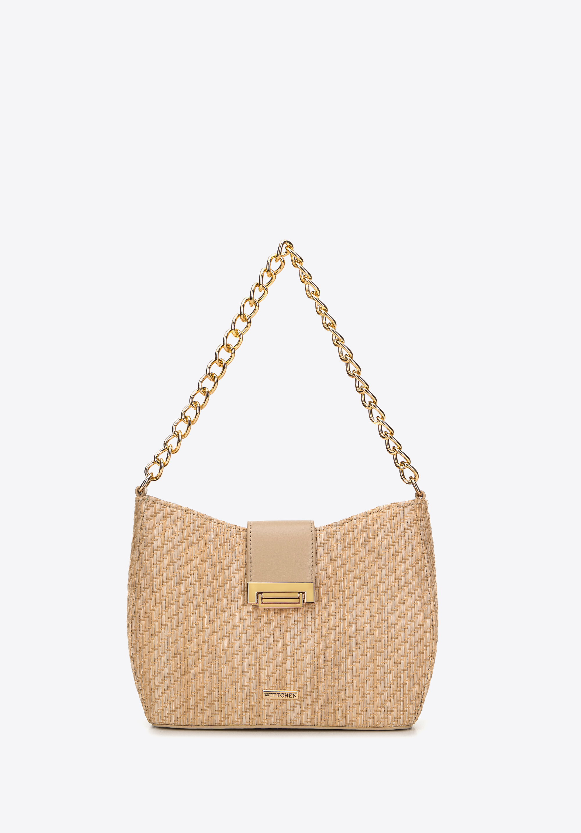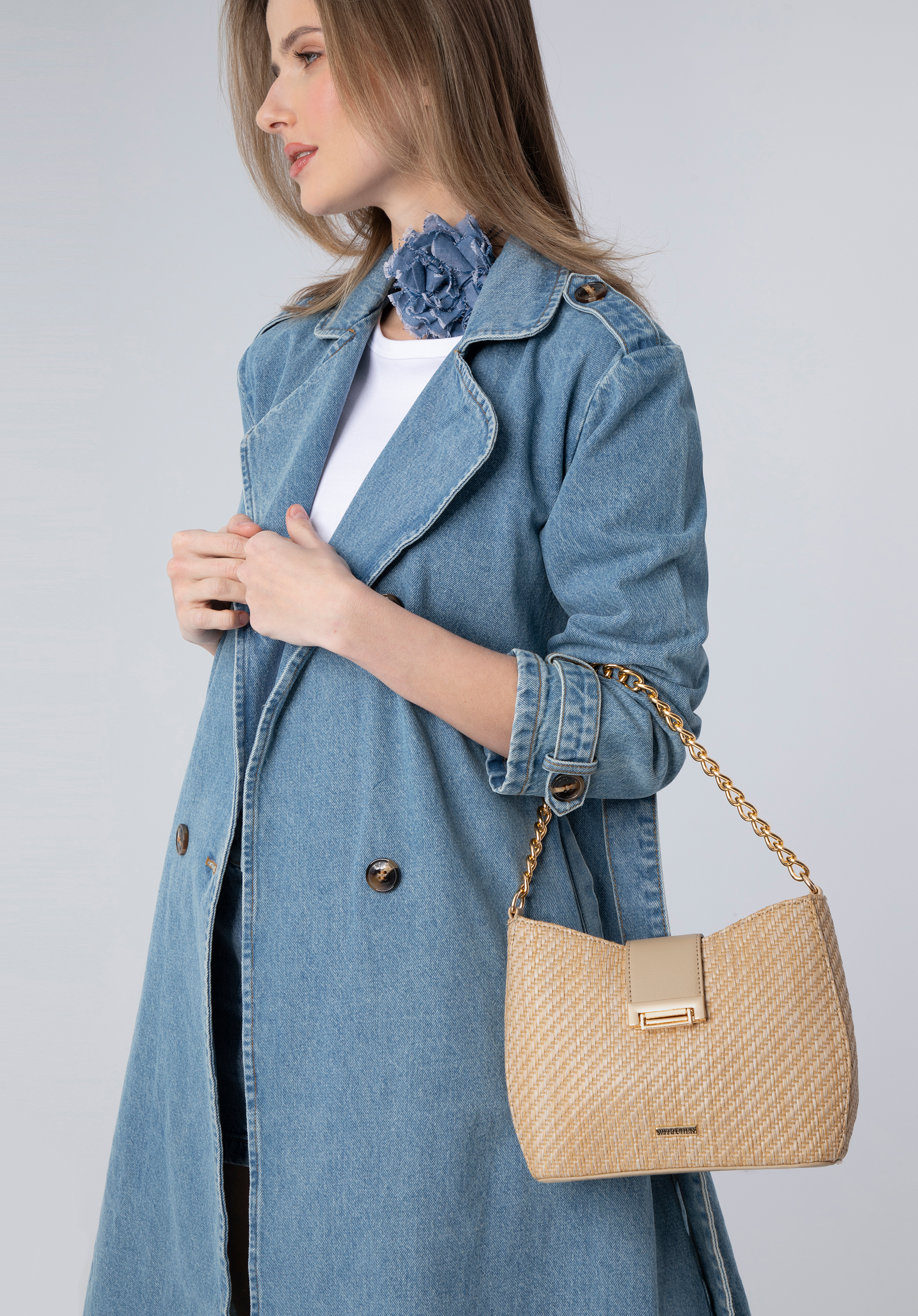 Ez a női baguette szabású kézitáska remek választás a divatos kiegészítők szerelmeseinek. Szalmára emlékeztető dekoratív fonatból készült. Tetszés szerint viselheted: csillogó rövid láncon vagy hosszú, állítható műbőr pánton. Középen egy dekoratív pánt található eredeti csattal, melynek köszönhetően még jobban rögzítve van a táska tartalma. Belsejében elfér egy pénztárca, telefon, néhány kozmetikai eszköz vagy akár egy pár kesztyű. Párosítsd koktélruhával vagy nyári ruhával, de farmer rövidnadrággal és pólóval is remekül fog mutatni. A láncos fonott baguette stílusú kézitáska remek választás nyaralásra és nyári partikra egyaránt.