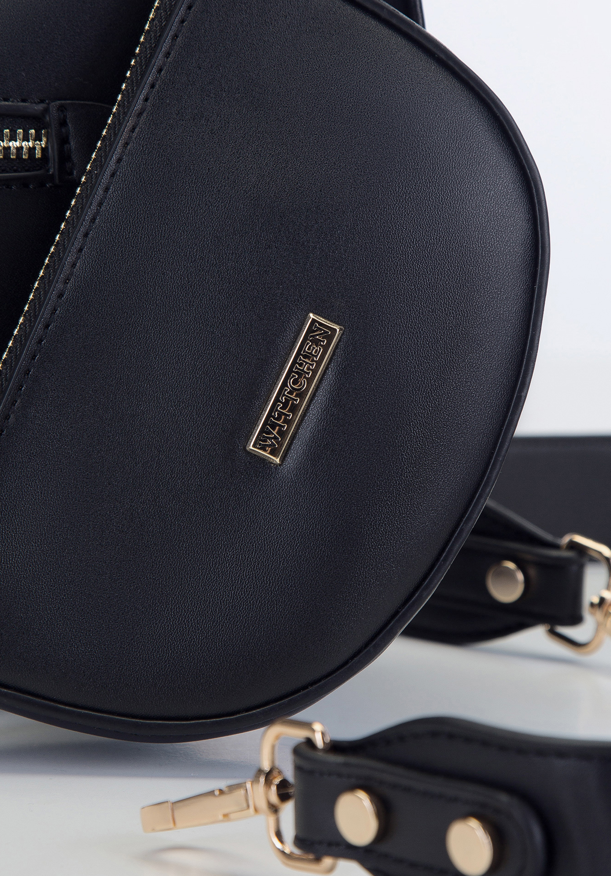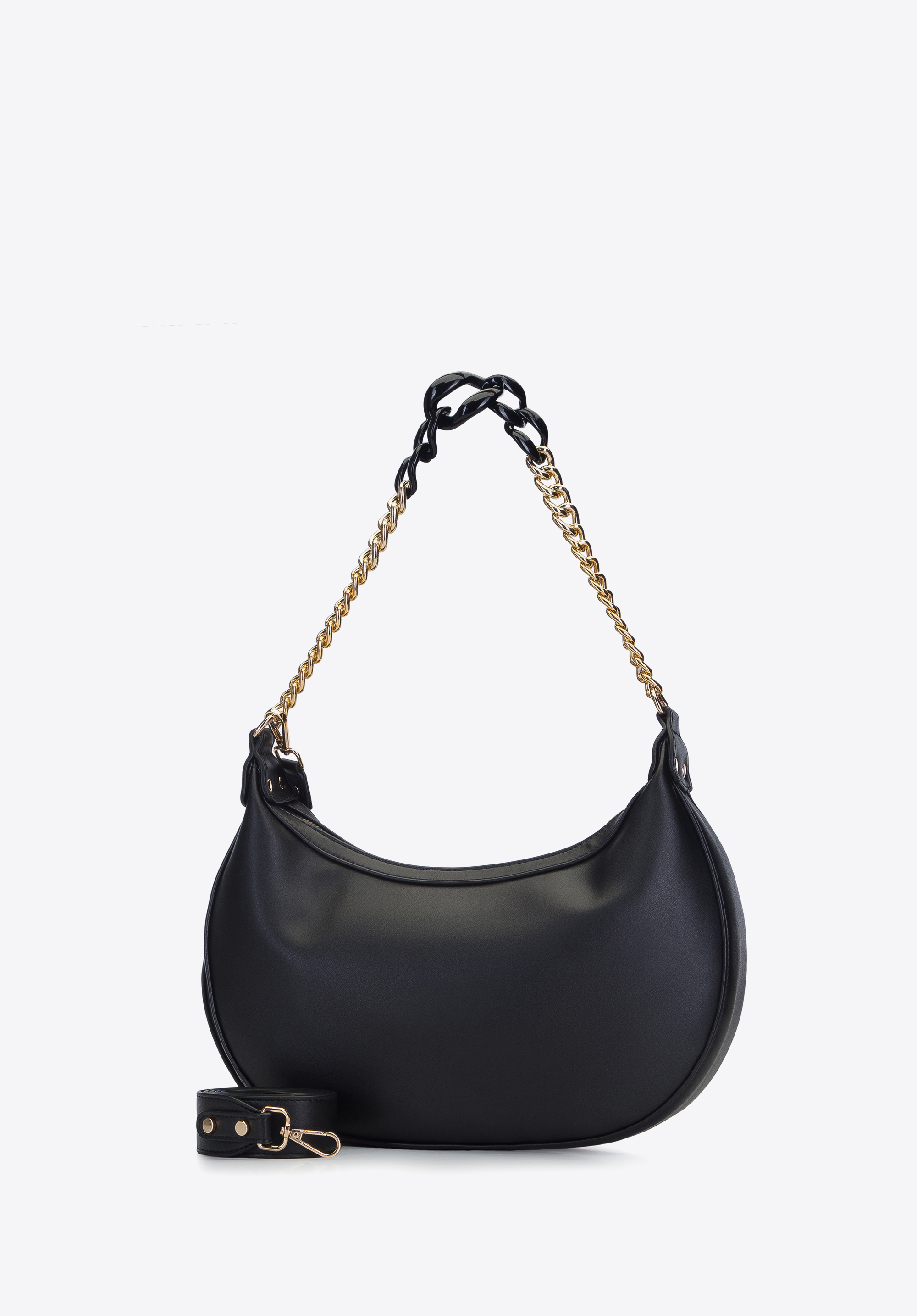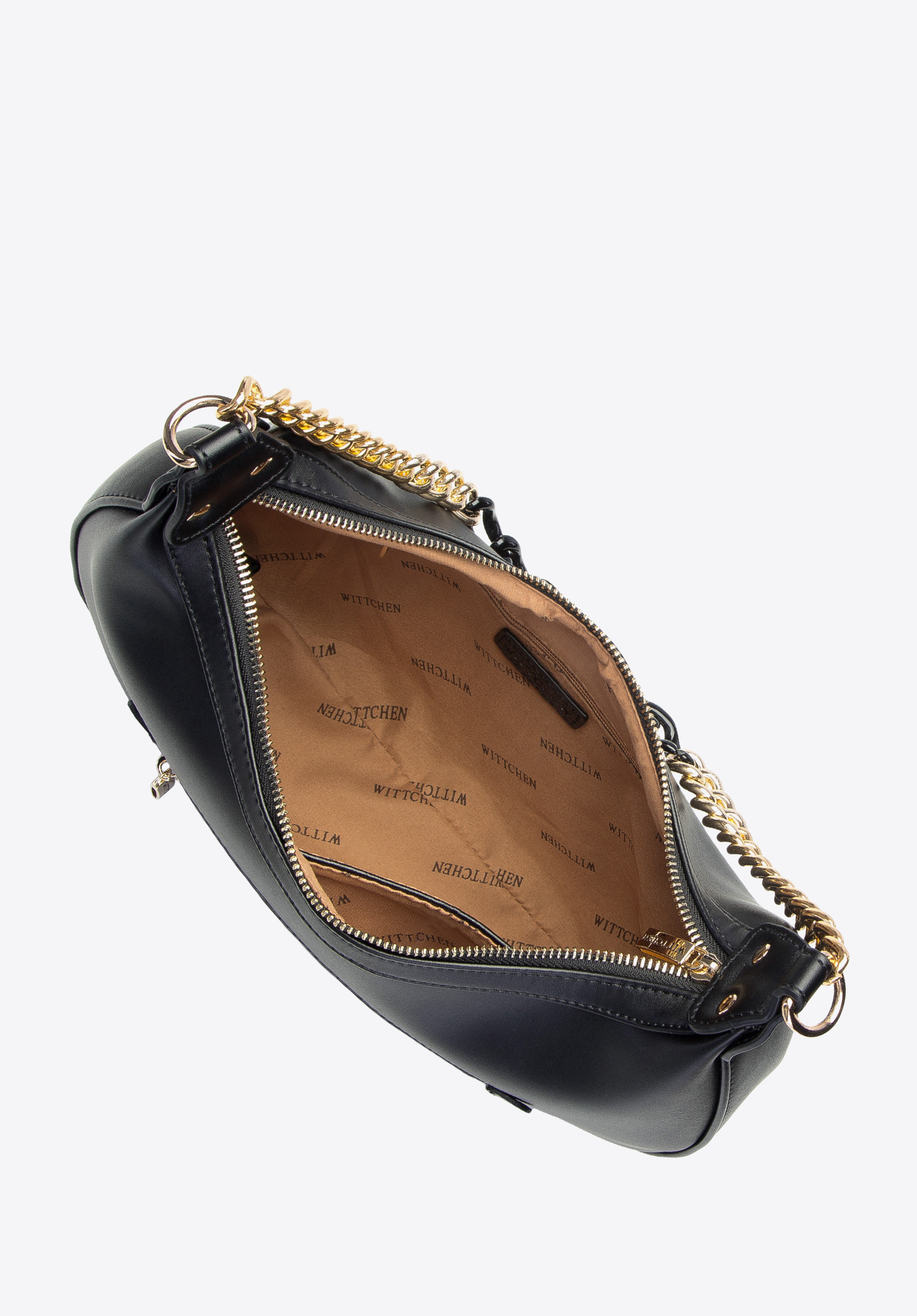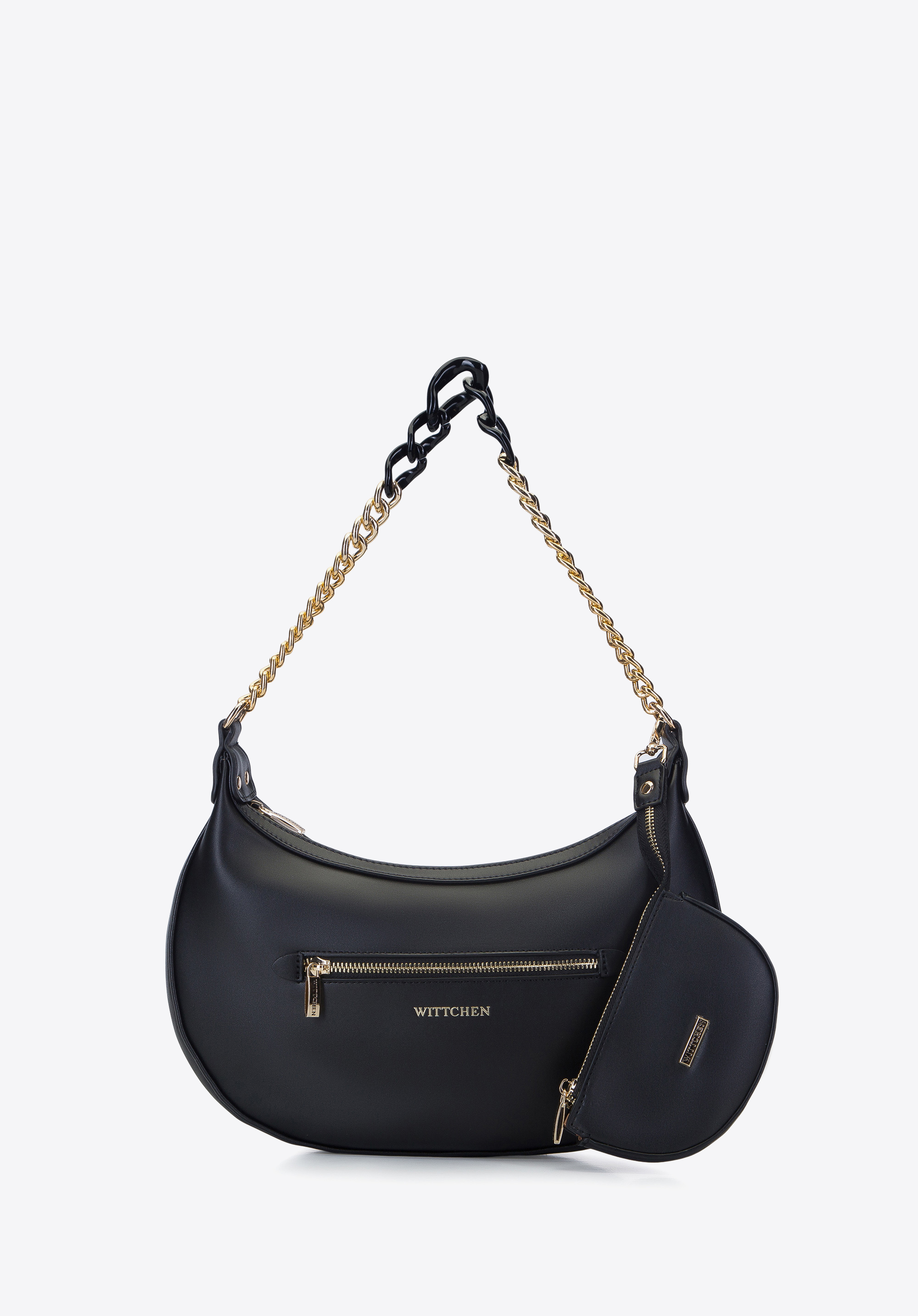 Rendkívül divatos női táska, amely stílust varázsol mindennapjaidba. A félhold formát különféle anyagokból készült láncokból álló, le nem vehető fül egészíti ki - a fémlánc vastagabb, műanyag láncszemekké alakul. A táska sima, kiváló minőségű ökológiai bőrből készült. Ez most a legdivatosabb anyag! Környezetbarát, elegáns megjelenésű és nagy tartósságú. A táska elejét az új "WITTCHEN" logó díszíti, szélesen elhelyezett betűkkel. Tartozik hozzá egy nagy, mágneses záródású tasak, ami pénztárcaként is használható. Ez a bagett táska egy stílusos városi modell, amely egyedivé teszi ruhatáradat.