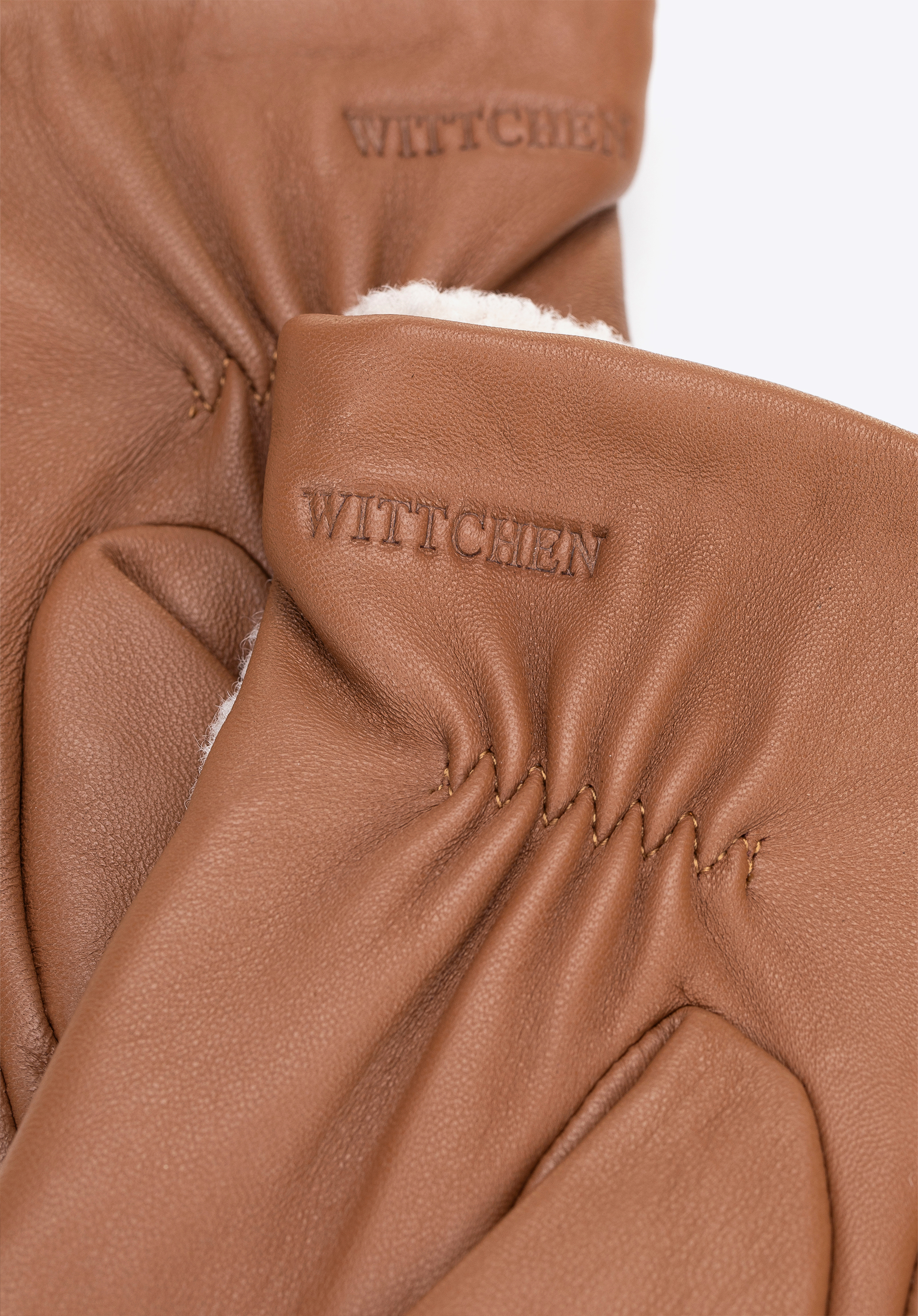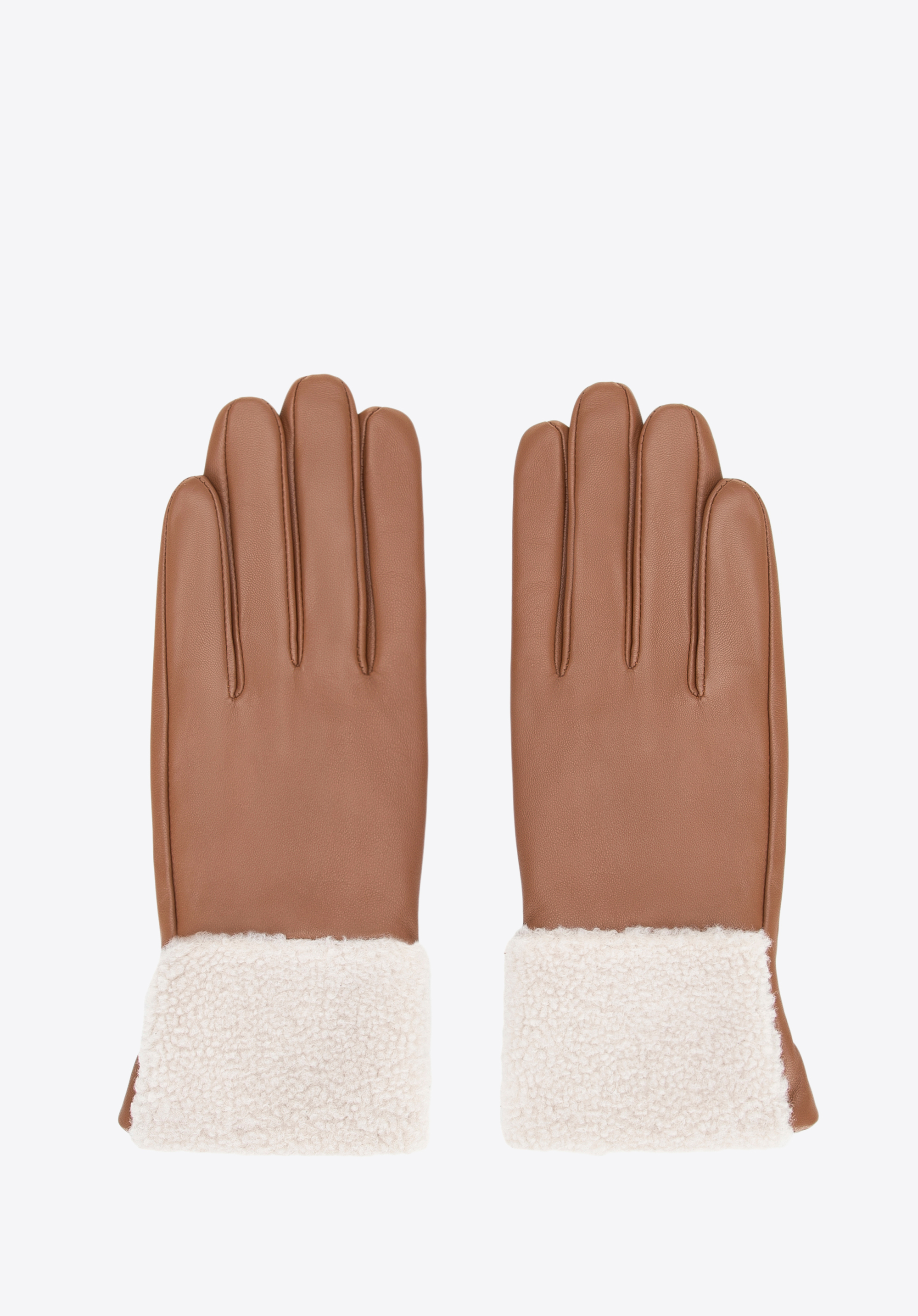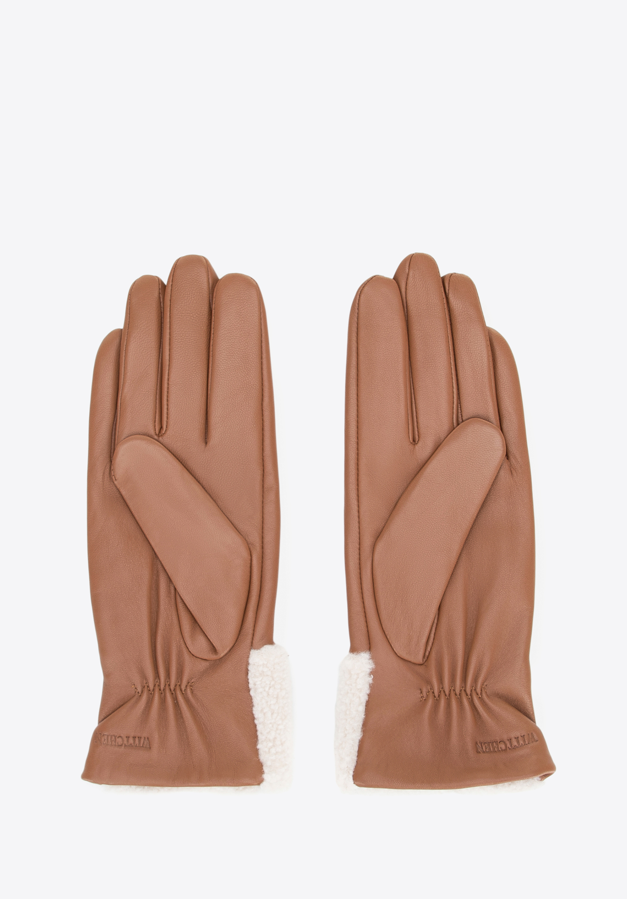 Női bélelt kesztyű díszes mandzsettával barnás-krémszínű