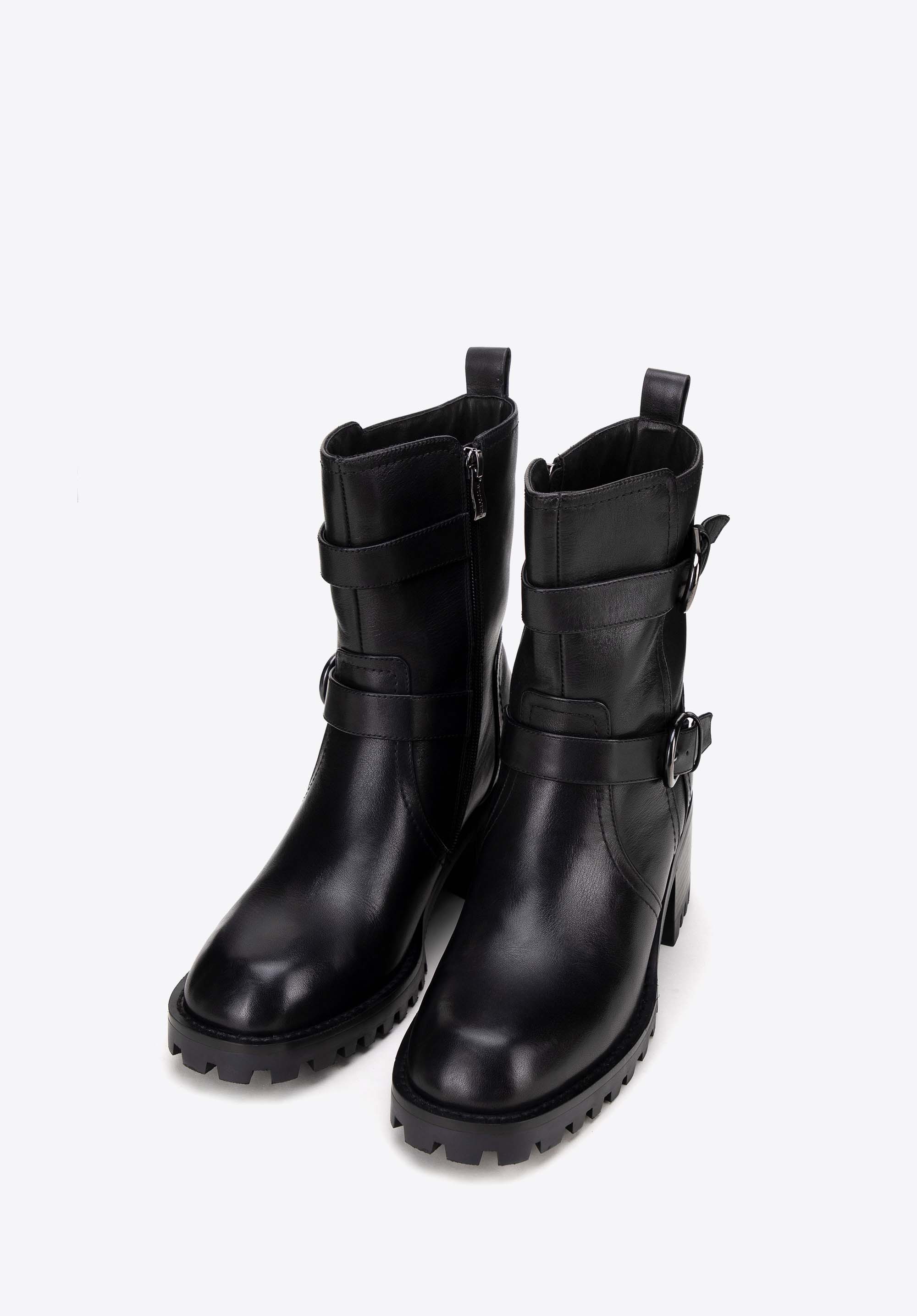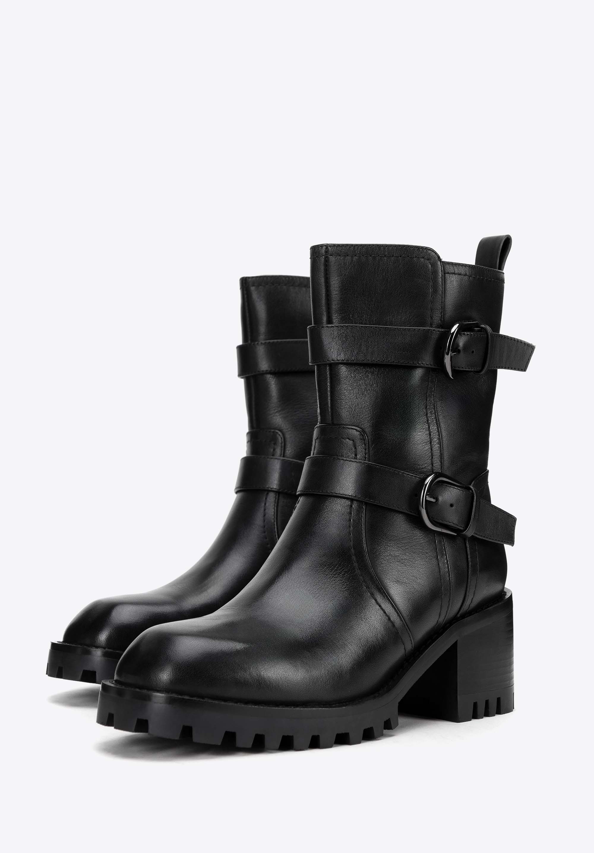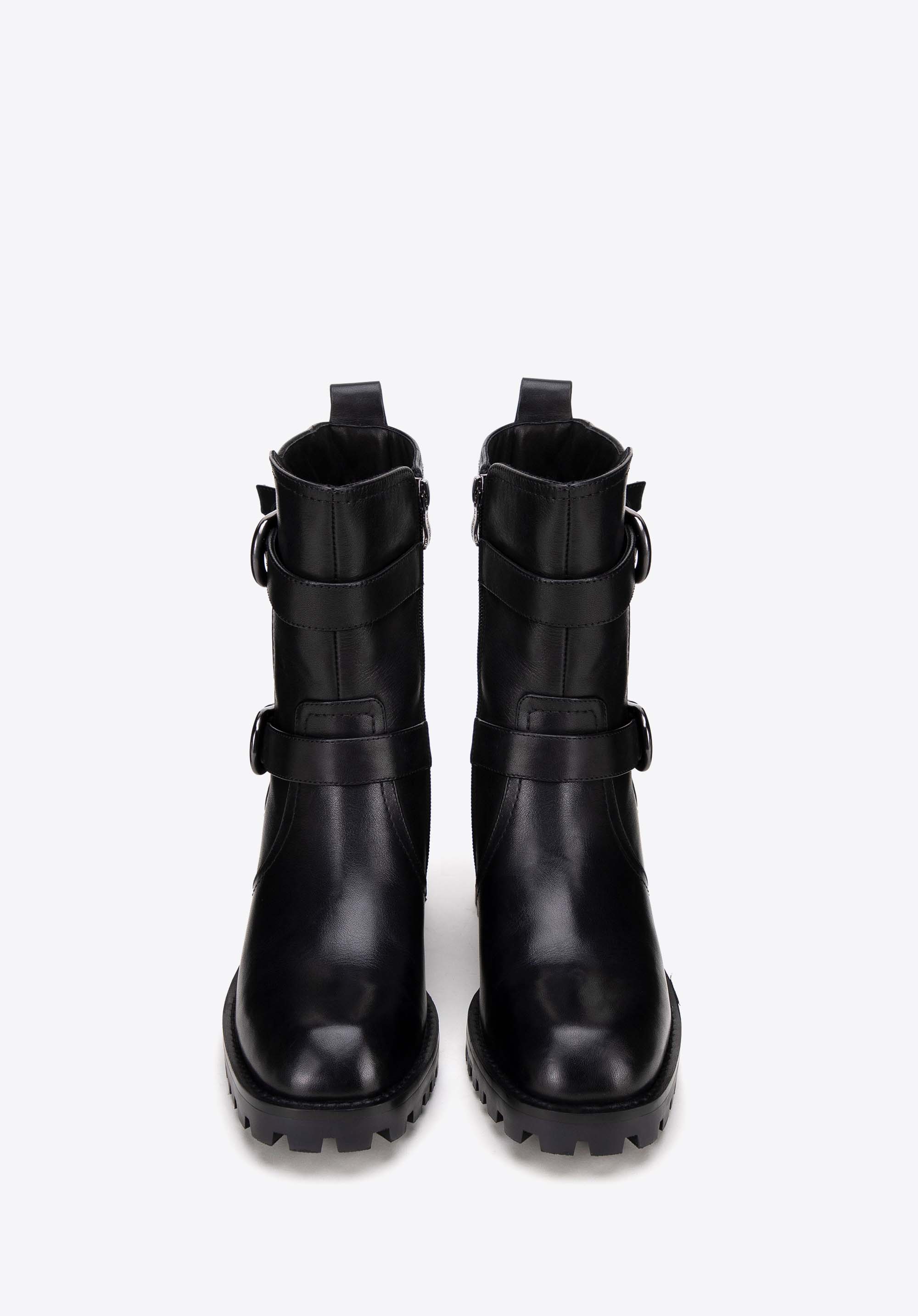 Ez a női bőrből készült, masszív magassarkú bakancs, tökéletes választás a stílus és a kényelem szerelmeseinek. A természetes bőrből készült cipő a tartósságot és az eleganciát ötvözi, modern dizájnja pedig bármilyen öltözékhez karaktert kölcsönöz. A talpa stabilitást és biztos lépést biztosít bármilyen felületen, így bármilyen alkalomra remek választás lehet. Az oldalsó cipzár biztosítja a könnyű felhúzást, míg a díszes, csattal ellátott pántok eredeti jelleget kölcsönöznek.