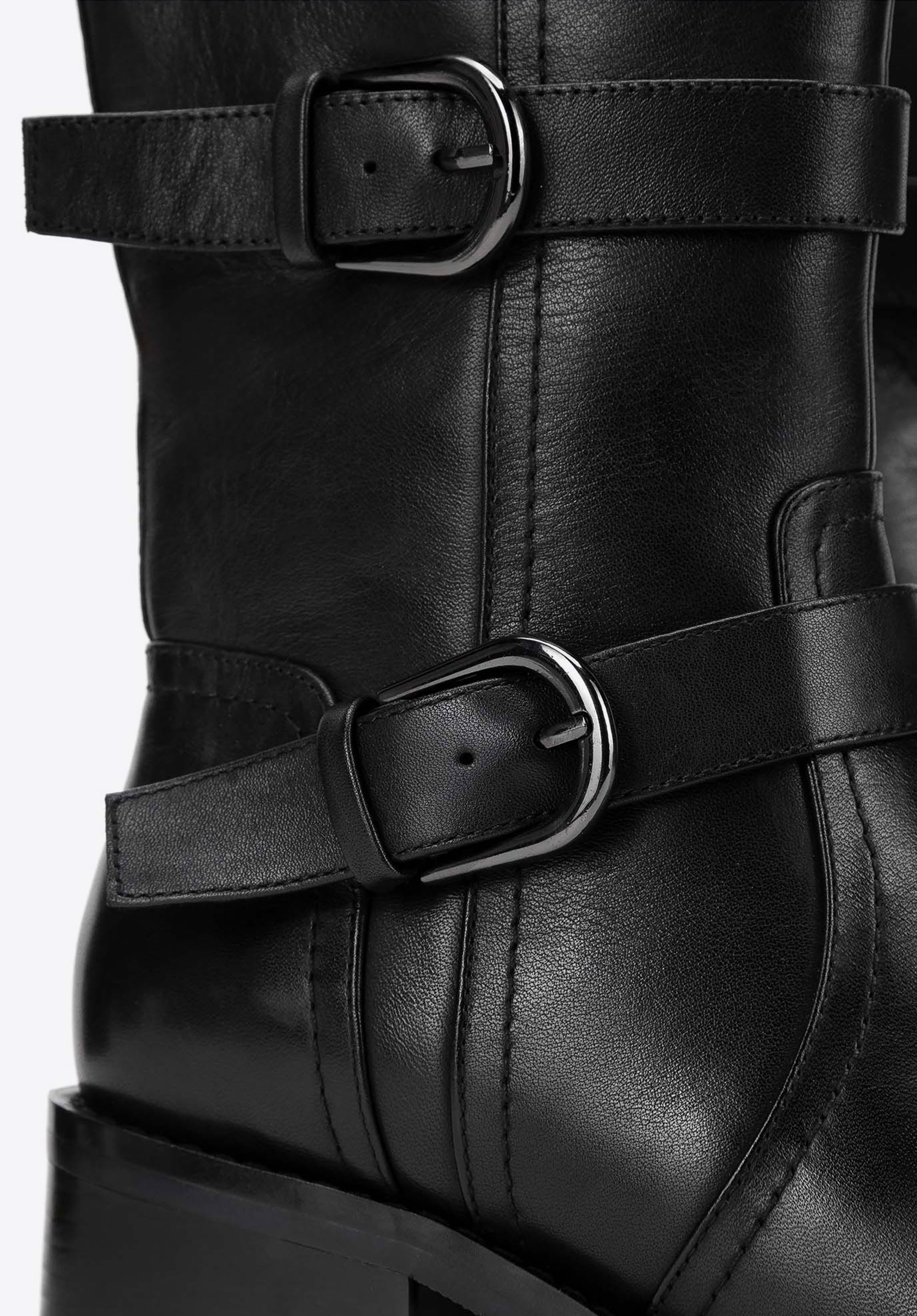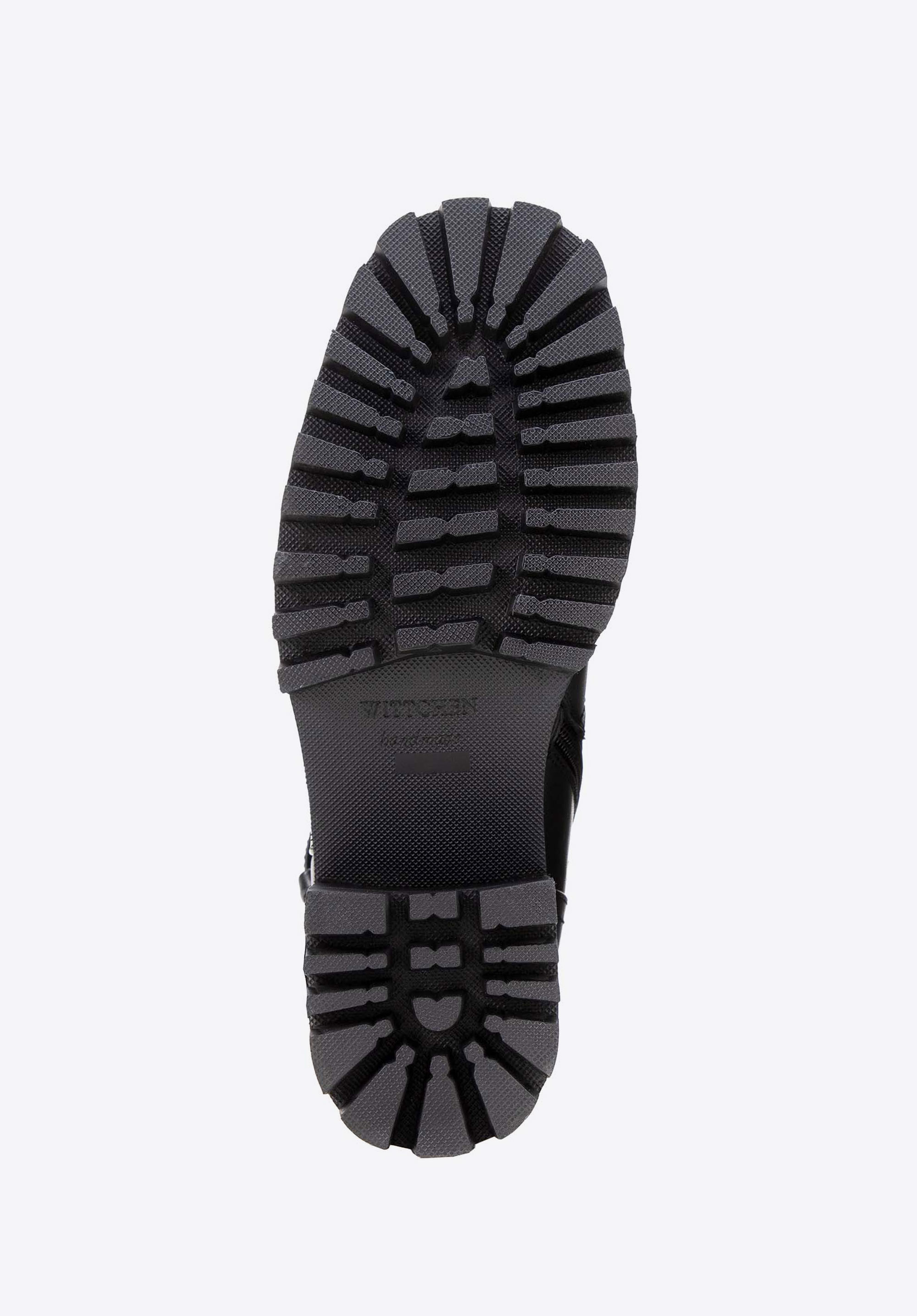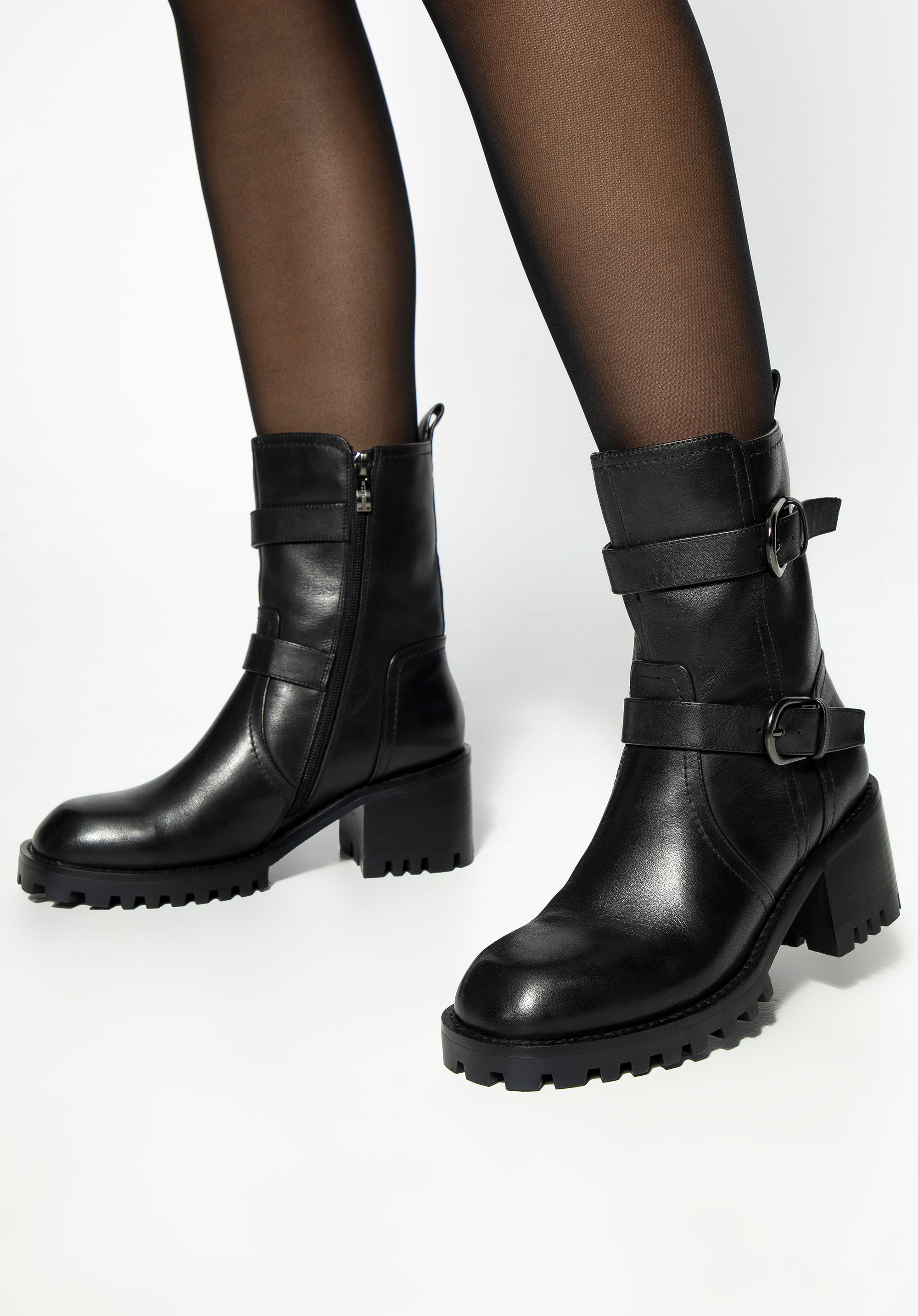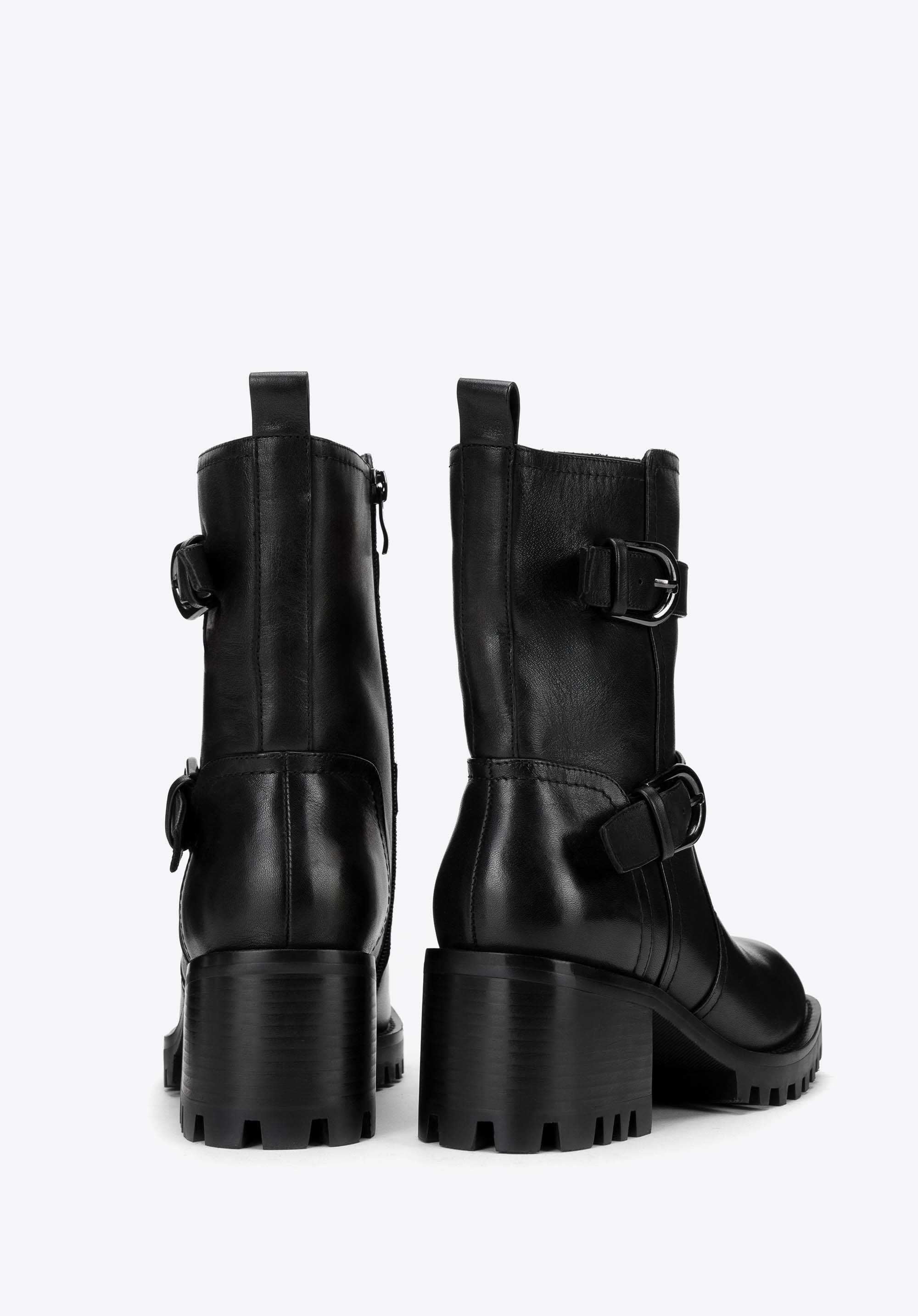 Ez a női bőrből készült, masszív magassarkú bakancs, tökéletes választás a stílus és a kényelem szerelmeseinek. A természetes bőrből készült cipő a tartósságot és az eleganciát ötvözi, modern dizájnja pedig bármilyen öltözékhez karaktert kölcsönöz. A talpa stabilitást és biztos lépést biztosít bármilyen felületen, így bármilyen alkalomra remek választás lehet. Az oldalsó cipzár biztosítja a könnyű felhúzást, míg a díszes, csattal ellátott pántok eredeti jelleget kölcsönöznek.
