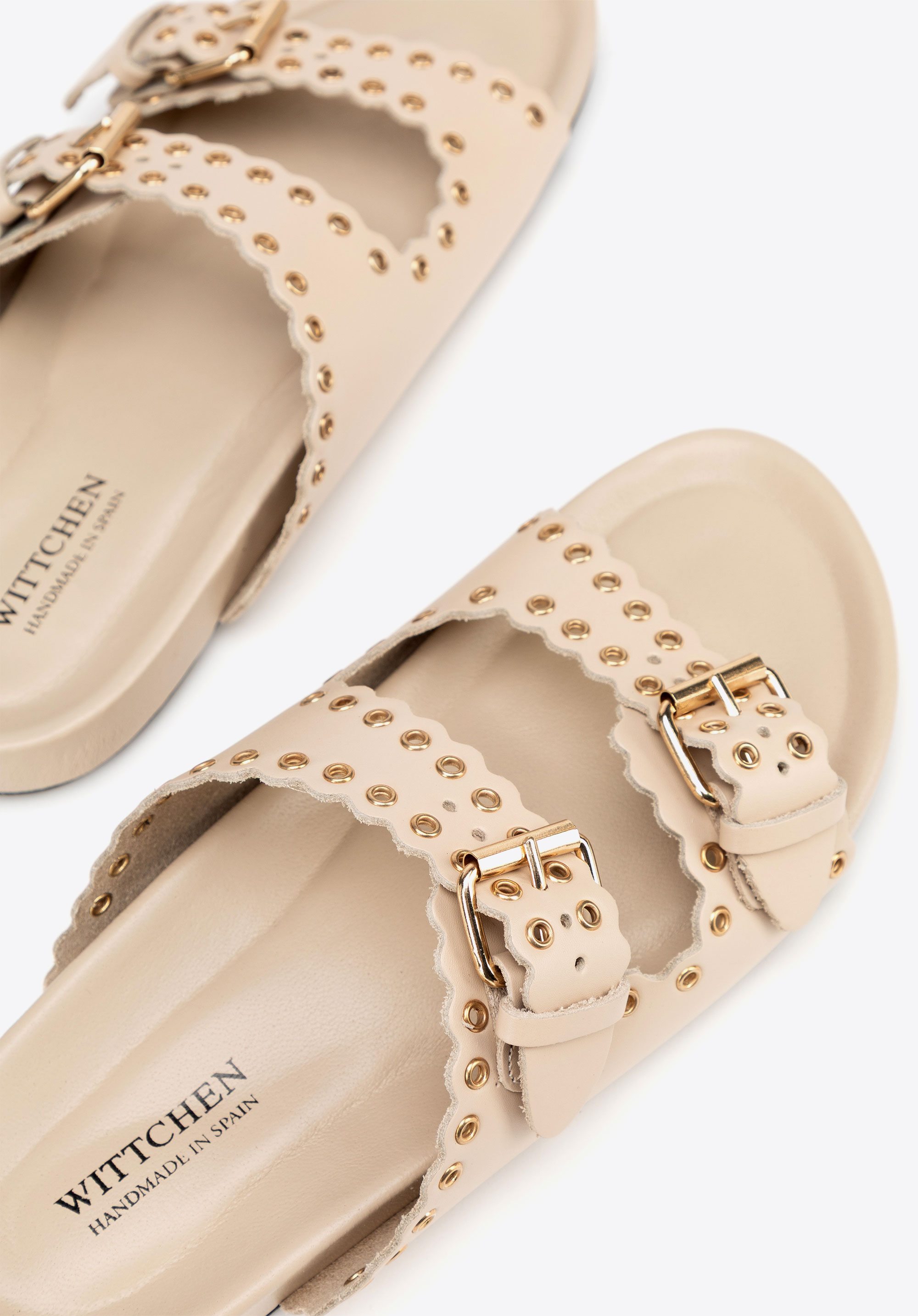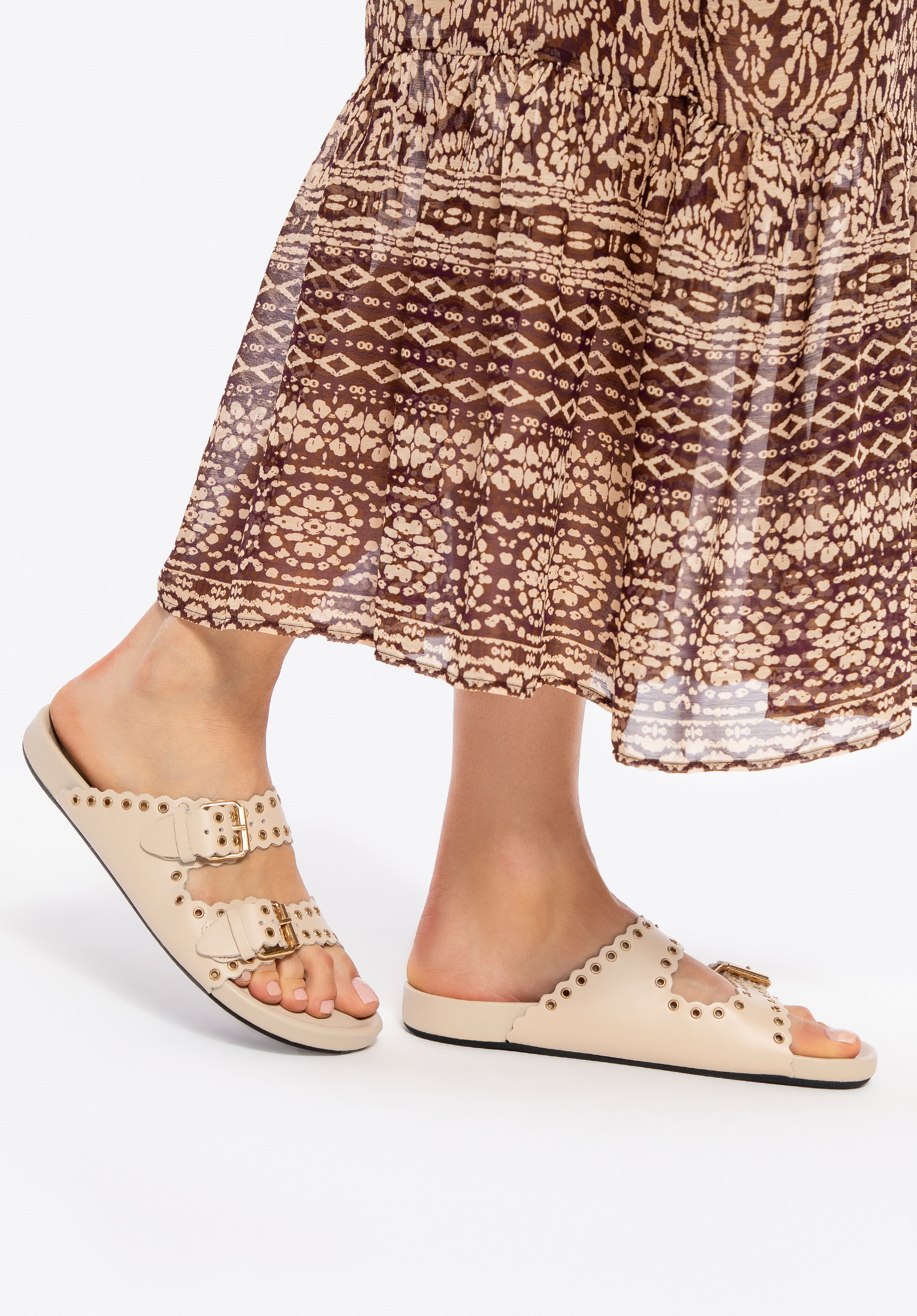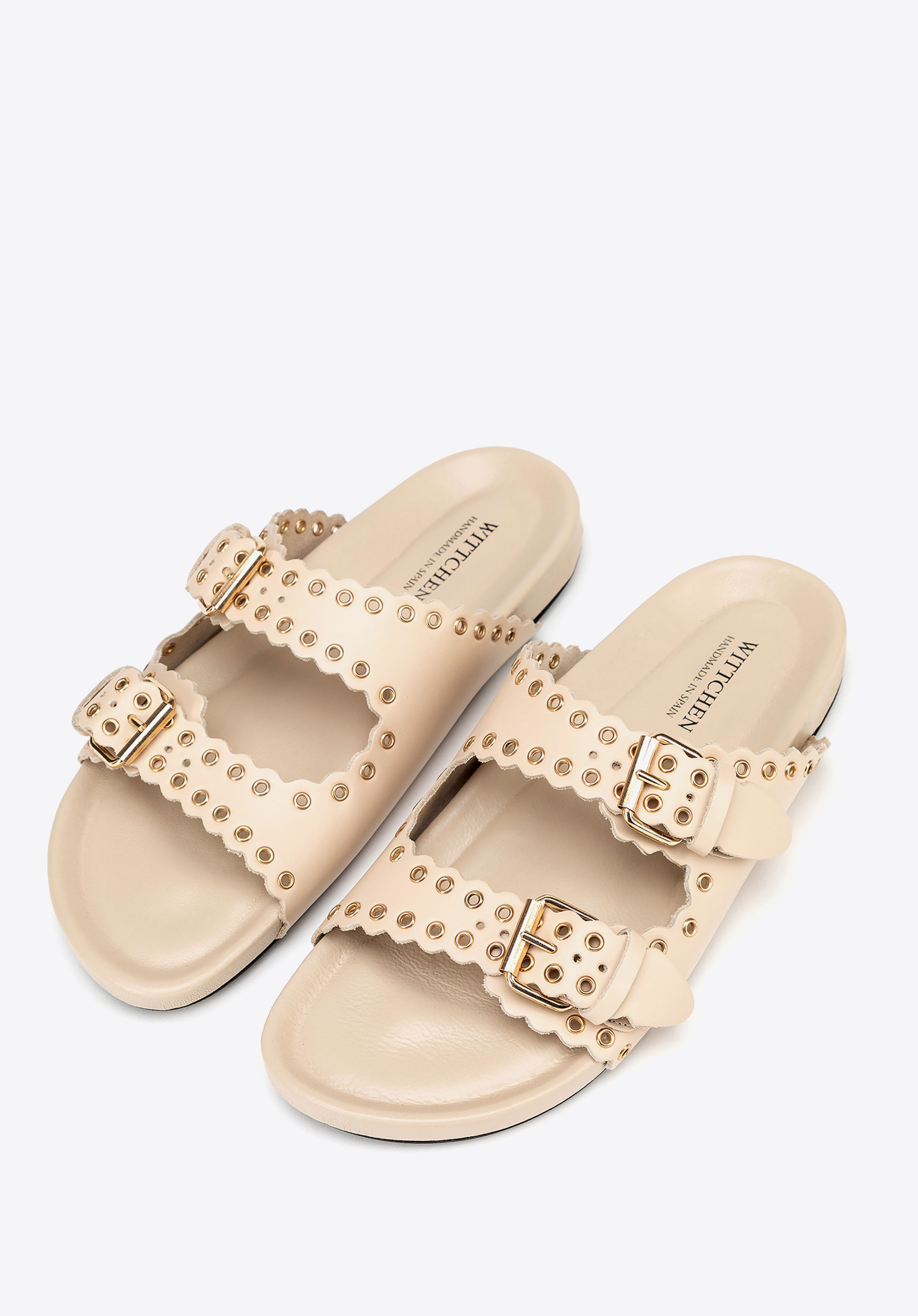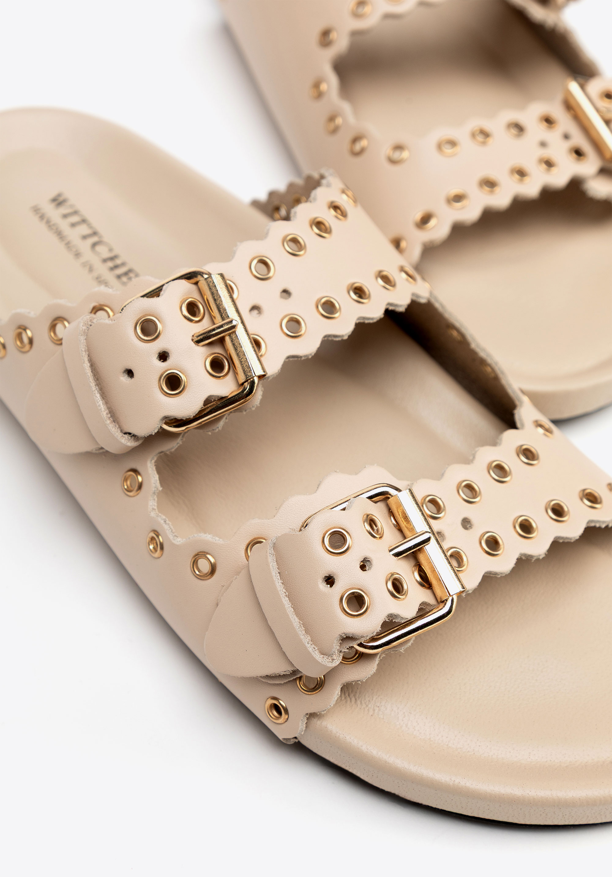Könnyű, nőies és karakteres – ez anői papucstökéletes választás a meleg napokra! Spanyolországban készült, természetes bőrből, a finom eleganciát a könnyed nyári stílussal ötvözi. Egyedülálló dizájnja két széles, fém részletekkel díszített pánttal rendelkezik, amelyek jellegzetes megjelenést kölcsönöznek a lábbelinek. Az állítható csatok tökéletes illeszkedést biztosítanak, a felcsúsztatható konstrukció pedig hihetetlenül könnyű viseletet garantál. A lekerekített orr finoman megnyújtja a lábat, míg a puha bélés és a talpbetét egész napos kényelmet jelent.