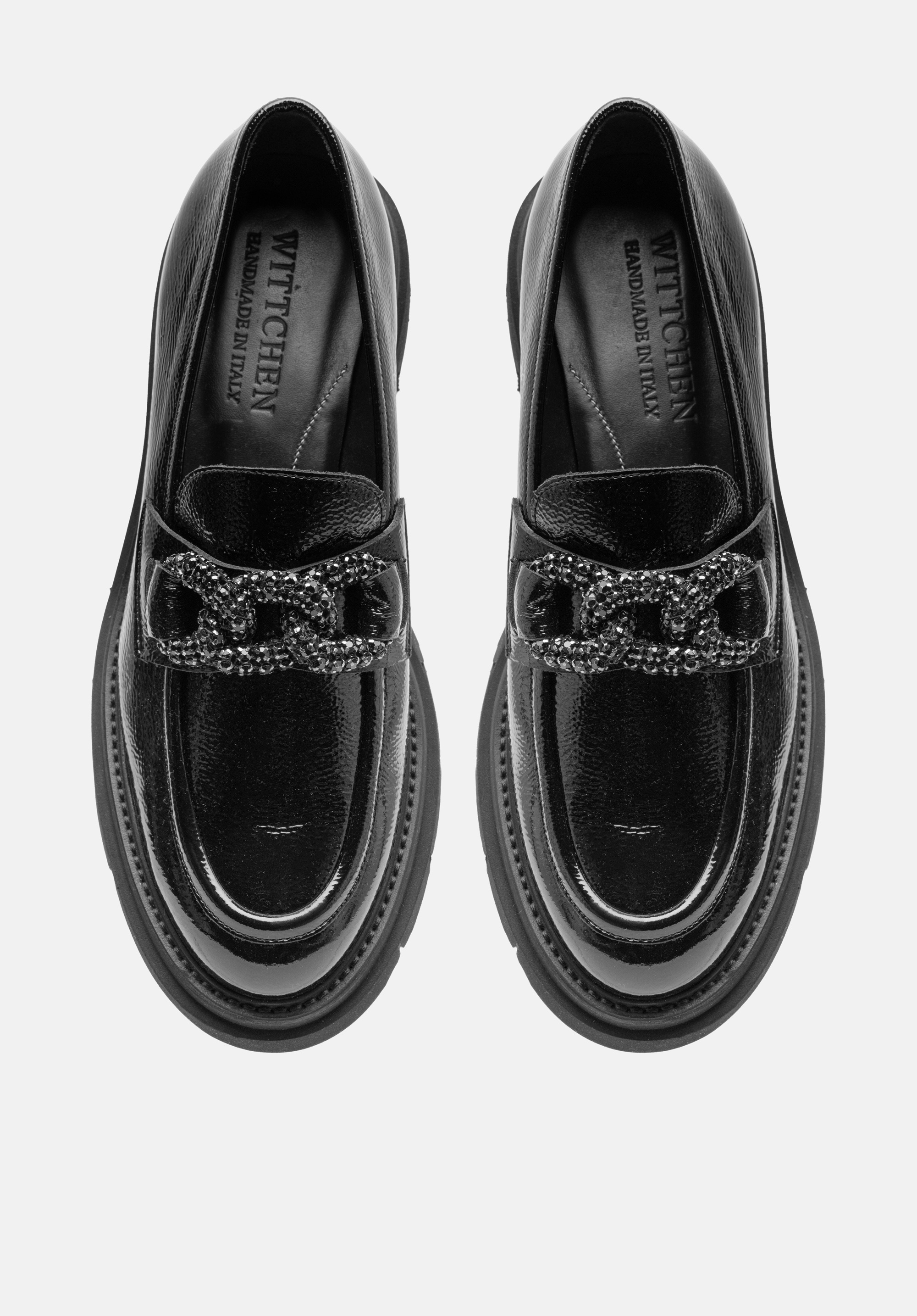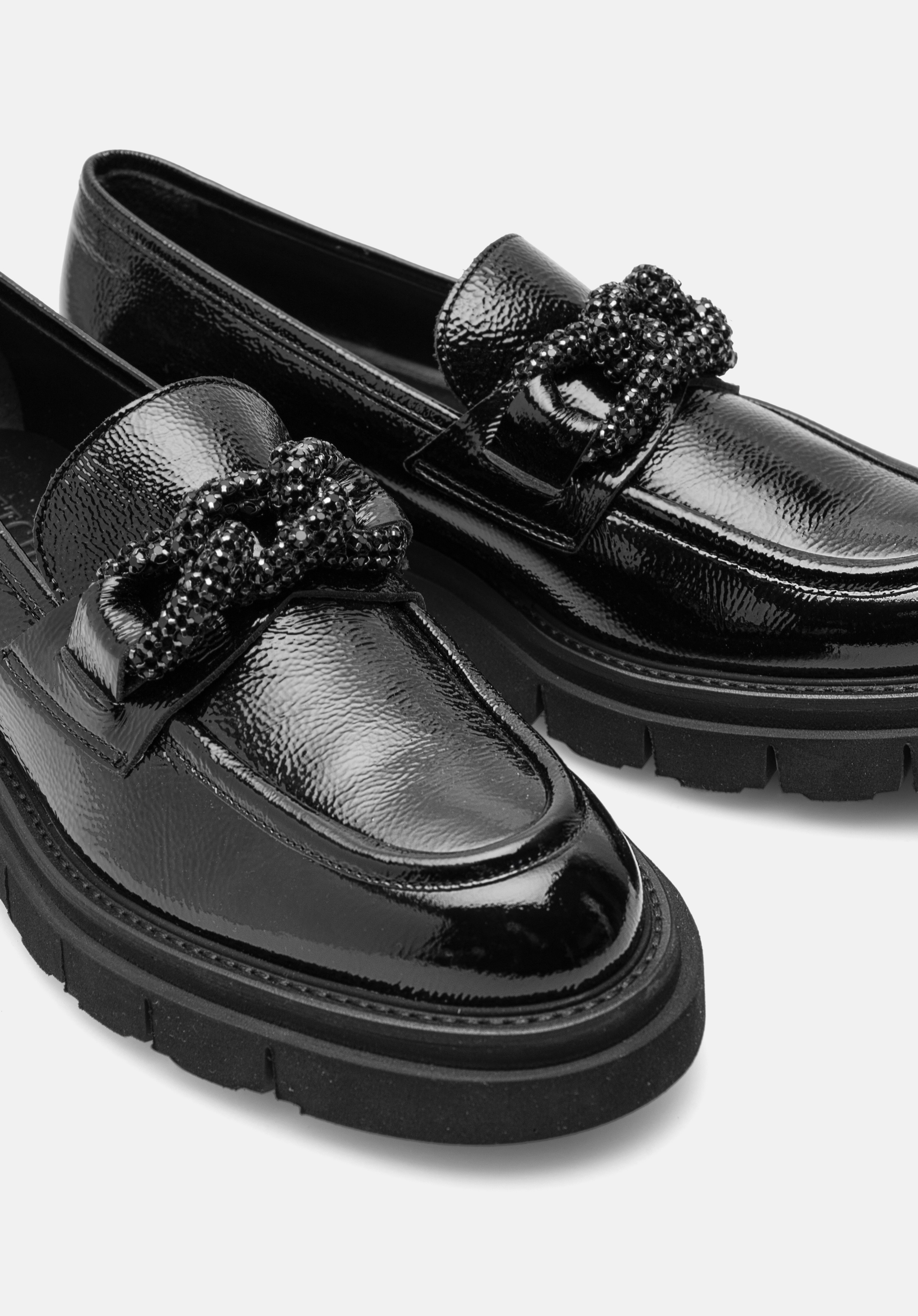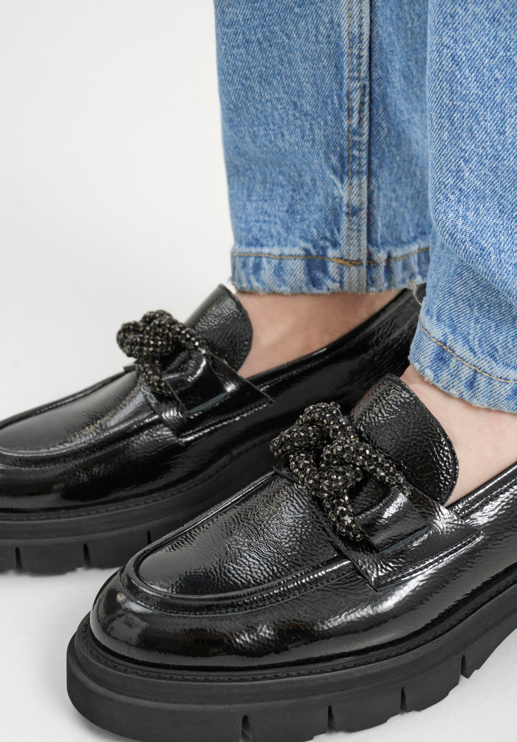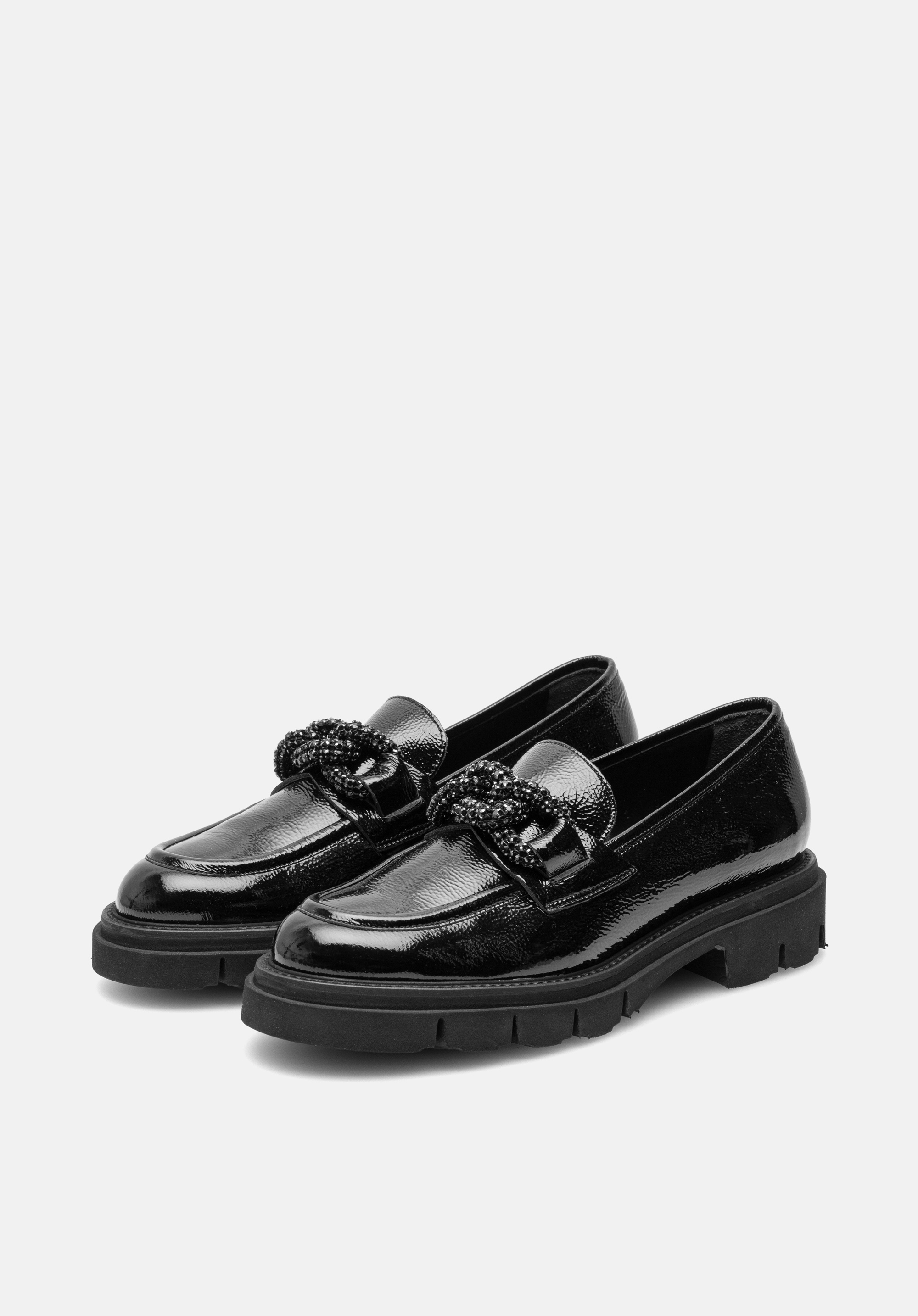 Ha ebben a szezonban csak egy pár cipőt kell vásárolnia, legyen az a Prestige termékcsalád bőr mokaszinja . Az alacsony sarkú, szabványos talpat vastag talpra cserélték. A legjobb minőségű lakkbőrből készült cipők elegáns stílussal büszkélkedhetnek. A mokaszin jellegzetessége a magasított varrás, amely a lábujj mentén fut, ezt a dizájnt egy vastag láncpánt is díszíti a lábfejen. A puha bélésű bőr talpbetét tökéletes viselési kényelmet biztosít még hosszú séták során is. Ezek a női bőr mokaszinok a szemet gyönyörködtető vonzerőről szólnak.