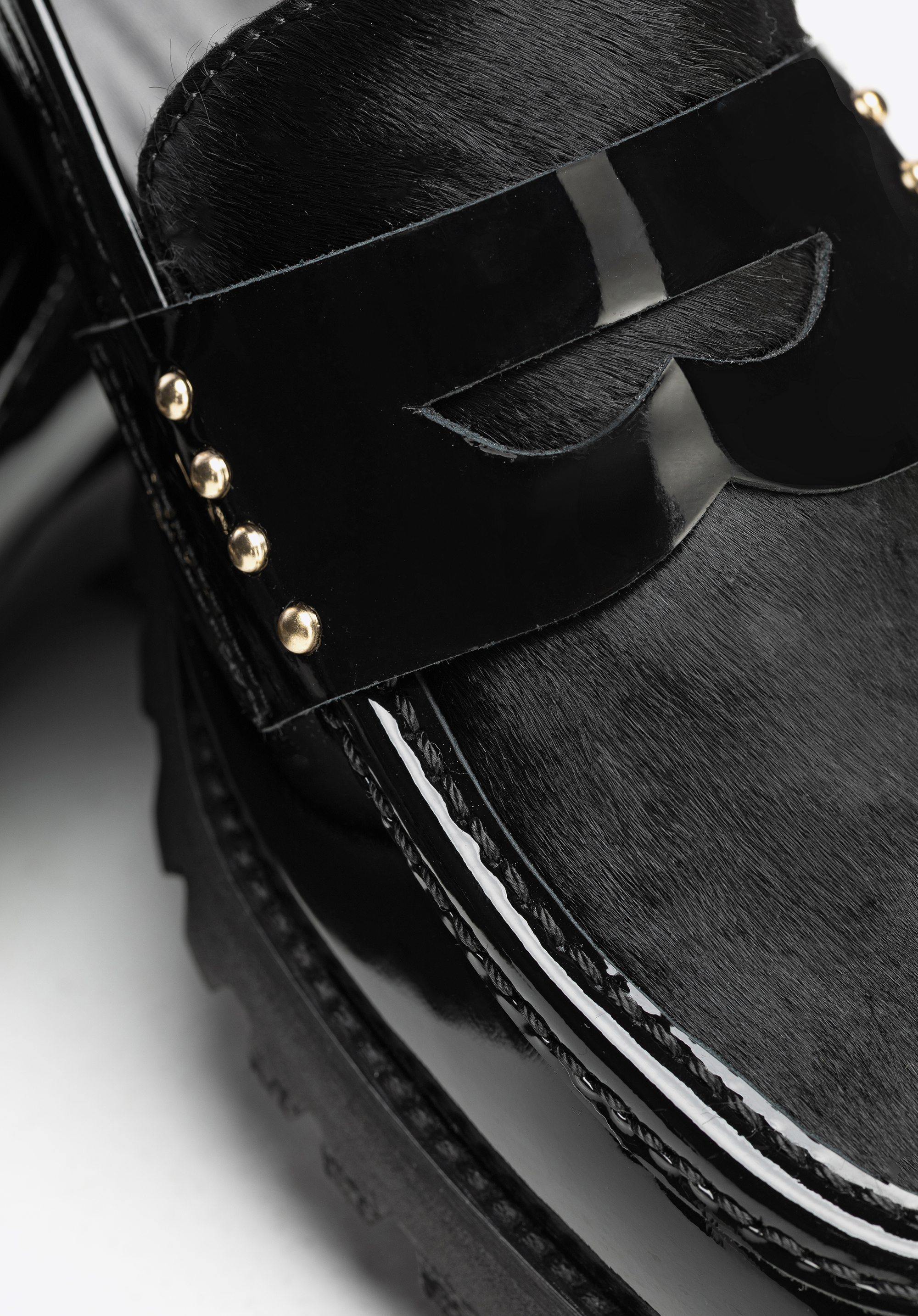 Ez amokaszin a klasszikus eleganciát szemet gyönyörködtető részletekkel ötvözi. A lakkbőr és a természetes szőr kombinációja feltűnő textúrák kontrasztját hozza létre, igazán jellegzetes karaktert kölcsönözve ennek a cipőnek. A lekerekített orr finomítja a formavilágát, míg a díszes szegecsek finom csillogást kölcsönöznek. A bőr bélés és talpbetét egész napos kényelmet nyújtanak, a gumi külső talp pedig rugalmasságot és tapadást biztosít minden felületen.
