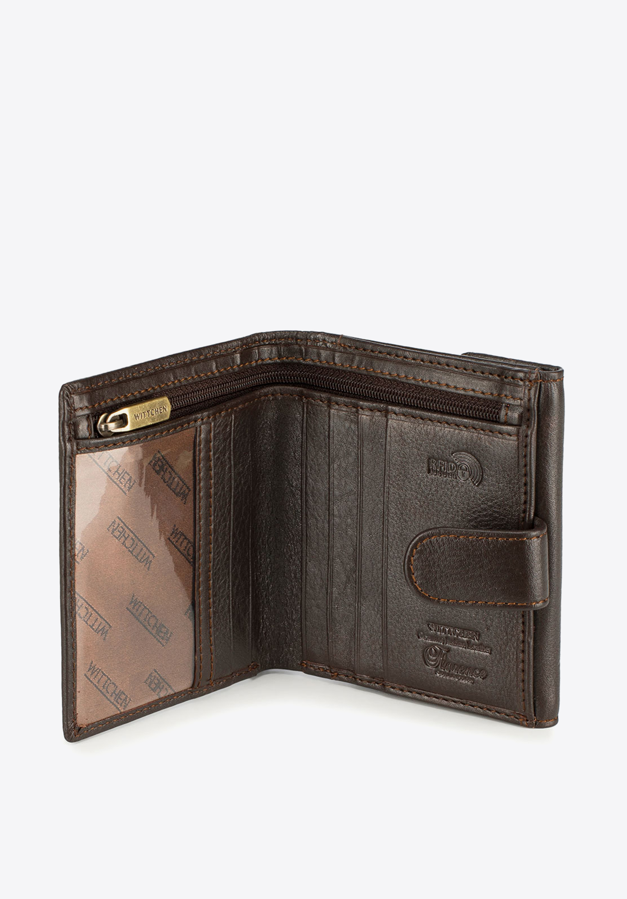 Közepes méretű univerzális pénztárca, puha borjúbőrből. Logó - WITTCHEN bőr dombornyomású címer.