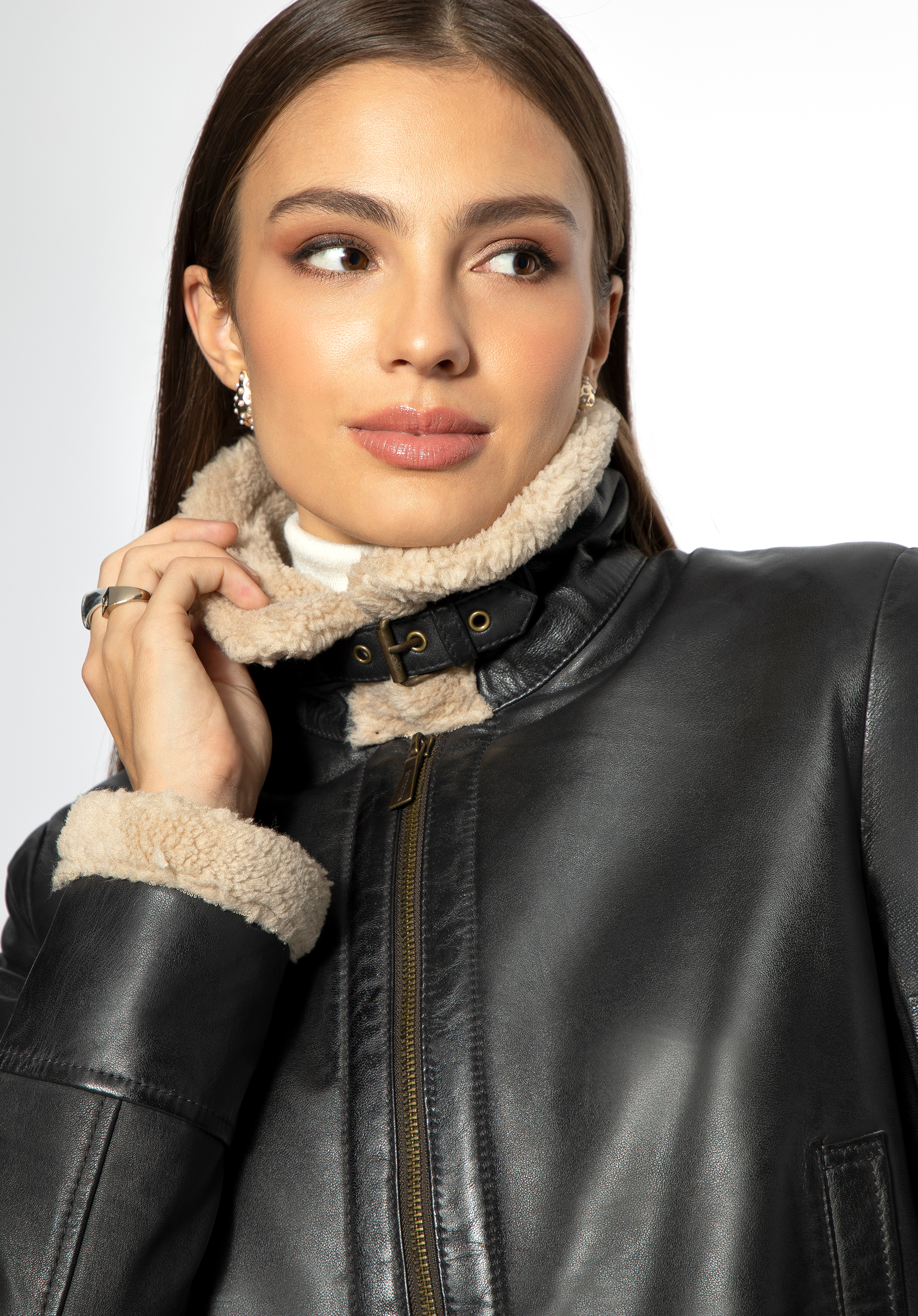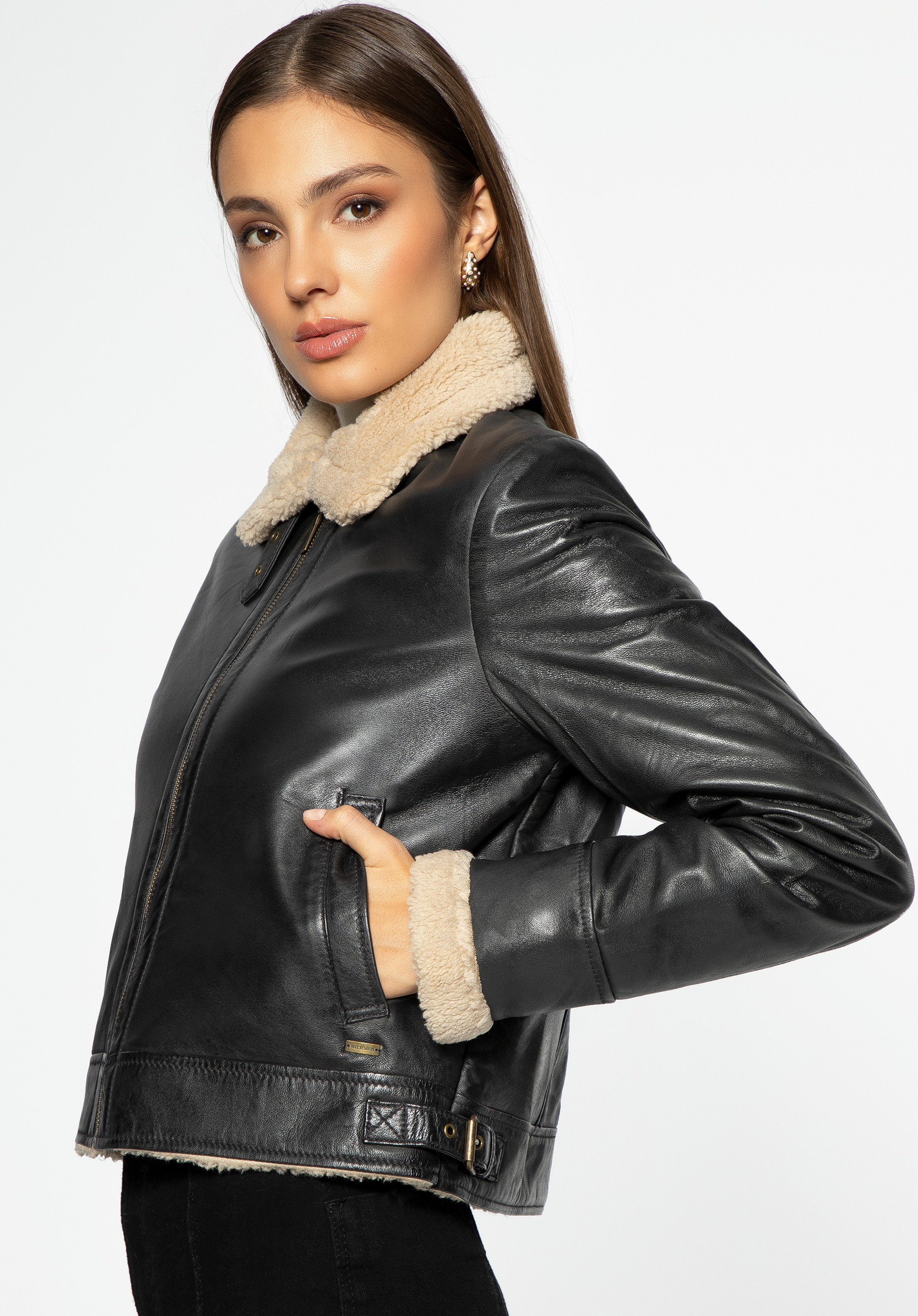 Ez a női kabát eredeti kiegészítő, amelyet érdemes bevinni a ruhatáradba. A divatos, rövid szabás kiváló minőségű természetes bőrből készült . A műszőrme bélés nagyon kellemes tapintású. Az egészet oldalzsebek egészítik ki, ahová a hidegebb napokon is teheted a kezed. Szélességét az oldalsó csatok segítségével állíthatod be. A gallért felemelheted és egy csatos övvel rögzítheted, ami megvédi a nyakadat a hidegtől. Viseld kedvenc túlméretezett pulóvereddel és farmeroddal vagy egy kötött ruhával – stílusosan fogsz kinézni minden helyzetben. Ősszel és tavasszal hasznos lesz ez a rövid, műszőrmével bélelt női bőr pilótadzseki.