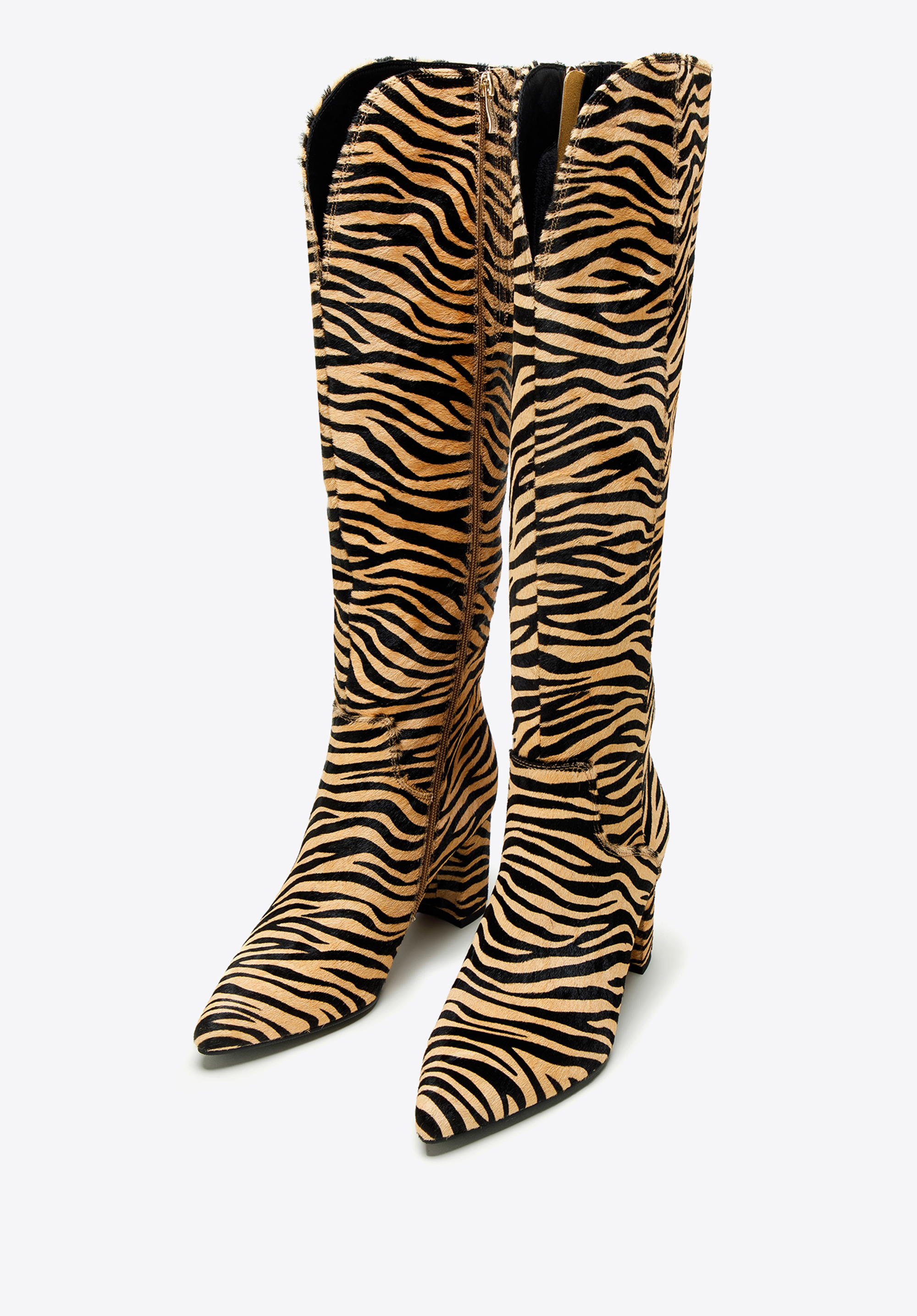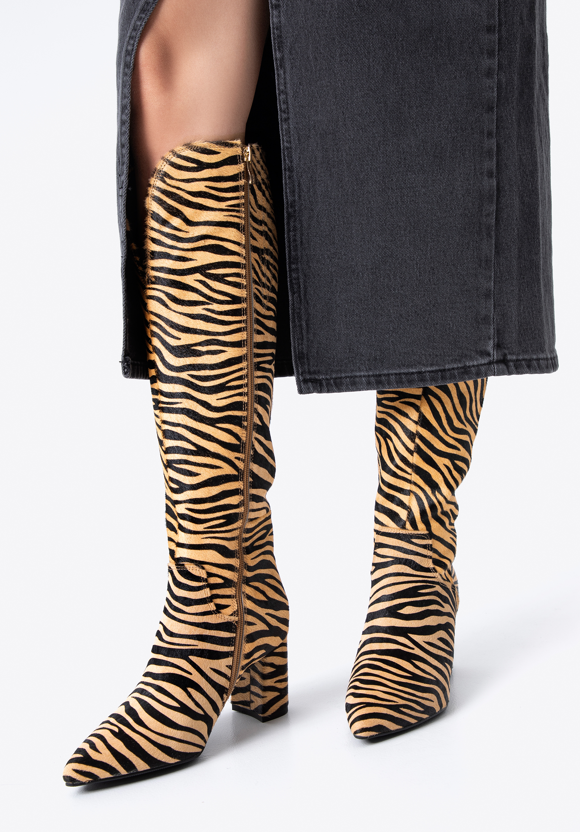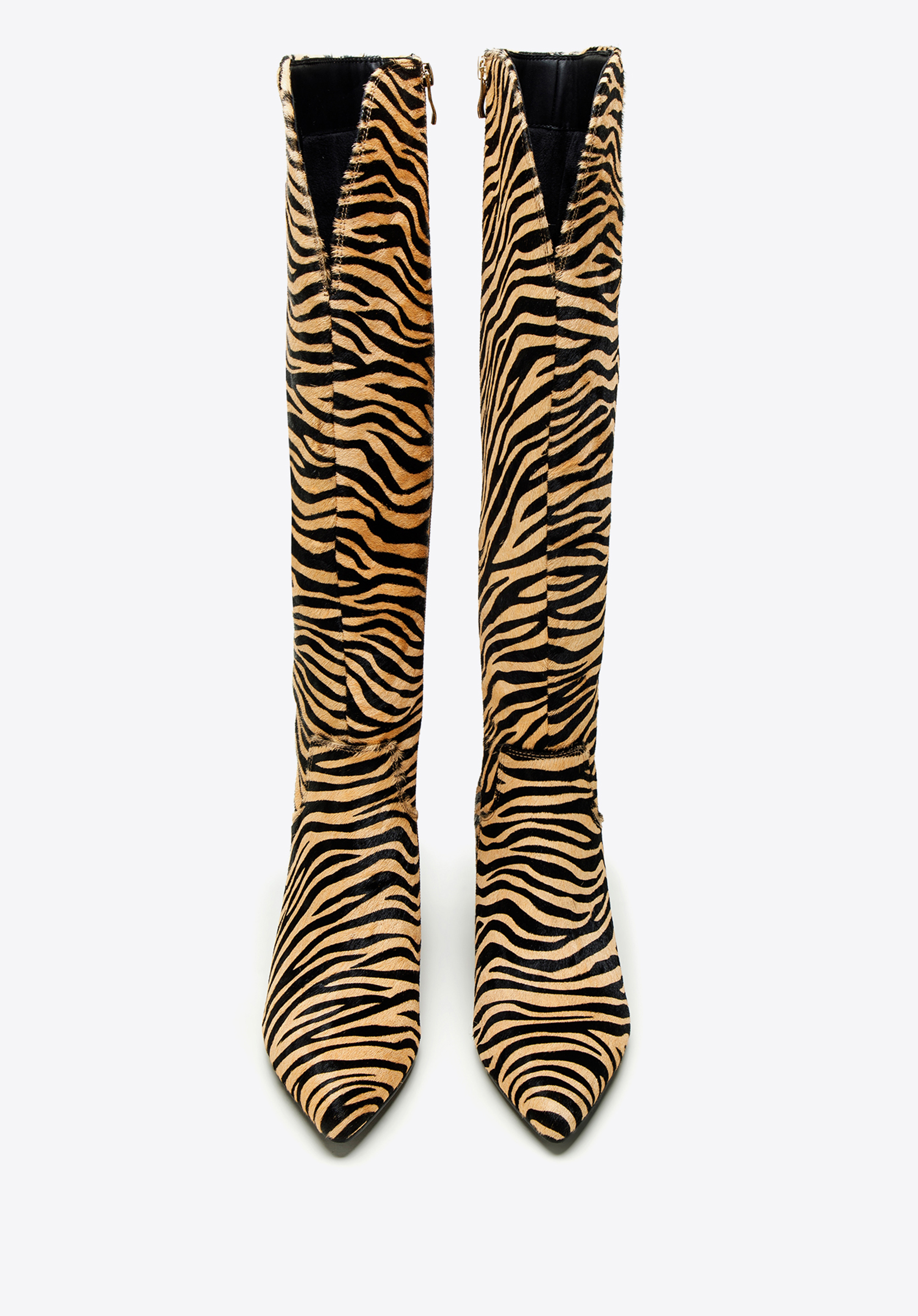 Ebben a cipőben nem maradsz észrevétlen az biztos. Kiváló minőségű bőrből készült, divatos állatmintás szőrrel. A tetején V-alakú vágás található, amely kiemeli a vádlit. A csizmának hegyes orra és kényelmes tömbsarka van, amely néhány centiméterrel növeli a magasságod. Belül cipzár található , így könnyebb lesz fel- és levenni őket. Ez a modell feldobja egy klasszikus kabáttal ellátott szetted és különlegességet ad egy nőies miniruhához is. Az állatmintás női bőrcsizma remek választás a karakteres kiegészítők szerelmeseinek.