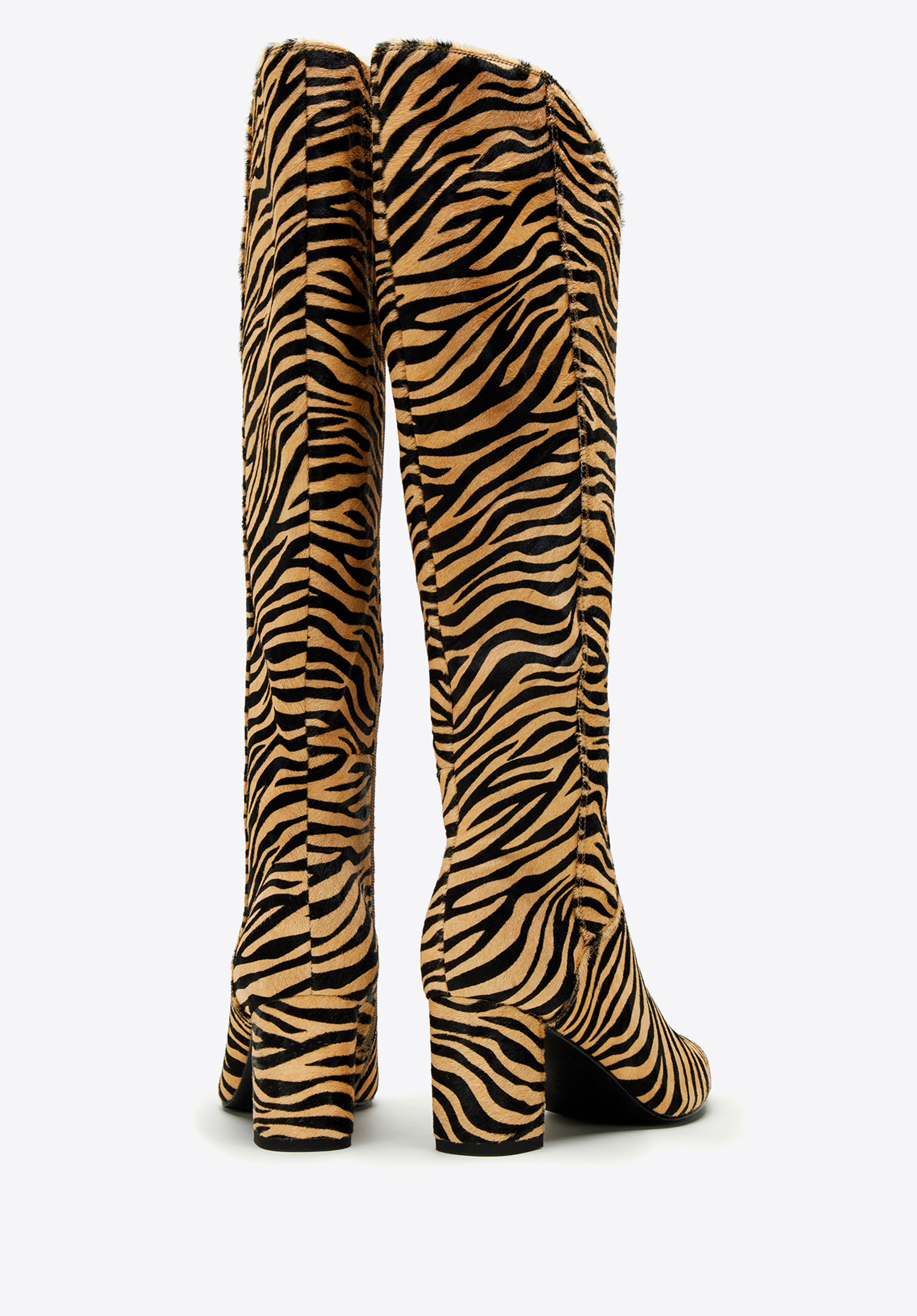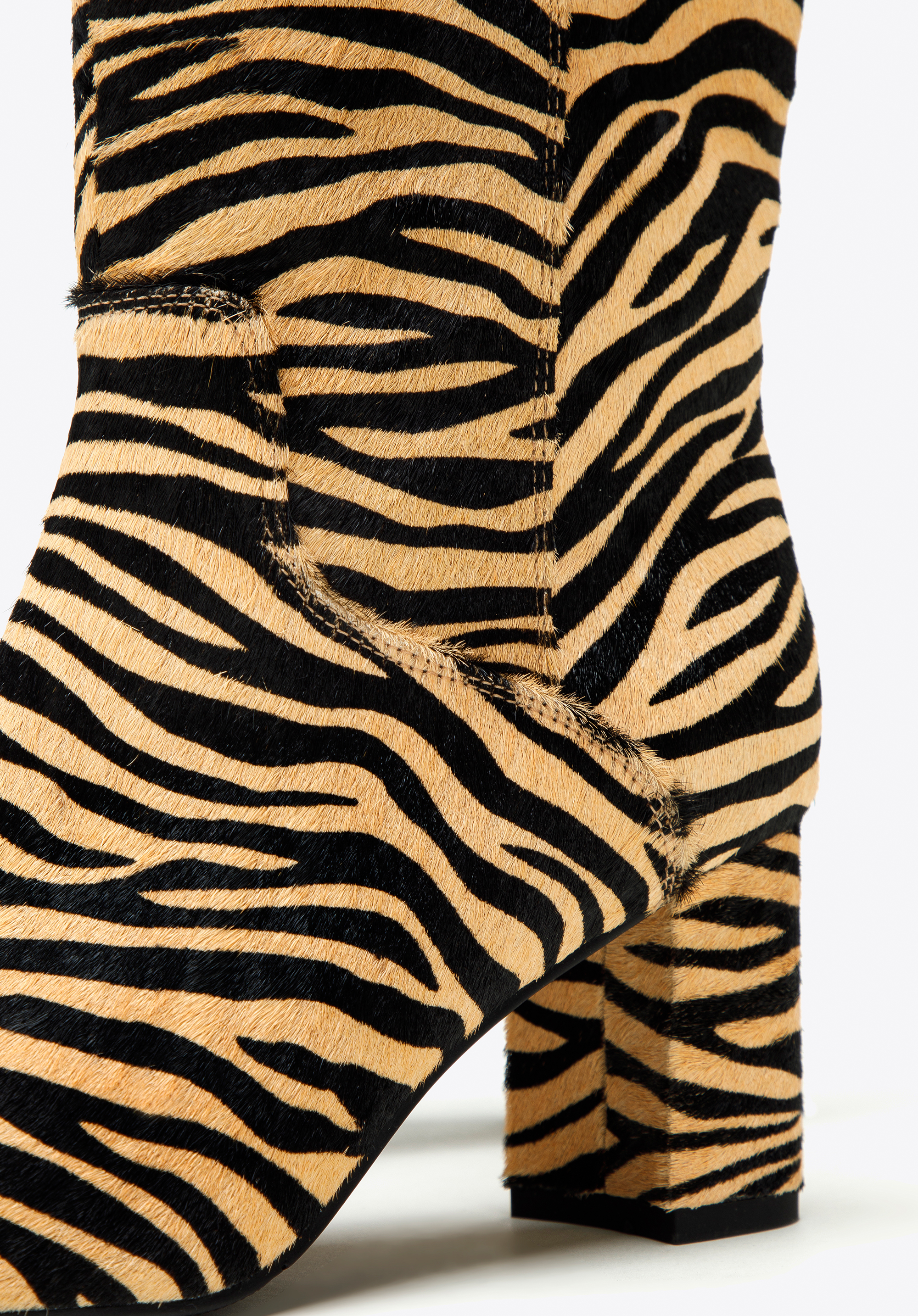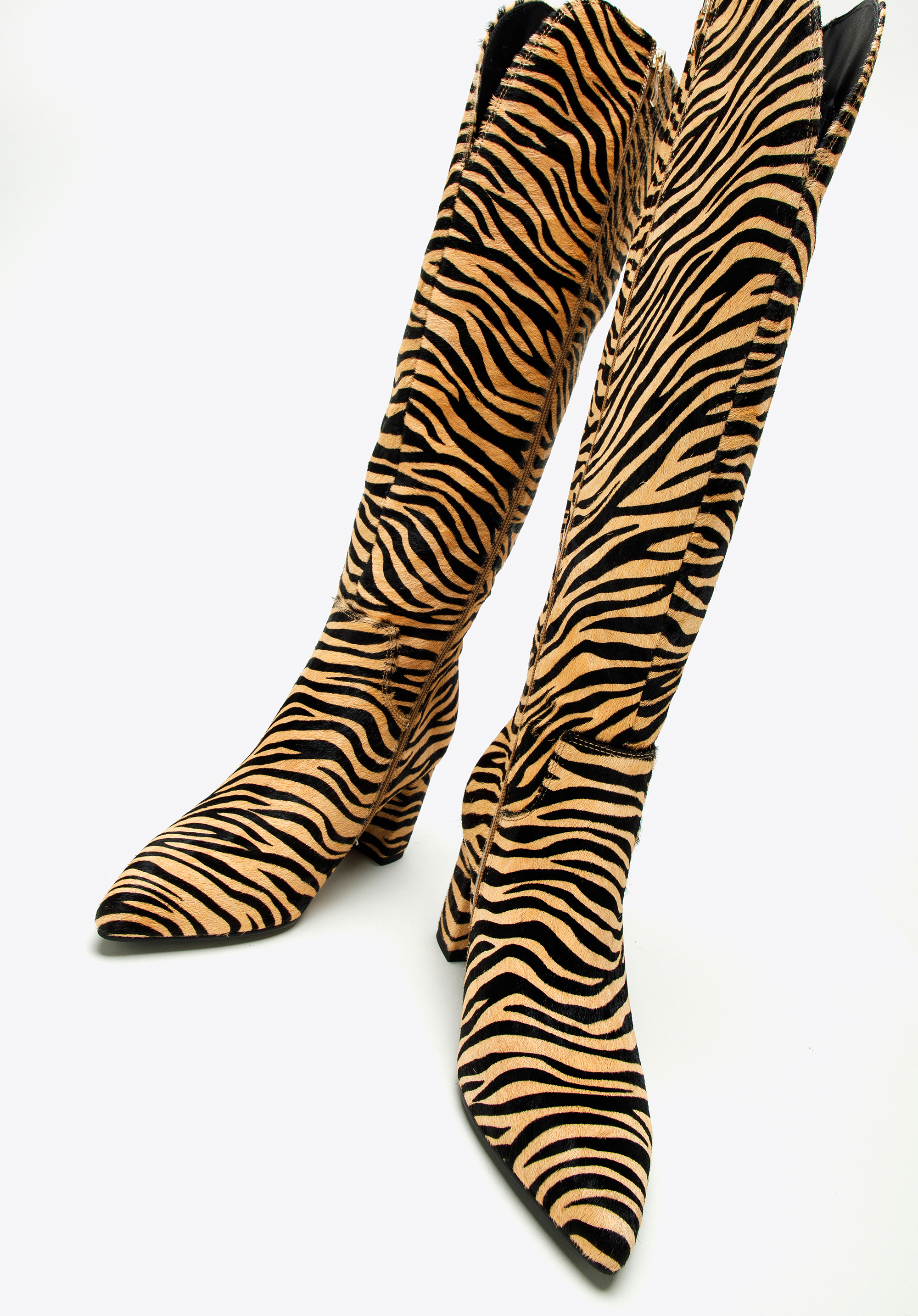 Ebben a cipőben nem maradsz észrevétlen az biztos. Kiváló minőségű bőrből készült, divatos állatmintás szőrrel. A tetején V-alakú vágás található, amely kiemeli a vádlit. A csizmának hegyes orra és kényelmes tömbsarka van, amely néhány centiméterrel növeli a magasságod. Belül cipzár található , így könnyebb lesz fel- és levenni őket. Ez a modell feldobja egy klasszikus kabáttal ellátott szetted és különlegességet ad egy nőies miniruhához is. Az állatmintás női bőrcsizma remek választás a karakteres kiegészítők szerelmeseinek.