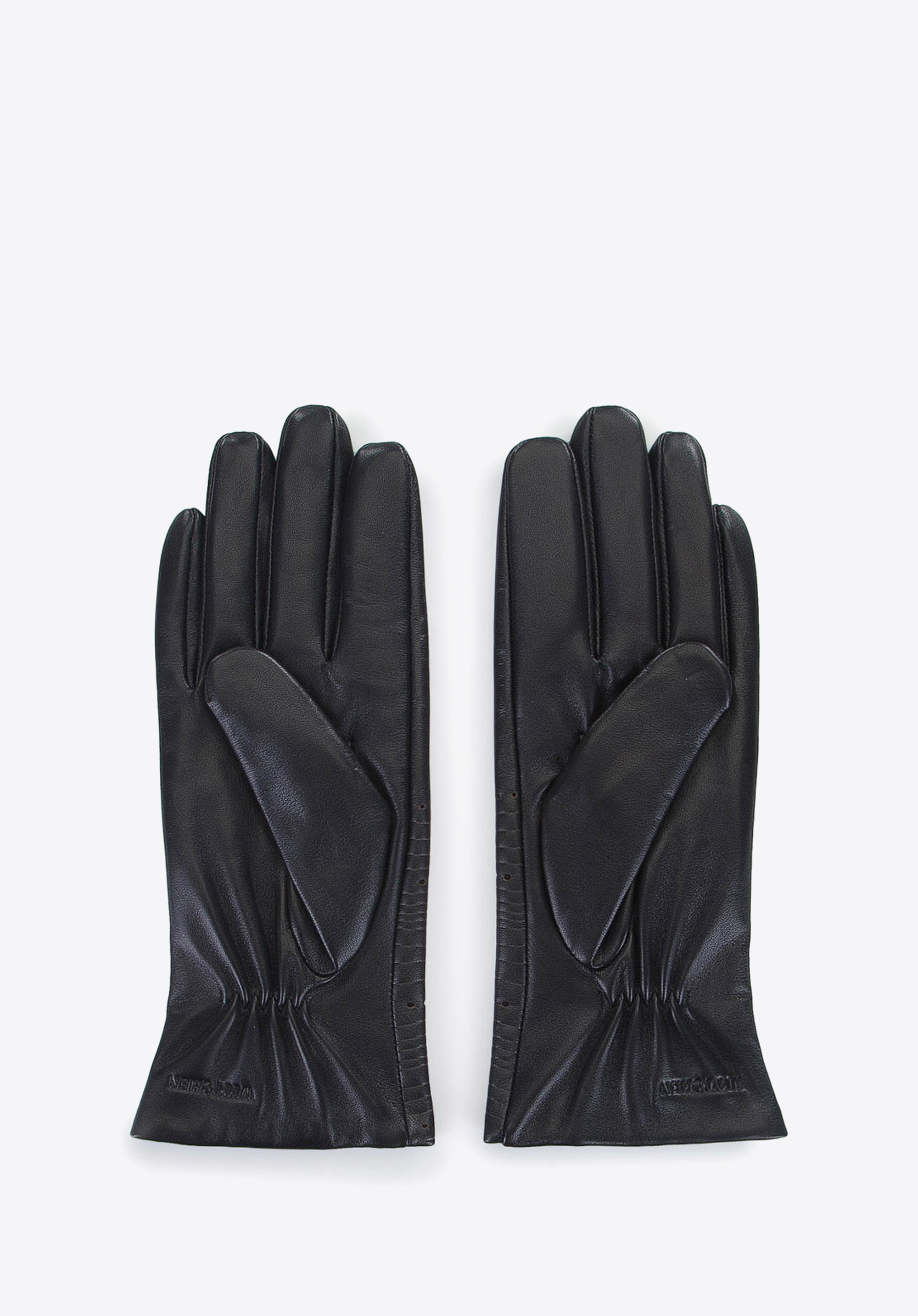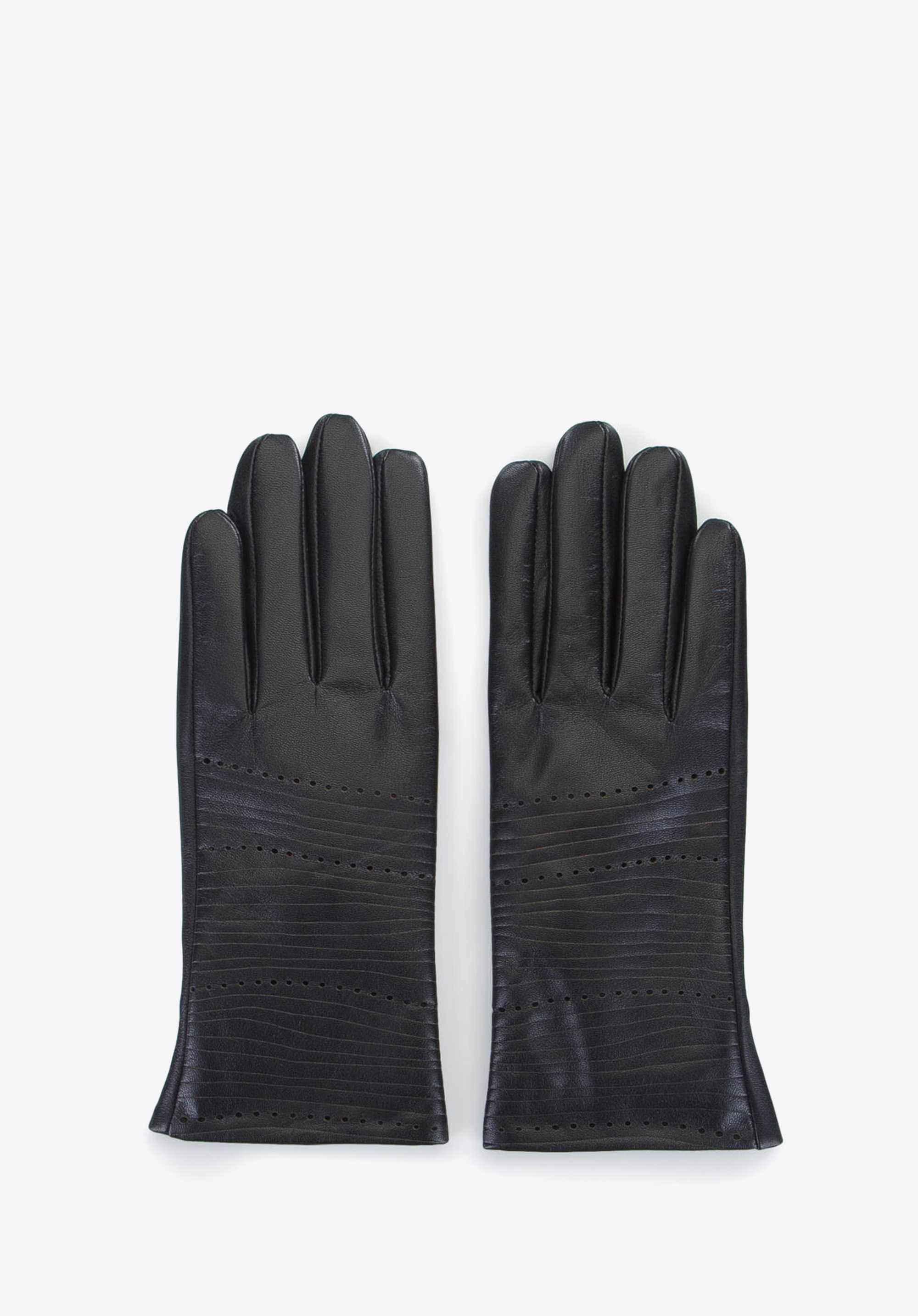 Rendkívül stílusos női kesztyűmodell. Kiváló minőségű, vízszintes csíkokkal domborított természetes bőrből készültek. Kiegészítő díszítésük apró perforációk; a kesztyű alja sima. Ezen kívül van egy rövid pántjuk is, amely segít gyorsan le- és felvenni őket. A kesztyű jól illeszkedik a kézre. Ez a csíkos, dombornyomott bőrből készült kesztyű még a legegyszerűbb stílusnak is ízléses befejezése lesz.