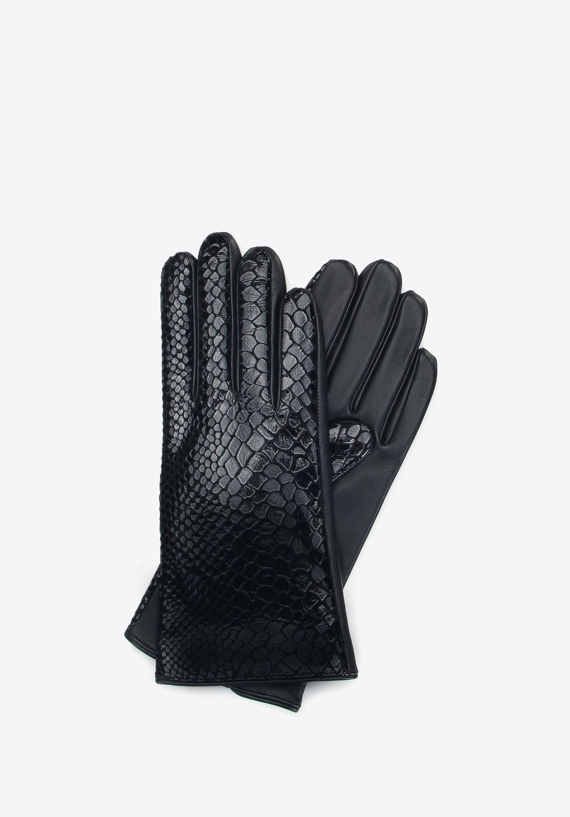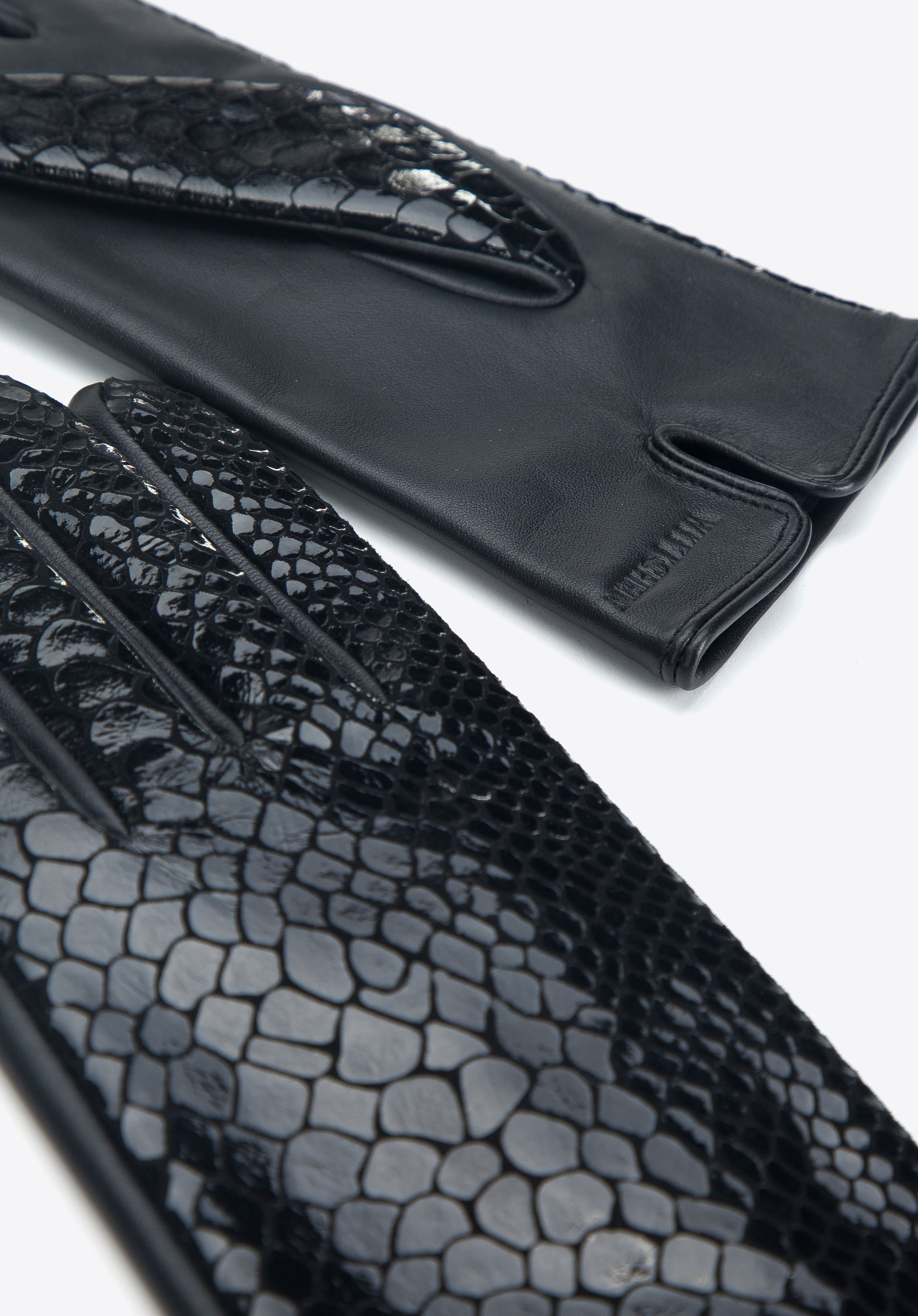Ezek az egyedi kesztyűk új stílust hoznak a ruhatáradba. A felszíne fényes krokodilbőr textúrájú bőrből, míg a hátulja sima természetes bőrből készült. A puha bélés melegen tart a hűvösebb napokon is. Ez a modell változatossá teszi a sima, klasszikus gyapjúkabátokat, de egy steppelt pehelykabáttal is jól mutat majd. Ez a női bőrkesztyű nagyszerű választás az egyedi kiegészítők szerelmeseinek.