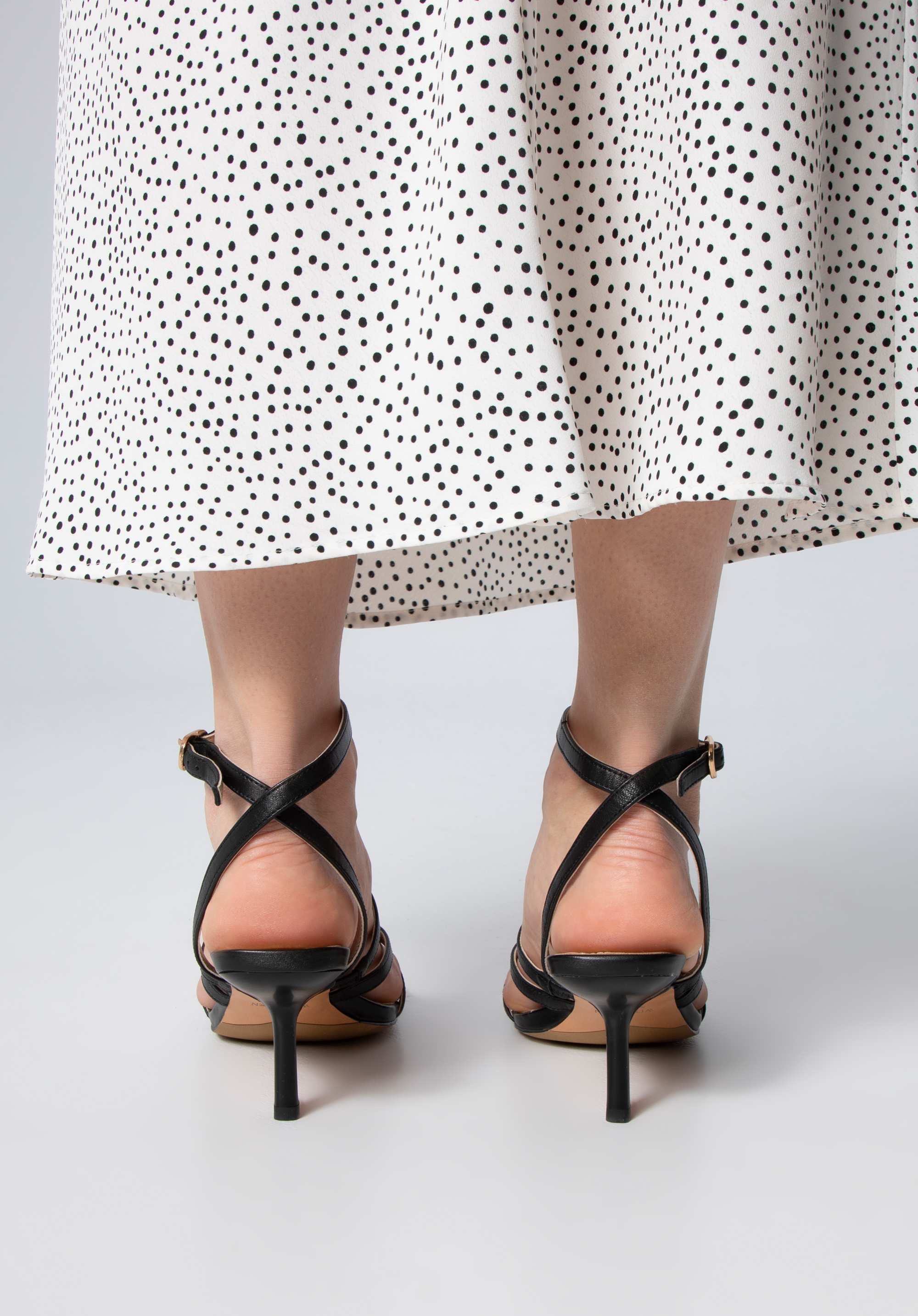 Ezek a nőies szandálok elegánsan kiegészítik nyári stílusod. Kiváló minőségű természetes bőrből készültek. A boka körüli rögzítés stabilan a helyén tartja azokat, a vékony pántok pedig szépen kiemelik a lábfejed. Egy kis csillogó "W" betűvel díszítettek. Az alacsony, formás tűsarkú cipő karcsúsítja az alakod, és néhány centi magasságot ad. Hord őket kedvenc széles szárú nadrágoddal és pólóddal a hétköznapokon, vagy különleges alkalmakra koktélruhával. A női bőr pántos tűsarkú szandál egy több szezonon keresztül viselhető időtálló kiegészítő.