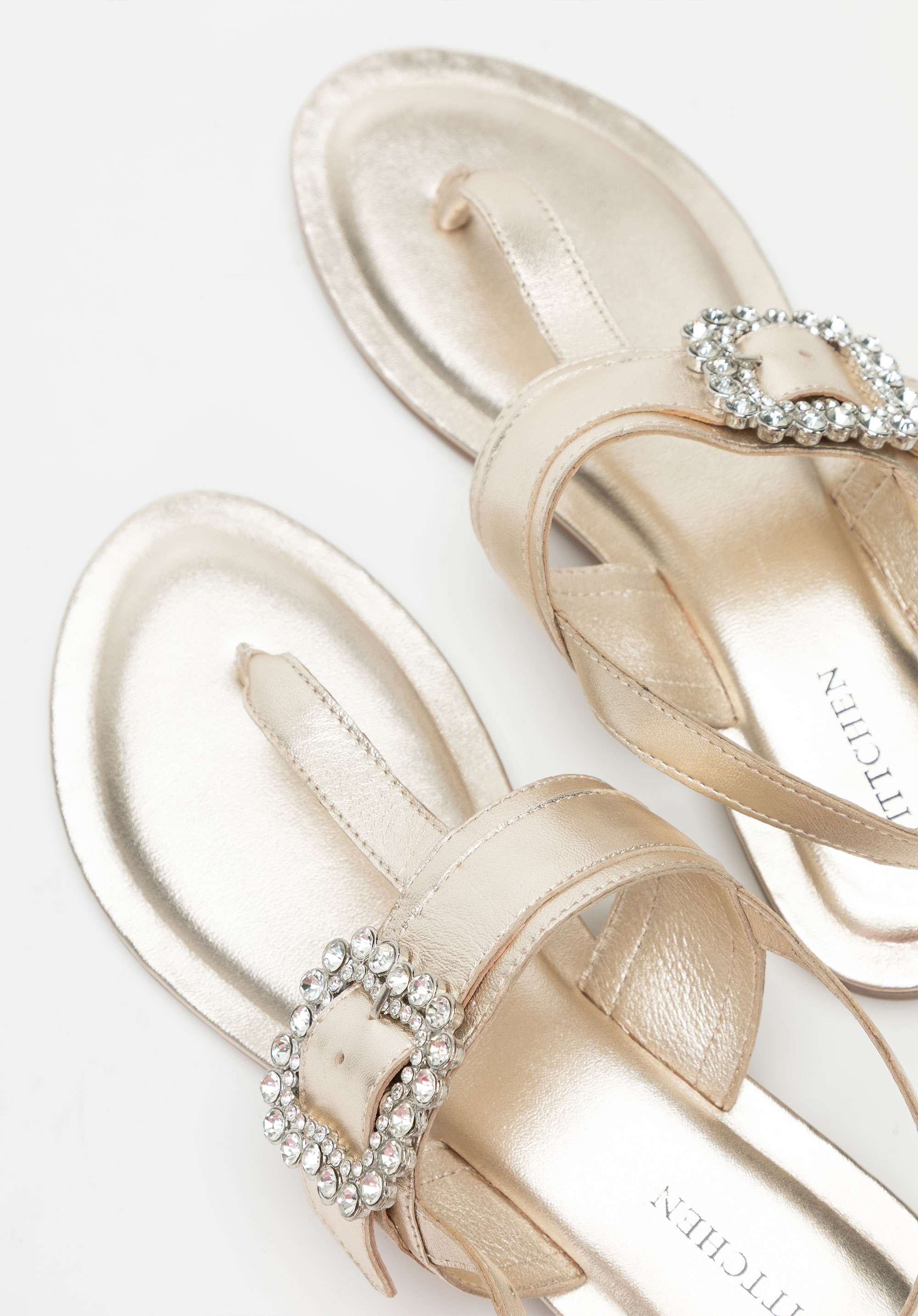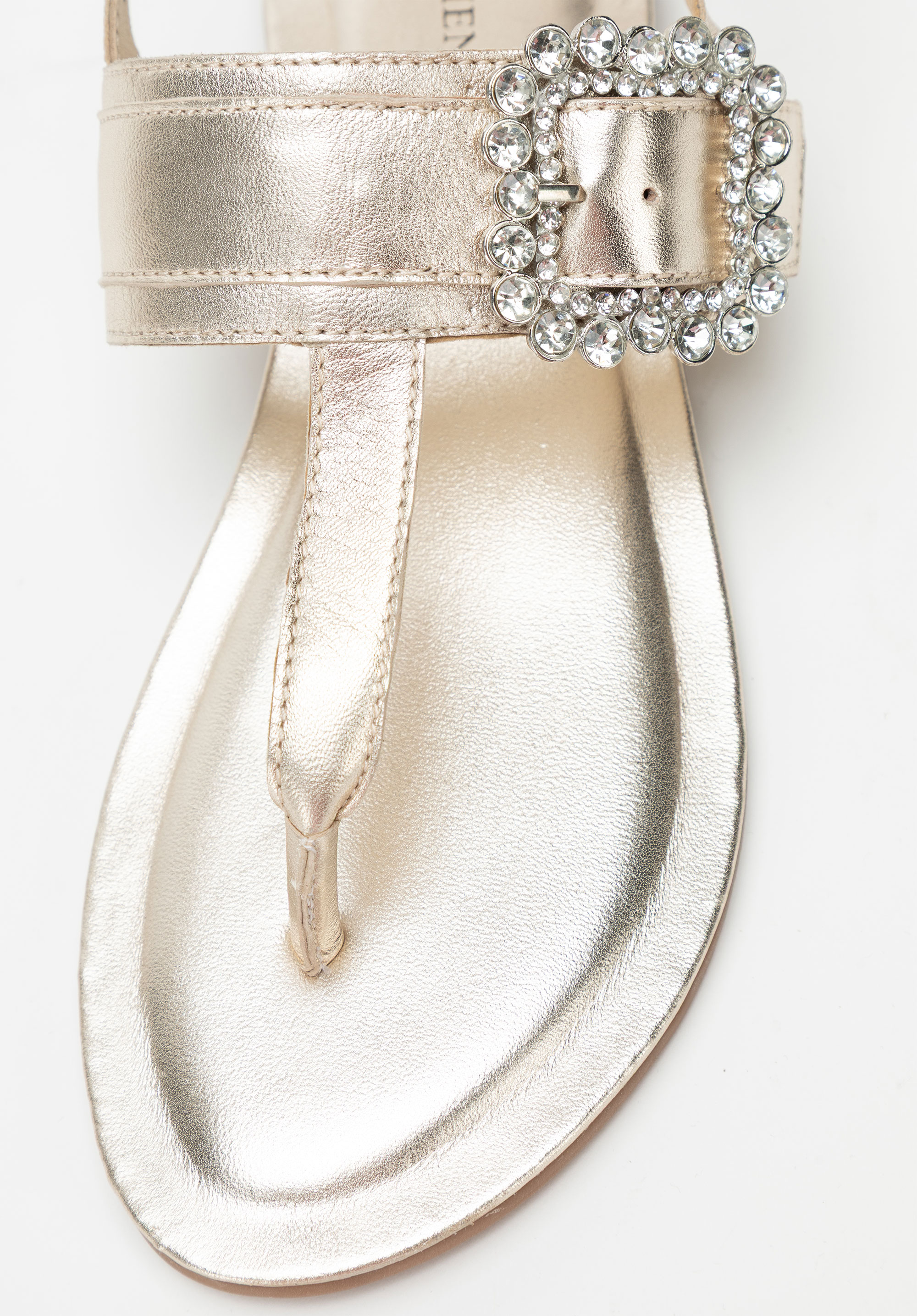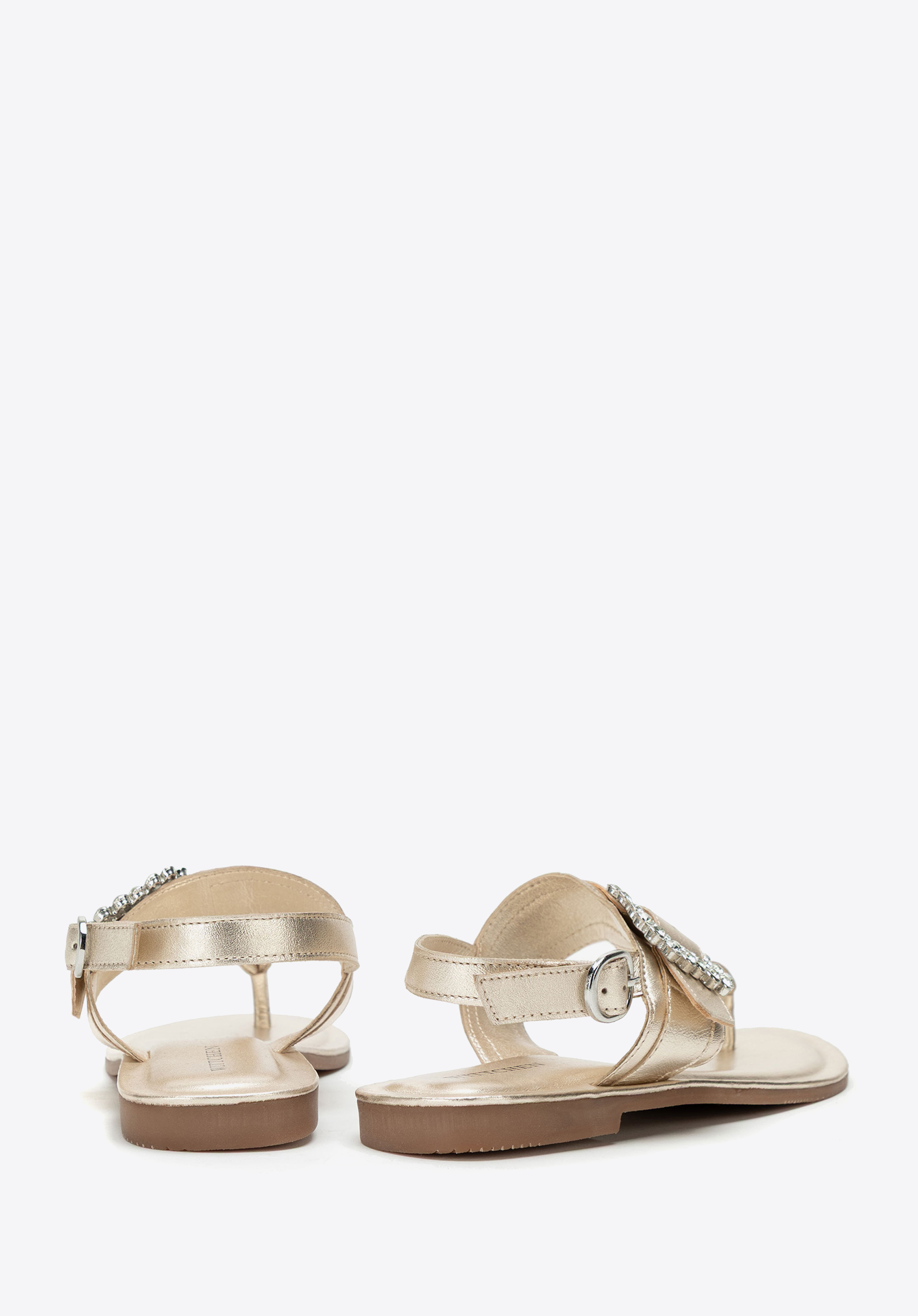 - Dekoratív csat a pánton: Szemet gyönyörködtető részlet, amely nőies, elegáns karaktert kölcsönöz a szandálnak.