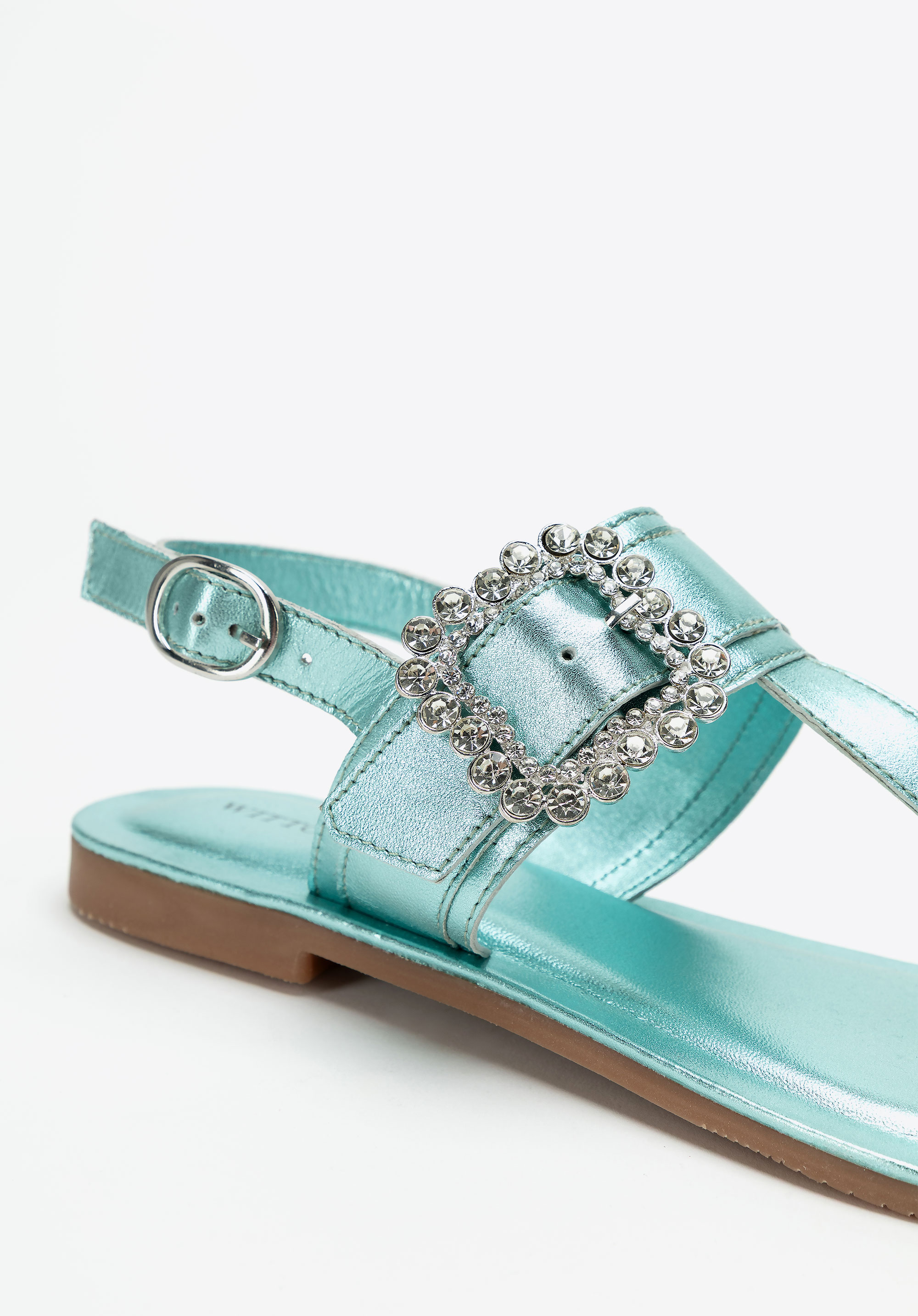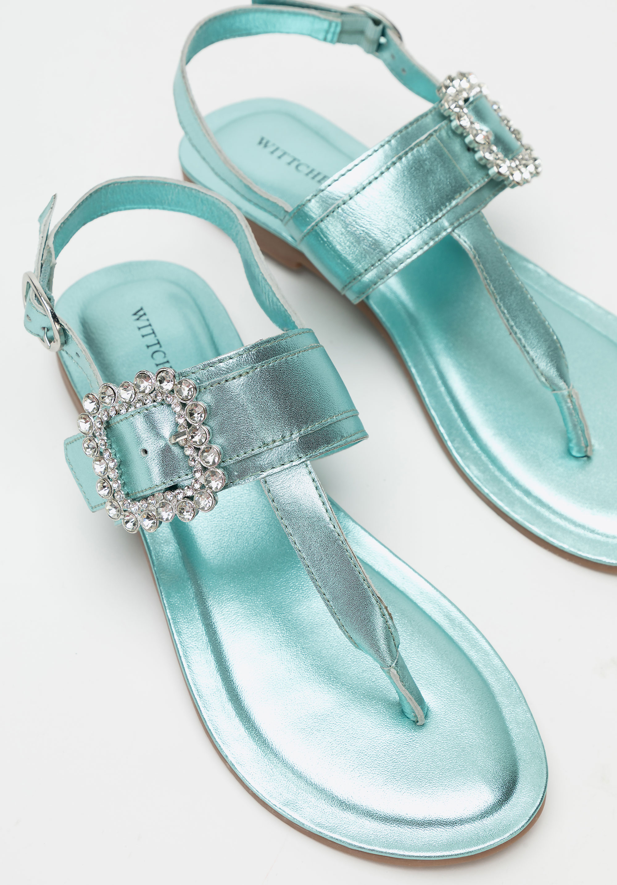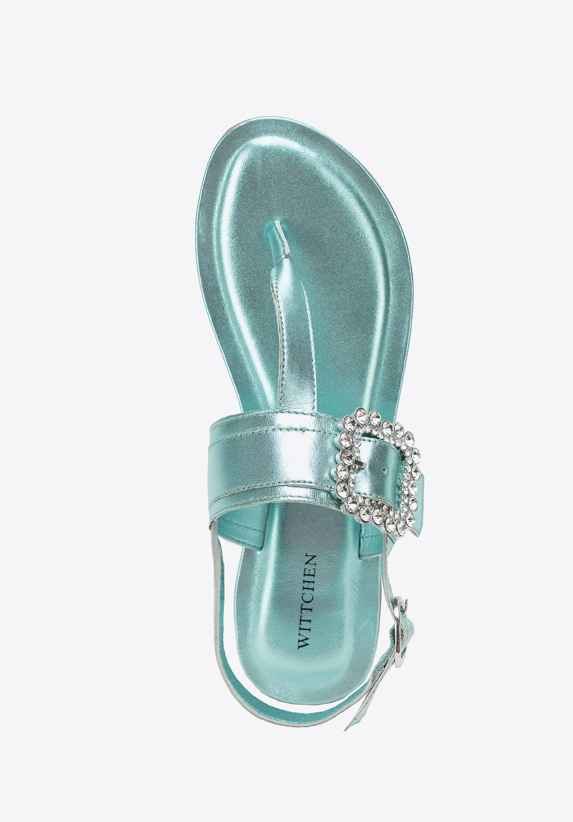- Dekoratív csat a pánton: Szemet gyönyörködtető részlet, amely nőies, elegáns karaktert kölcsönöz a szandálnak.