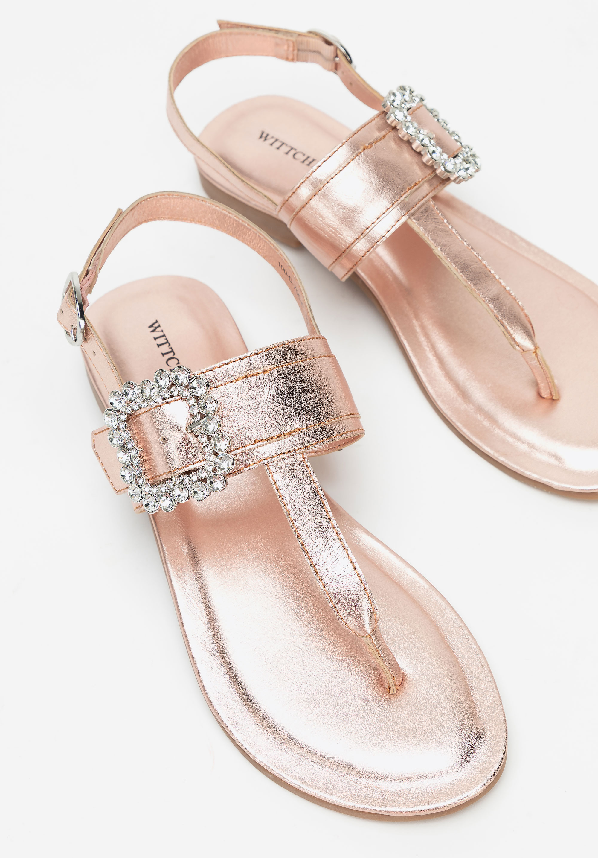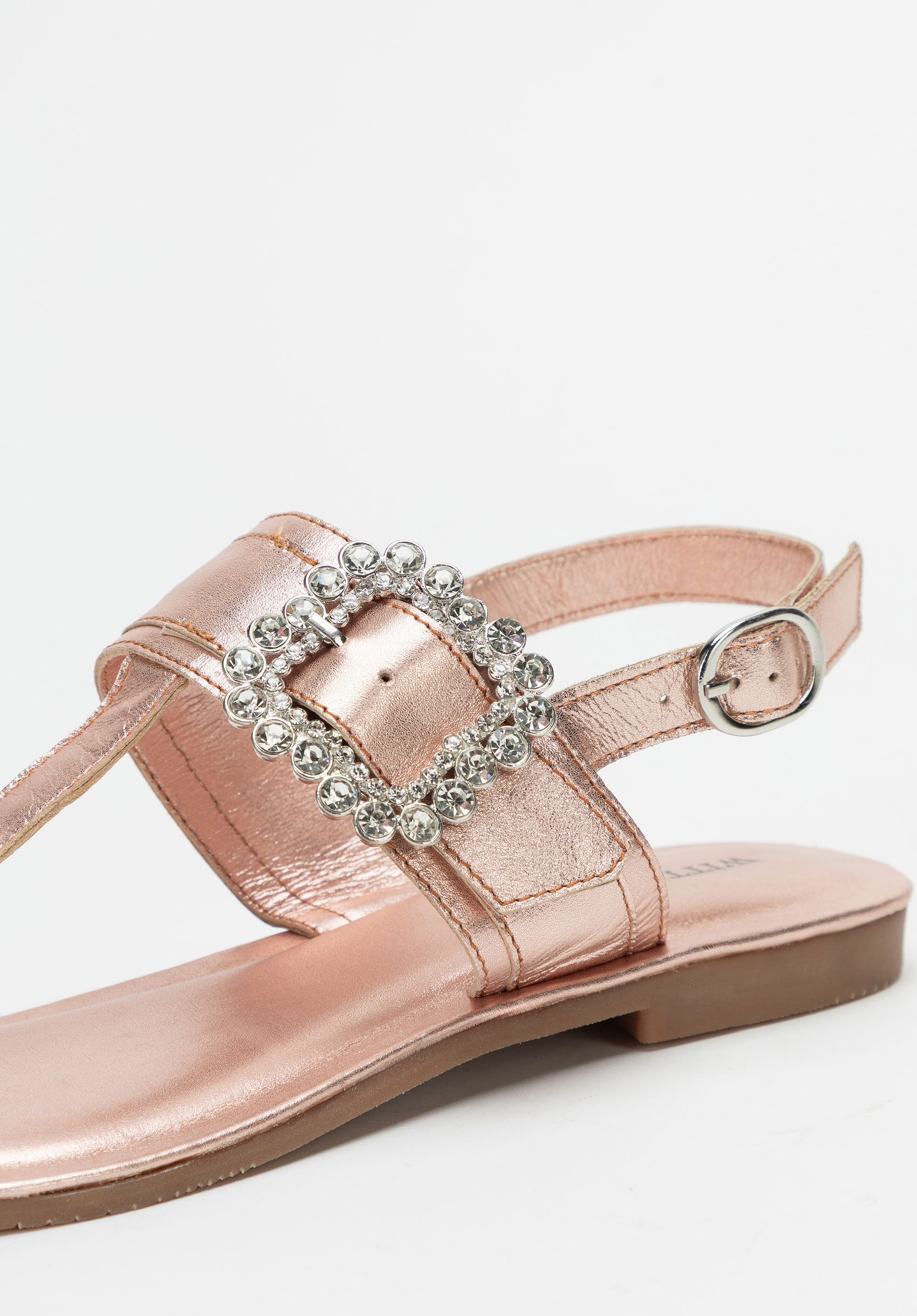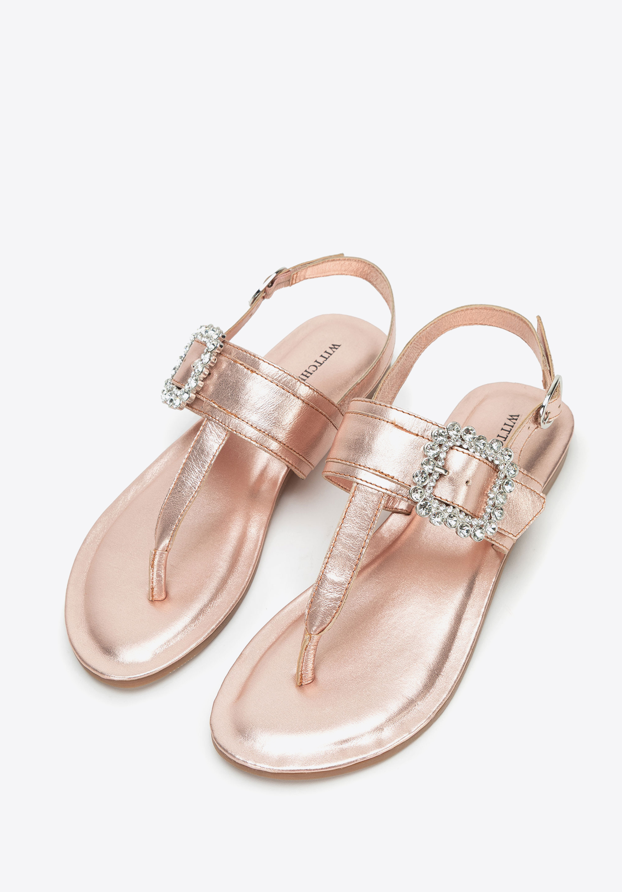 - Dekoratív csat a pánton: Szemet gyönyörködtető részlet, amely nőies, elegáns karaktert kölcsönöz a szandálnak.