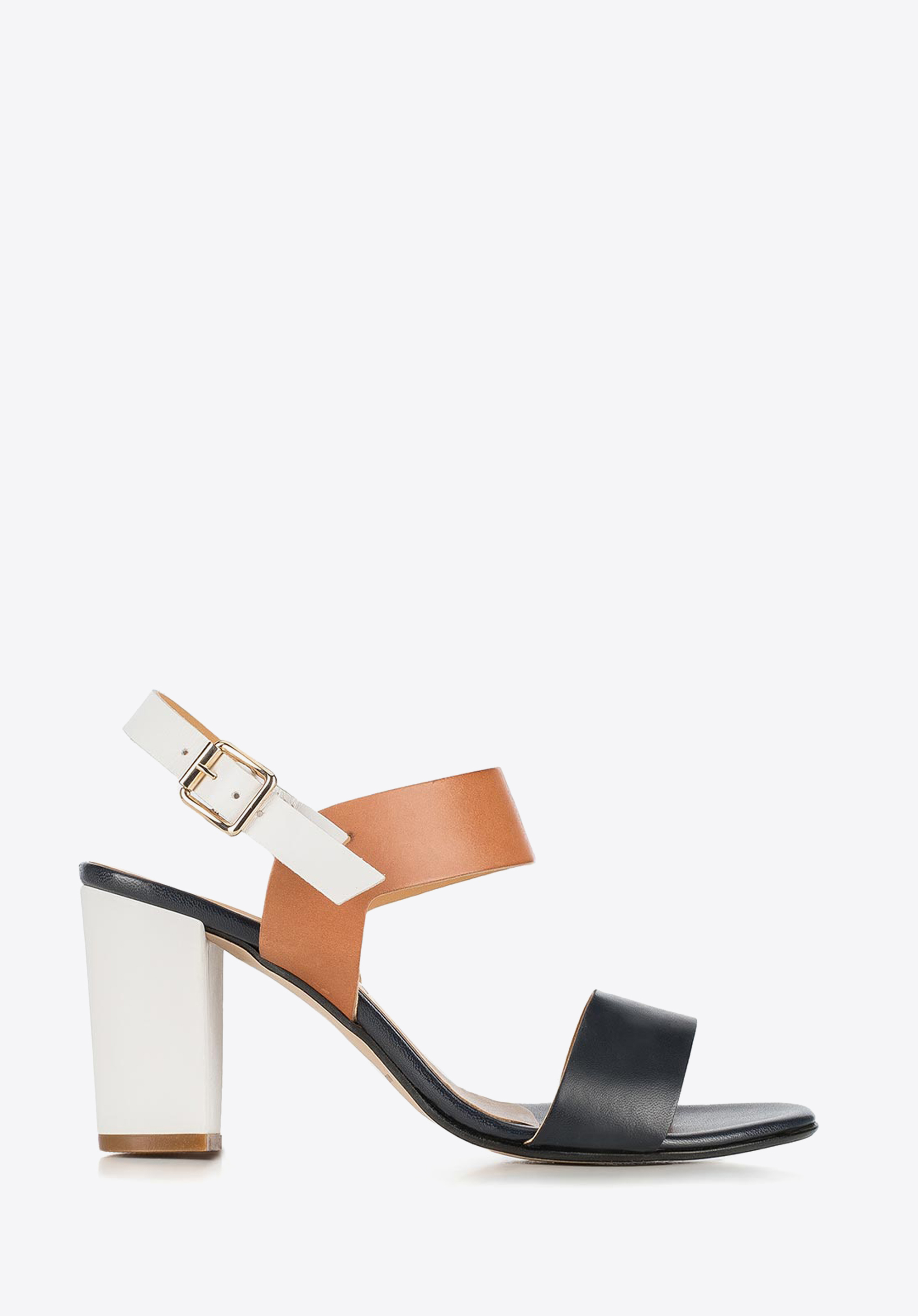 Oszlopsarkú szandál bőrszíjakból, magas minőségű szemcsés bőrből kézzel varrva Olaszországban. Háromféle kontrasztos árnyalat dinamikus hatást kelt, ez a lábbeli sötétkék, világosbarna és fehér ötvözete.