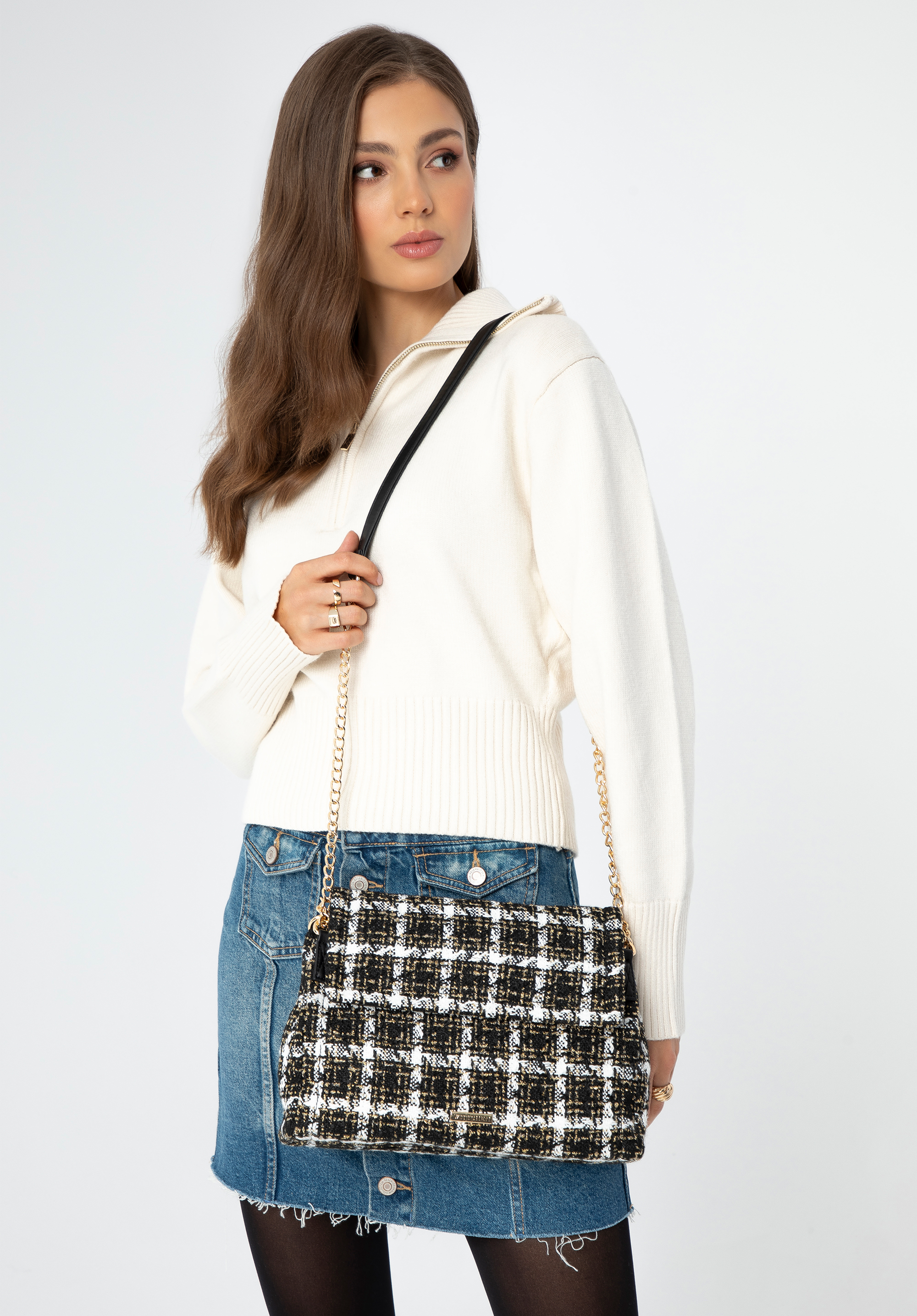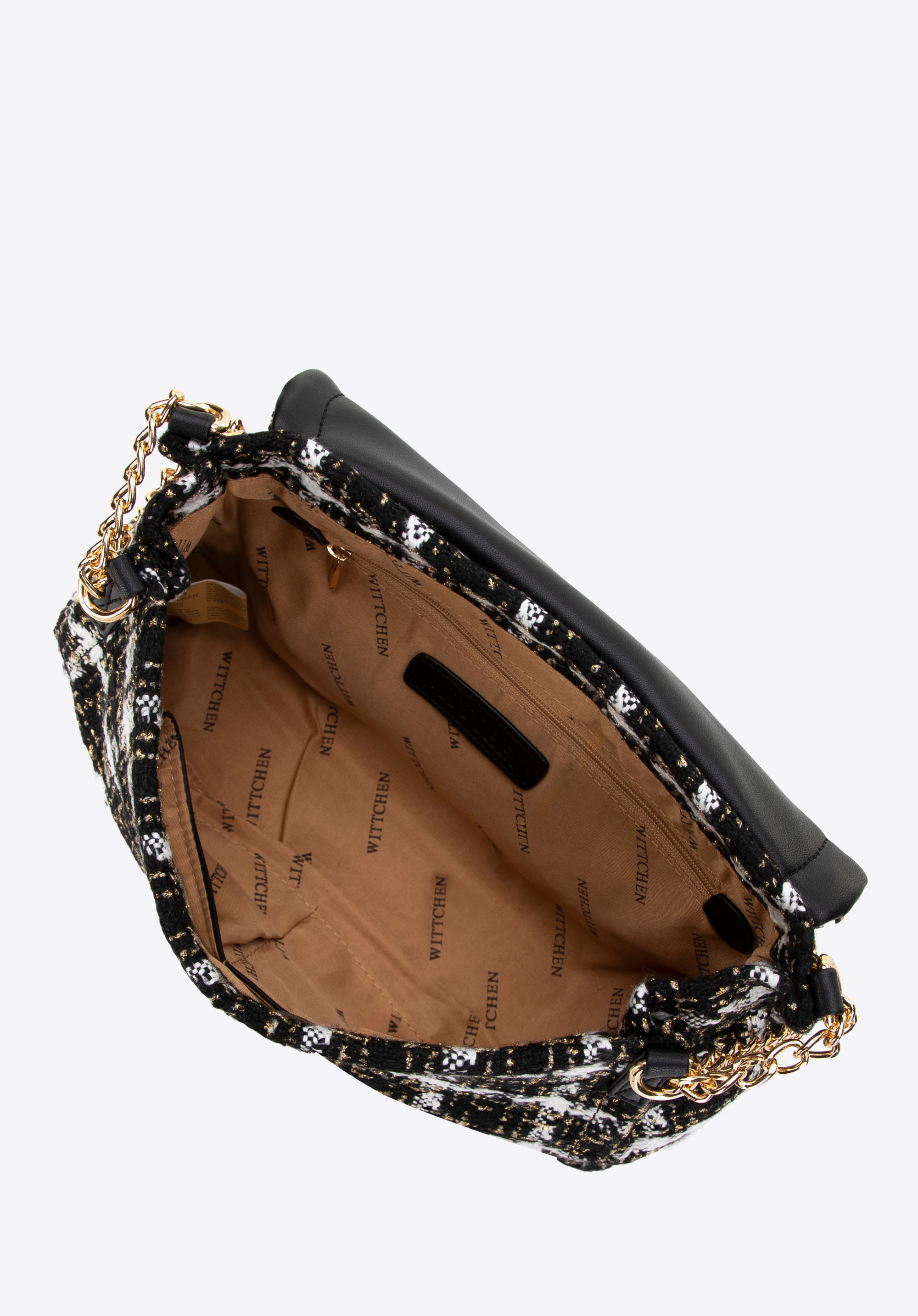 Fedezd fel ezt a kivételes, bouclé anyagból készült, fekete-fehér válltáskát, amely kifinomult eleganciát kölcsönöz ruháidnak. Ez az időtlen stílusú kézitáska az elegancia és a funkcionalitás megtestesítője. Az enyhén megerősített talp stabilitást biztosít és védi holmijaidat, míg a gyártó logója az elején és a bélésen presztízst ad. A mágneses záródás gyors és biztonságos rögzítést tesz lehetővé, a stílusos műbőr fogantyús lánc pedig tökéletesen kiegészíti a kézitáska dizájnját, így biztosítva a hordozási kényelmet. Adj egy csipet luxust ruhatáradba.
