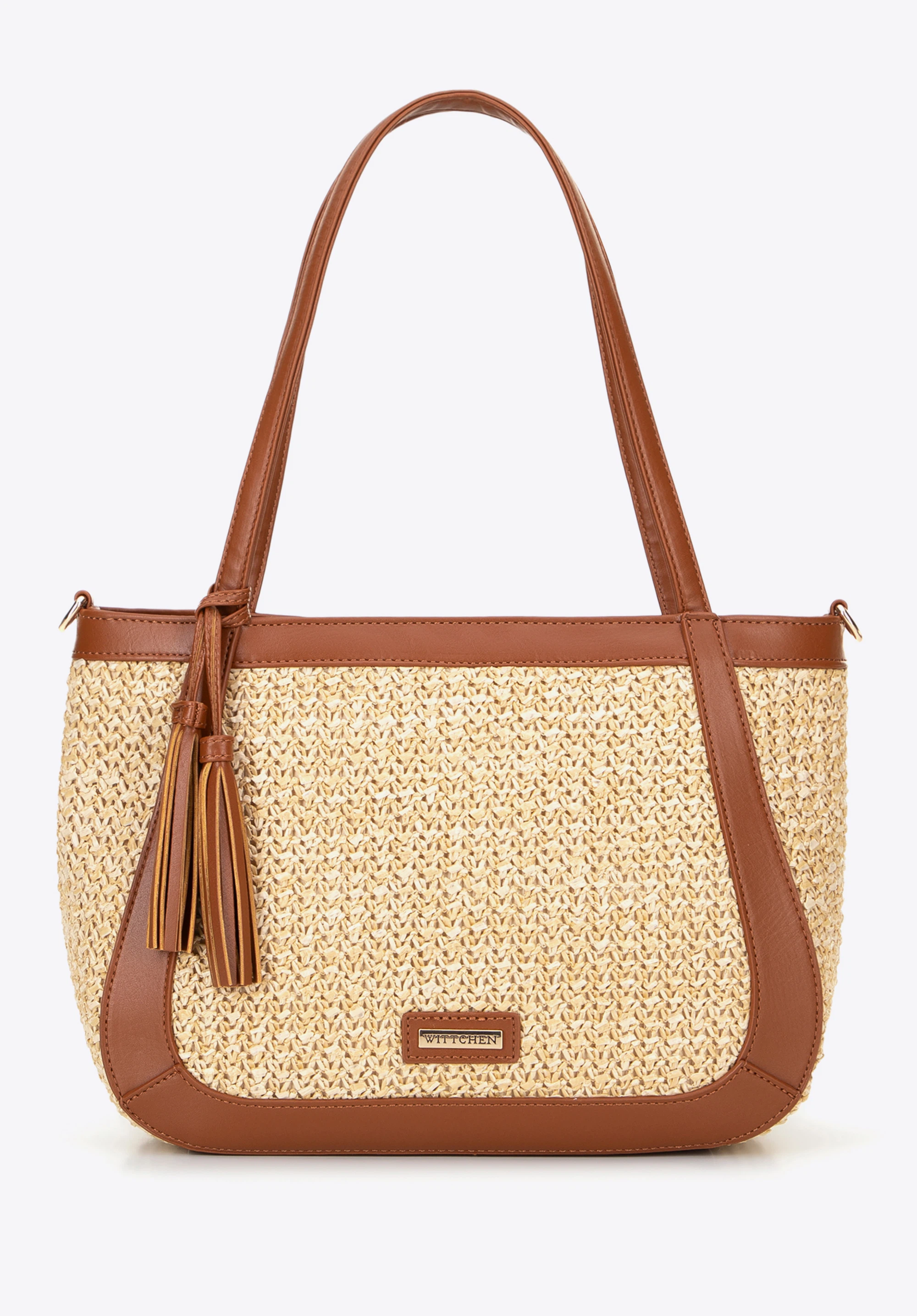 Ez az elegáns kézitáska egyedi, hagyományos fonattal tökéletes választás a nyári napokra. A matt műbőr és a dekoratív zsinór kombinációjából készült, strukturált, enyhén lekerekített forma, amely ötvözi a stílust és a funkcionalitást. Kis mérete ellenére könnyen elfér benne egy pénztárca, egy kis kozmetikai táska, egy kulacs és egyéb szükséges dolgok.