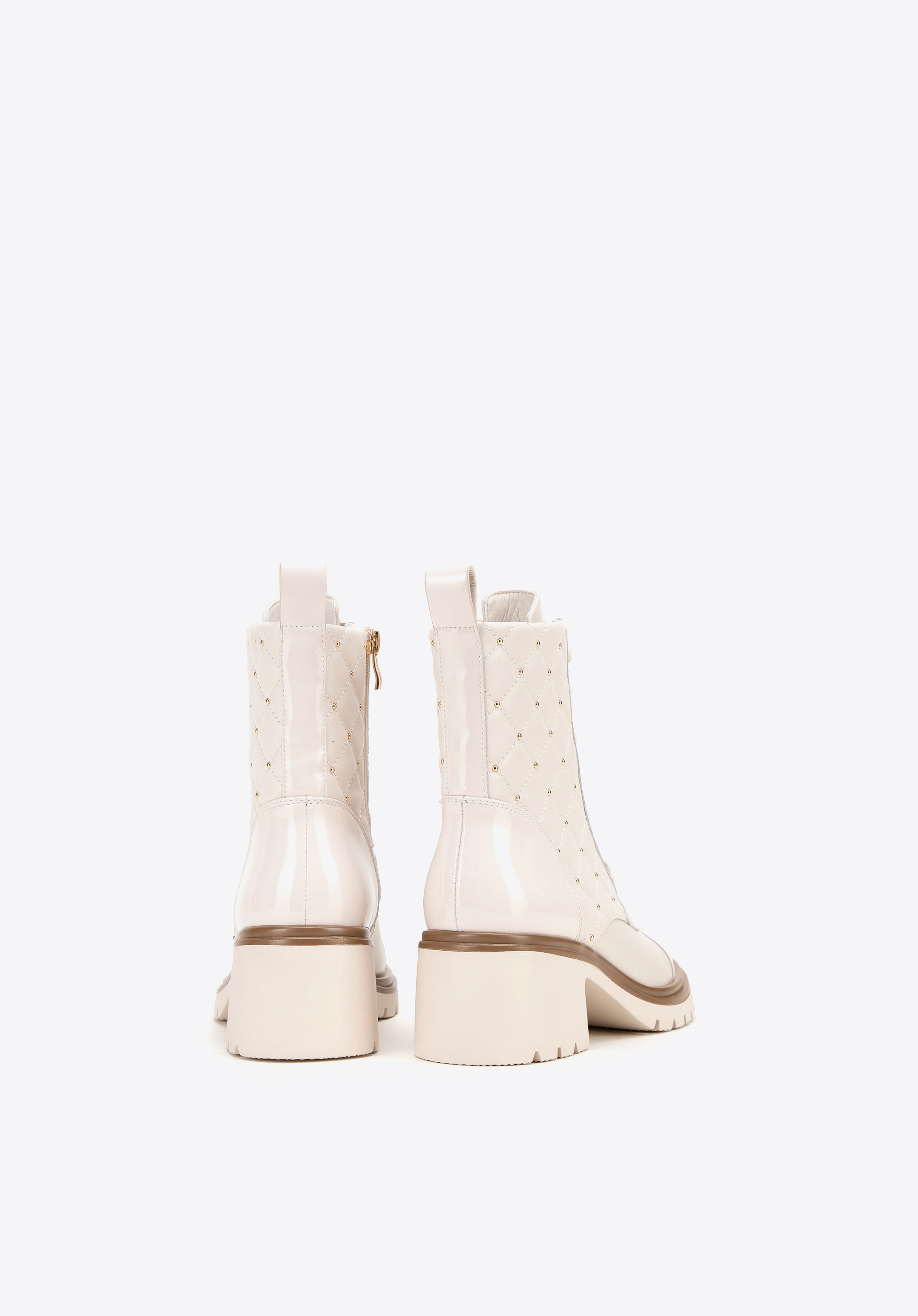 Merülj el a stílus és a kényelem világában tömbsarkú női csizmáinkkal – az elegancia modern formába zárva. Ez a kivételes, természetes bőrből készült csizma a klasszikus dizájnt ötvözi a kifinomult részletekkel a csillogáshoz. A lábujj és a hát fényes felülete, valamint a finom, csillogó szegecsekkel díszített geometrikus foltvarrás feltűnő összképet hoz létre.