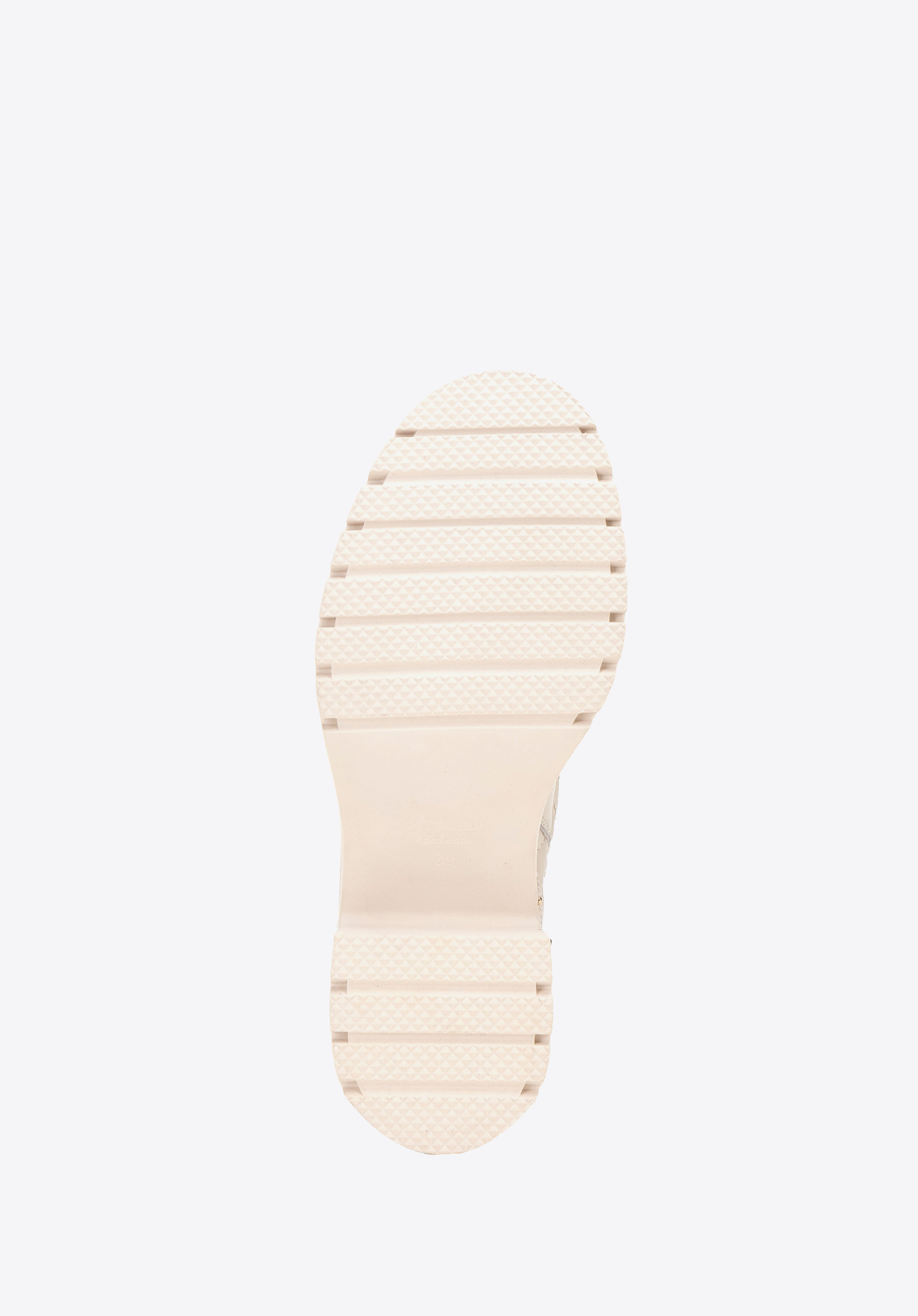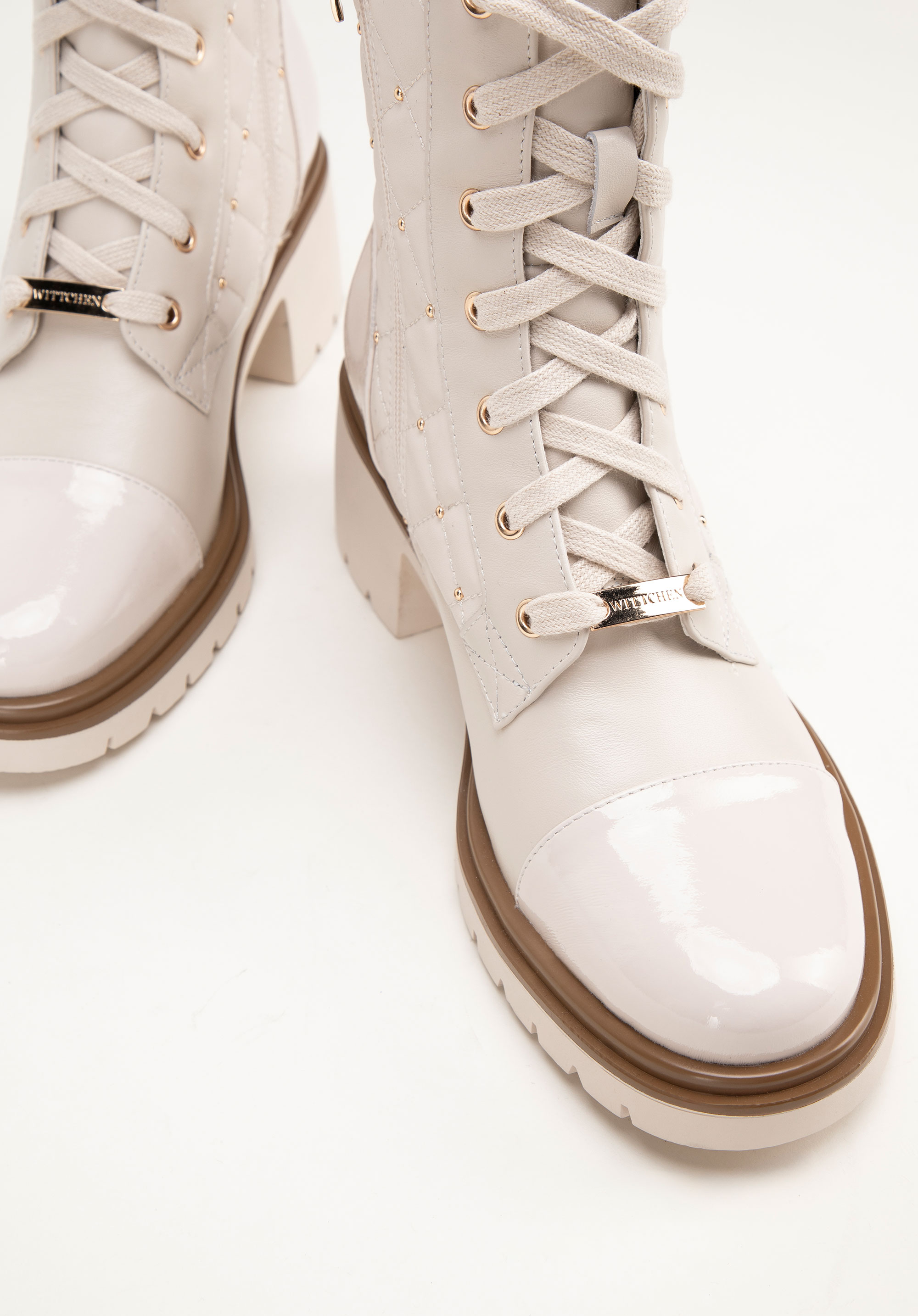 - Részletek: A lekerekített orr és a csizma hátulja lakkbőrrel van bevonva, ami javítja a csizma kinézetét, és növeli a nedvességgel és szennyeződéssel szembeni ellenállását.