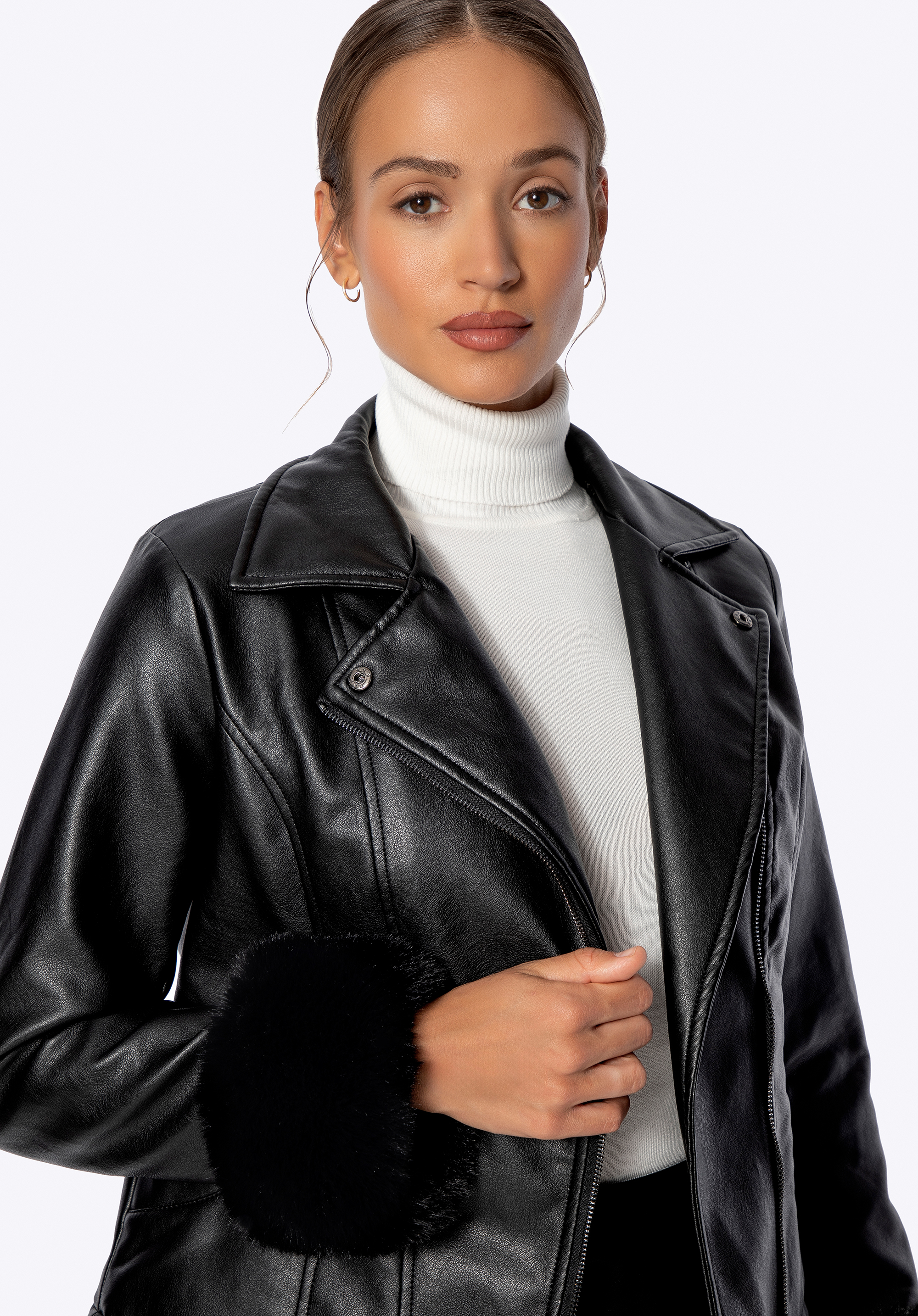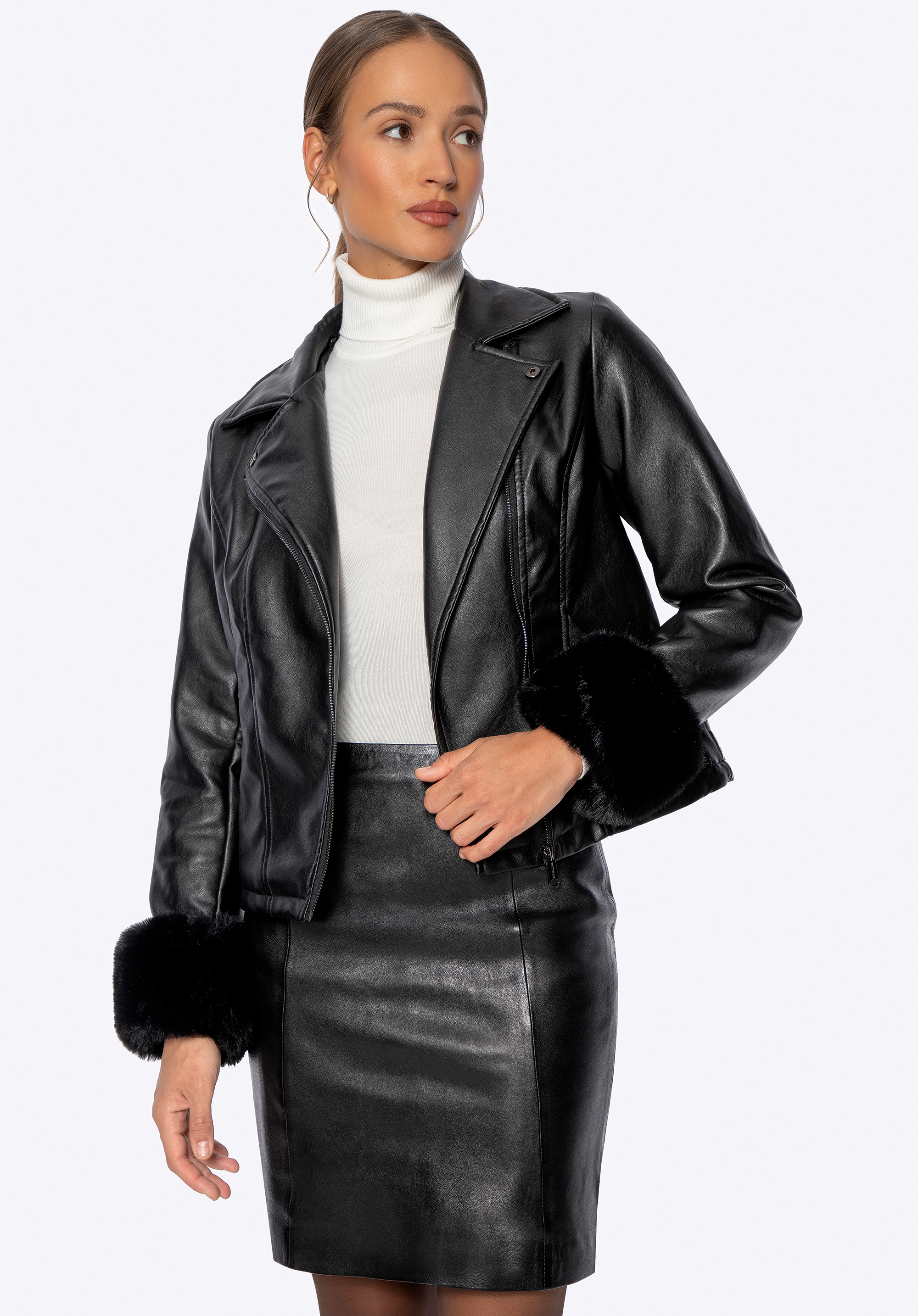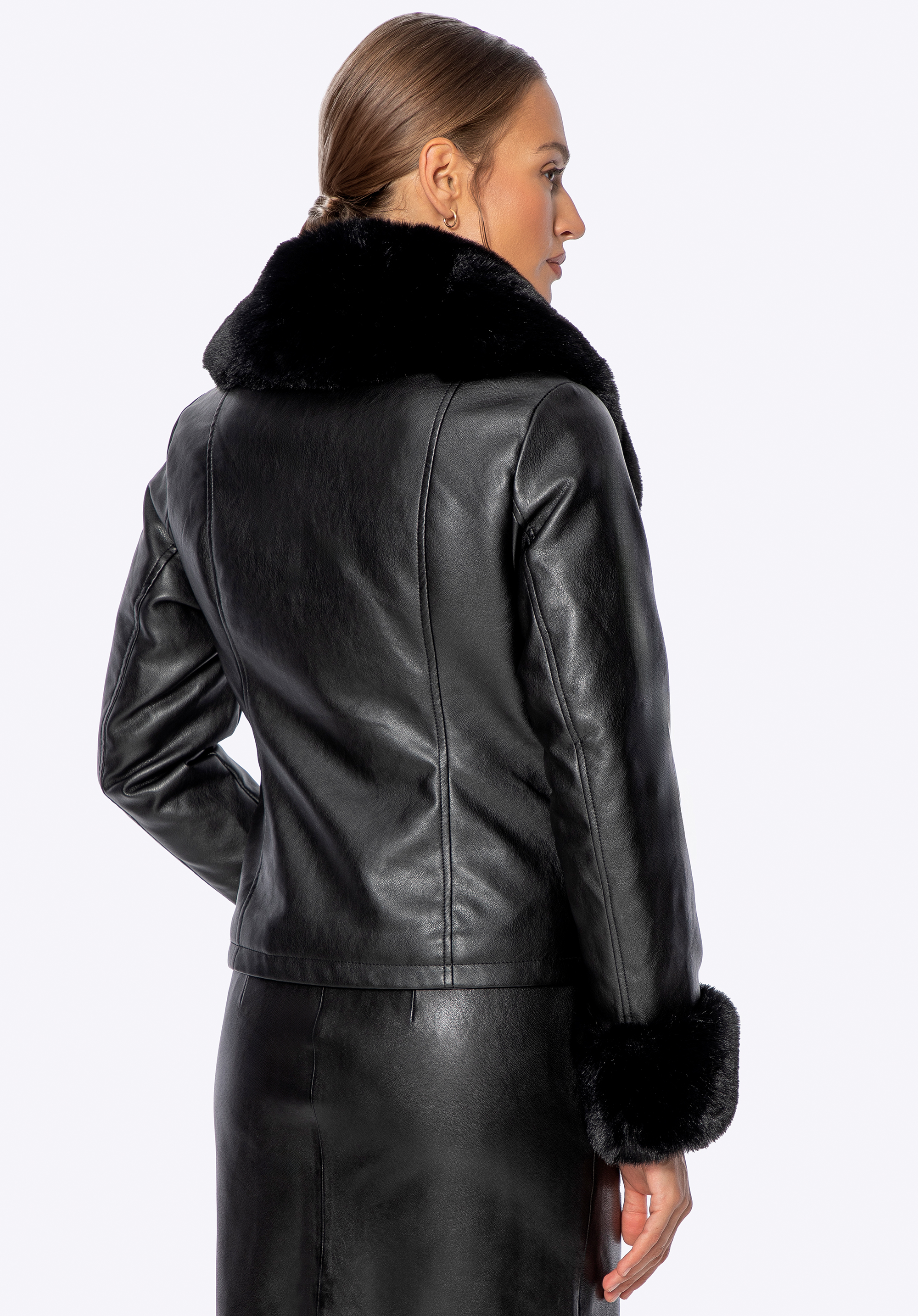 Városi elegancia – műbőr kabát szőrmével díszítve