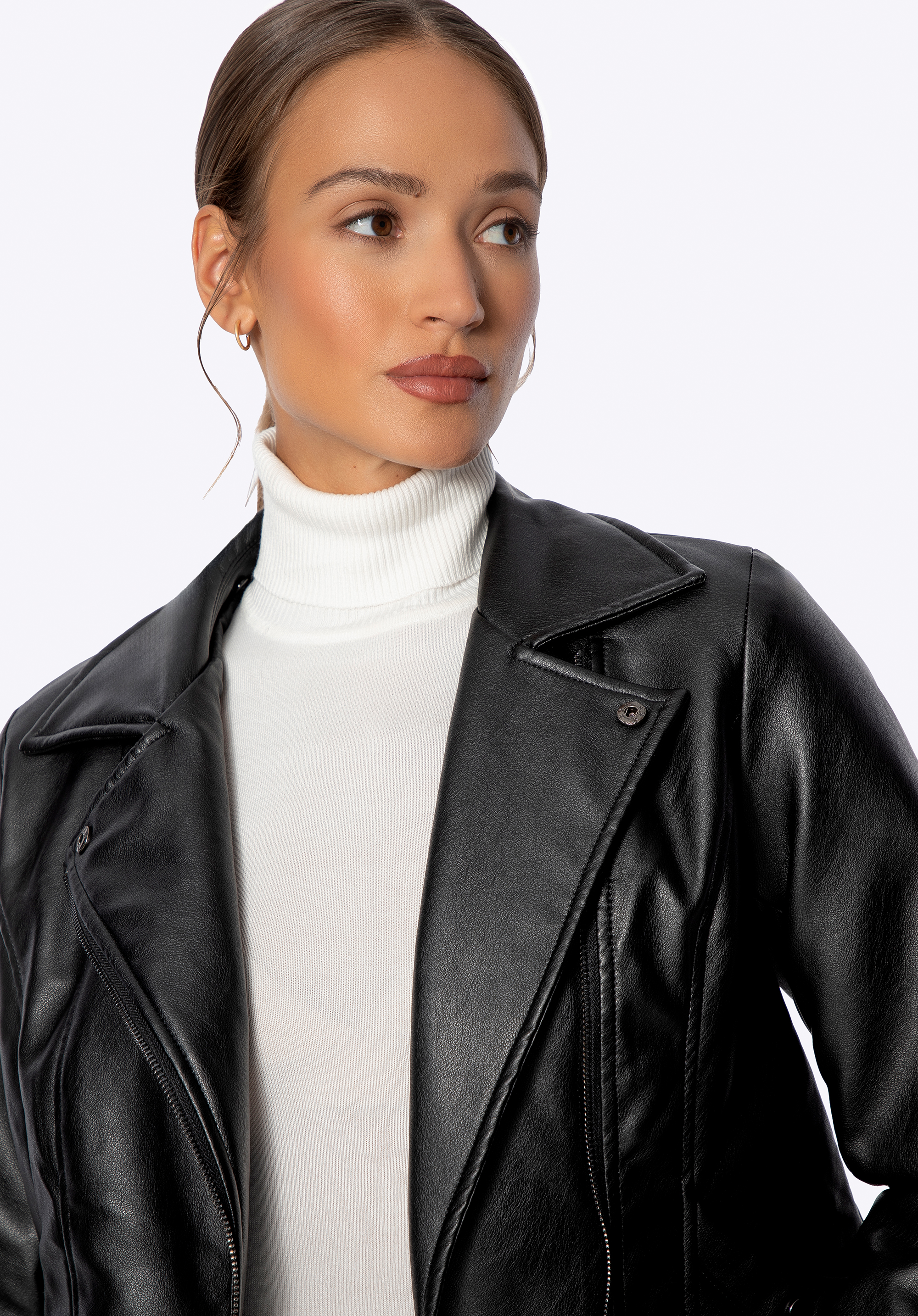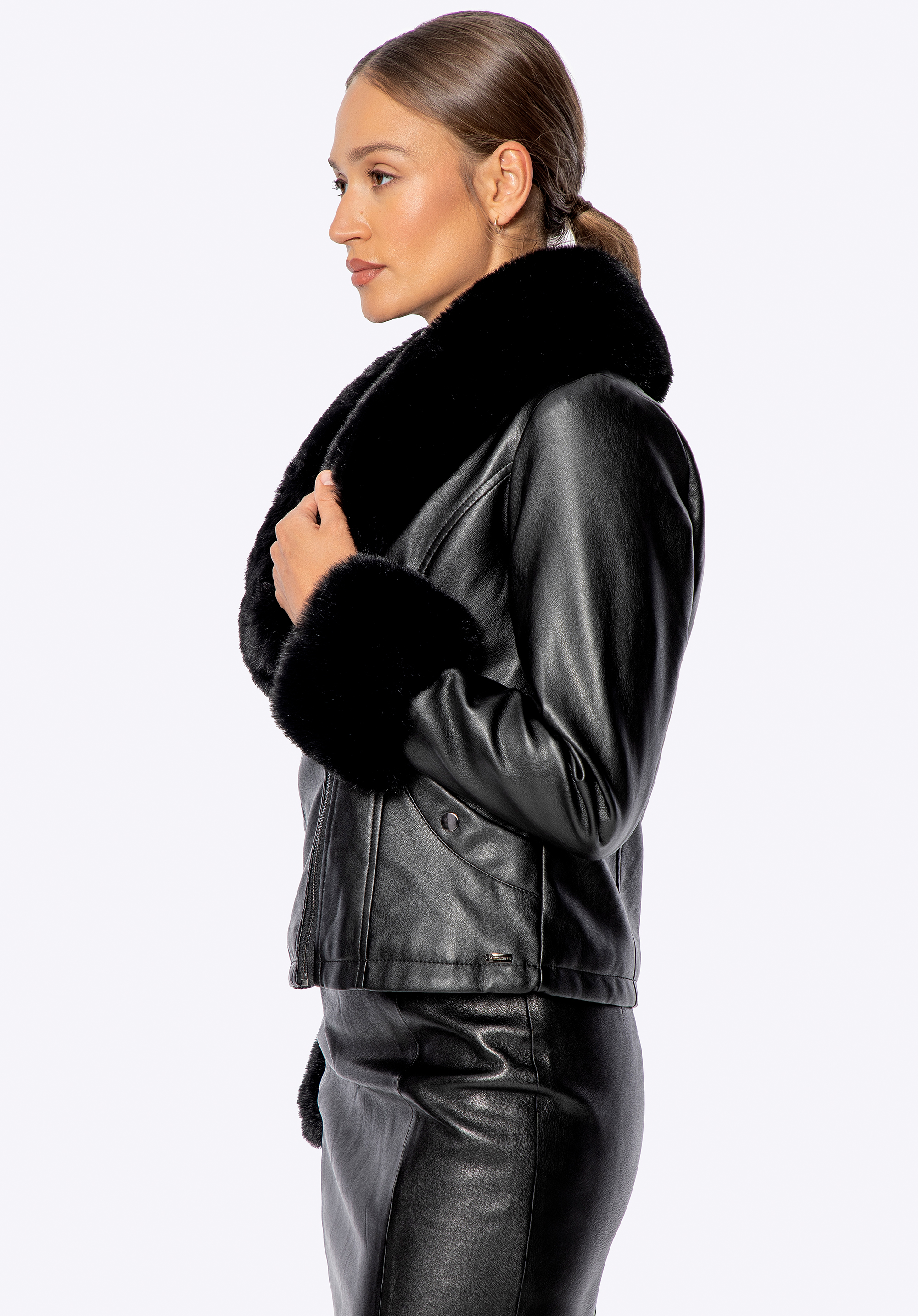 Modern formavilág találkozik az időtlen eleganciával ebben az egyedi ökobőr kabátban. Gondosan kidolgozva minden részletre kiterjedően, a stílusos megjelenést a mindennapi kényelemmel ötvözi. A tartós cipzáras rögzítés biztosítja a sima záródást, míg a funkcionális patenttal záródó zsebek biztonságban tartják a szükséges holmijaidat. A dizájnt plüss műszőrme gallér és mandzsetta teszi teljessé – egy csipetnyi ízléses és komfortos hangulatot kölcsönözve. Ha más hangulatra vágysz, egyszerűen hajtsd fel a gallért az elegáns hatásért.