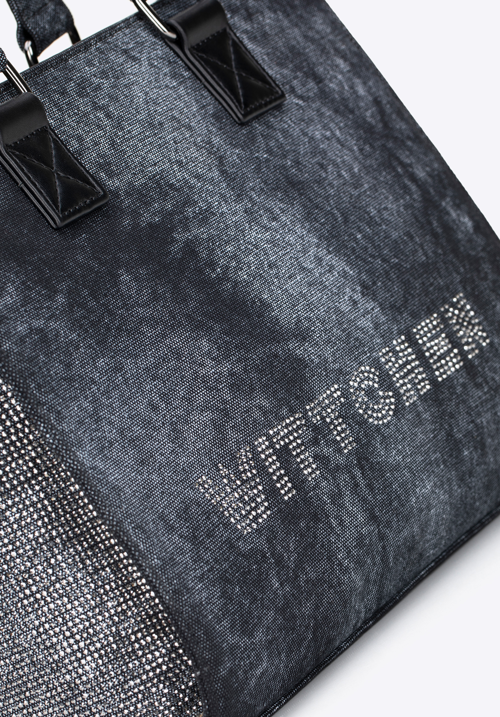 Válassz egy olyan kézitáskát, amely ötvözi az eleganciát, a praktikumot és a finom csillogást. Két fogantyúja megkönnyíti a kézben hordást, míg a levehető és állítható pánt lehetővé teszik a vállon való viselést a nagyobb sokoldalúság érdekében. A strasszokkal díszített oldalak könnyű, elbűvölő megjelenést kölcsönöznek, az elején található márkalogó pedig kiemeli a kifinomult dizájnt.