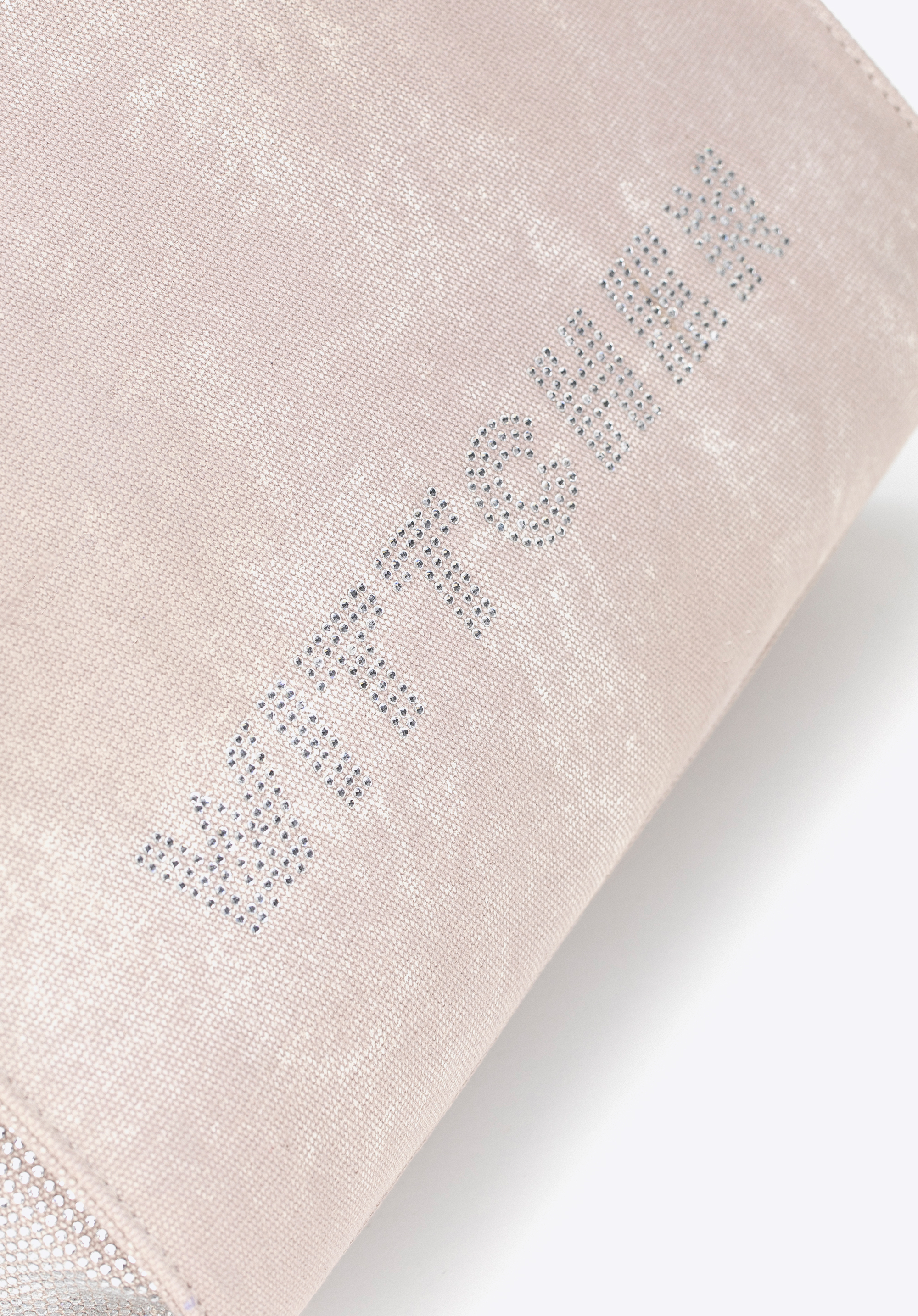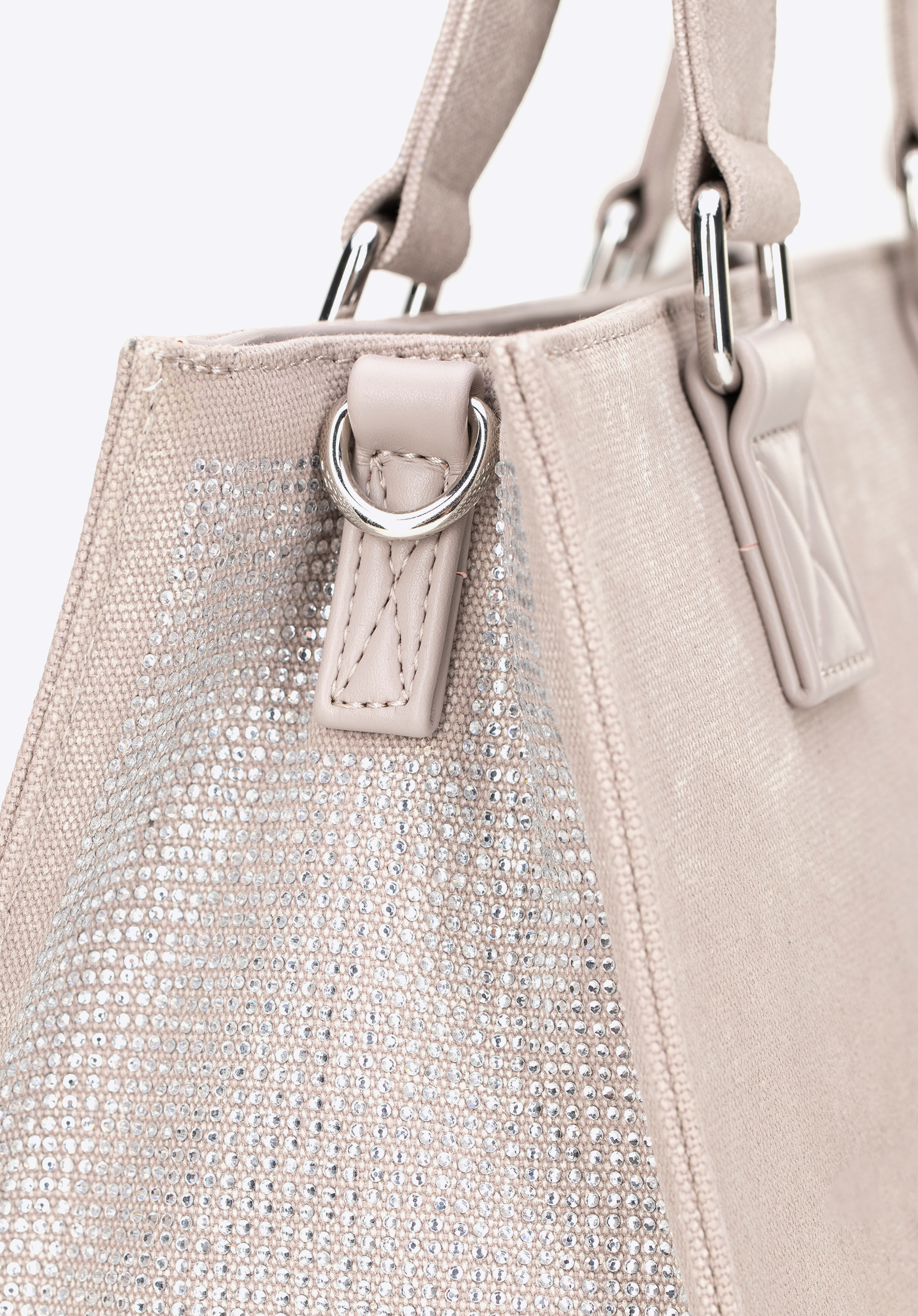Válassz egy olyan kézitáskát, amely ötvözi az eleganciát, a praktikumot és a finom csillogást. Két fogantyúja megkönnyíti a kézben hordást, míg a levehető és állítható pánt lehetővé teszik a vállon való viselést a nagyobb sokoldalúság érdekében. A strasszokkal díszített oldalak könnyű, elbűvölő megjelenést kölcsönöznek, az elején található márkalogó pedig kiemeli a kifinomult dizájnt.