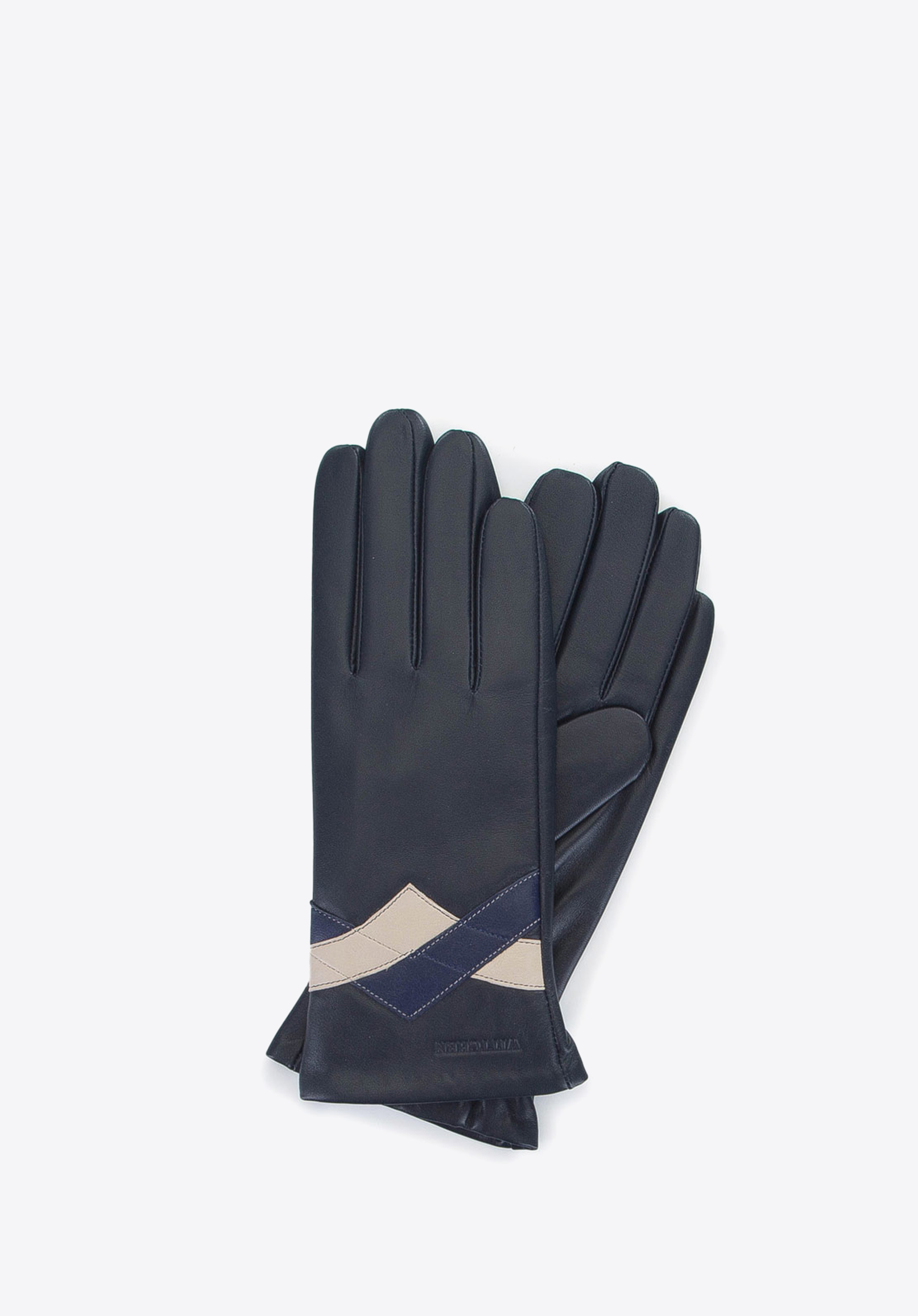 Bőrkesztyű modern változatban. Klasszikus szabásukat kontrasztos színű geometrikus minták törik meg. Alul egy kis hurok található, amely megkönnyíti a kesztyű fel- és levételét. A kontrasztos elemekkel ellátott bőrkesztyűk tökéletesen illeszkednek a divathoz és a klasszikus stílushoz egyaránt.