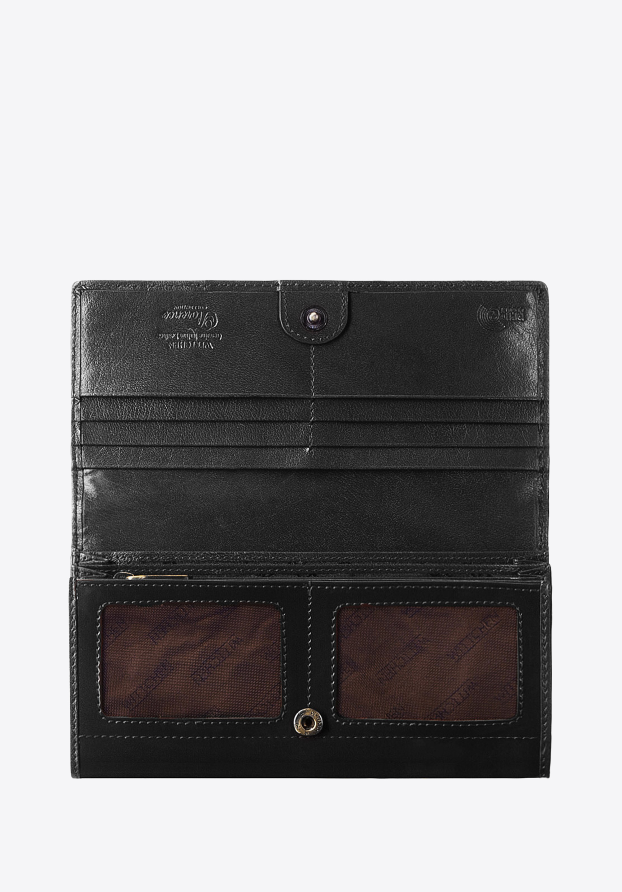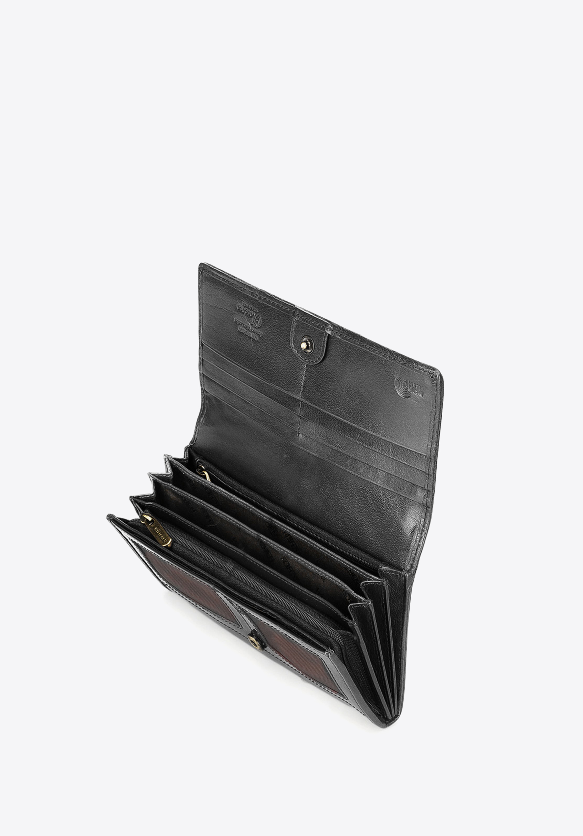 Nagyméretű női pénz- és irattárca fekete és bordó színben. E modell minden részéhez tervezőink a legmagasabb minőségű anyagokat használták. Ezért ez egy elsőosztályú, funkcionális kiegészítő a legjobb minőségű anyagokból. A hölgyek biztosan értékelik az irattárca kártyavédő RFID funkcióját és átgondolt zsebrendszerét. Óarany színű fémdíszítéseinek köszönhetően az irattárca vintage hangulatban nyújt eredeti összhatást.