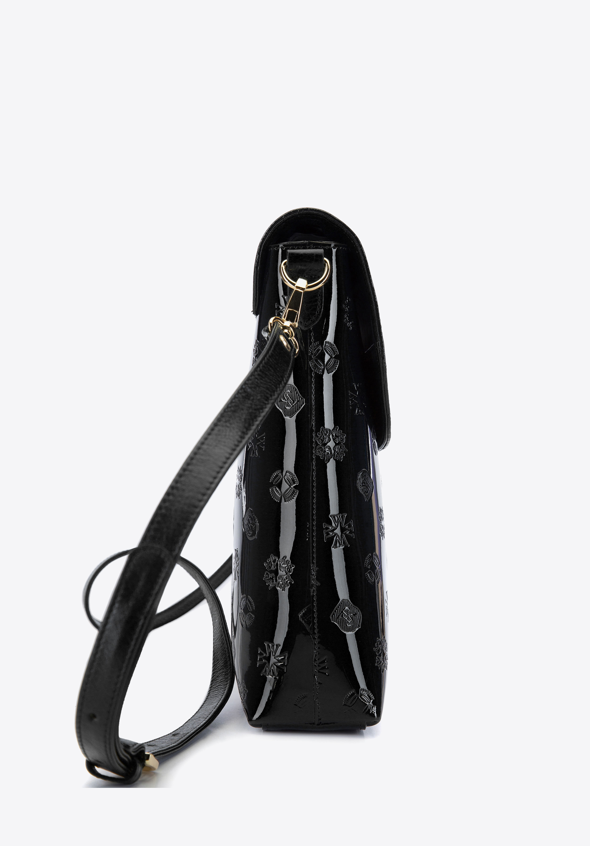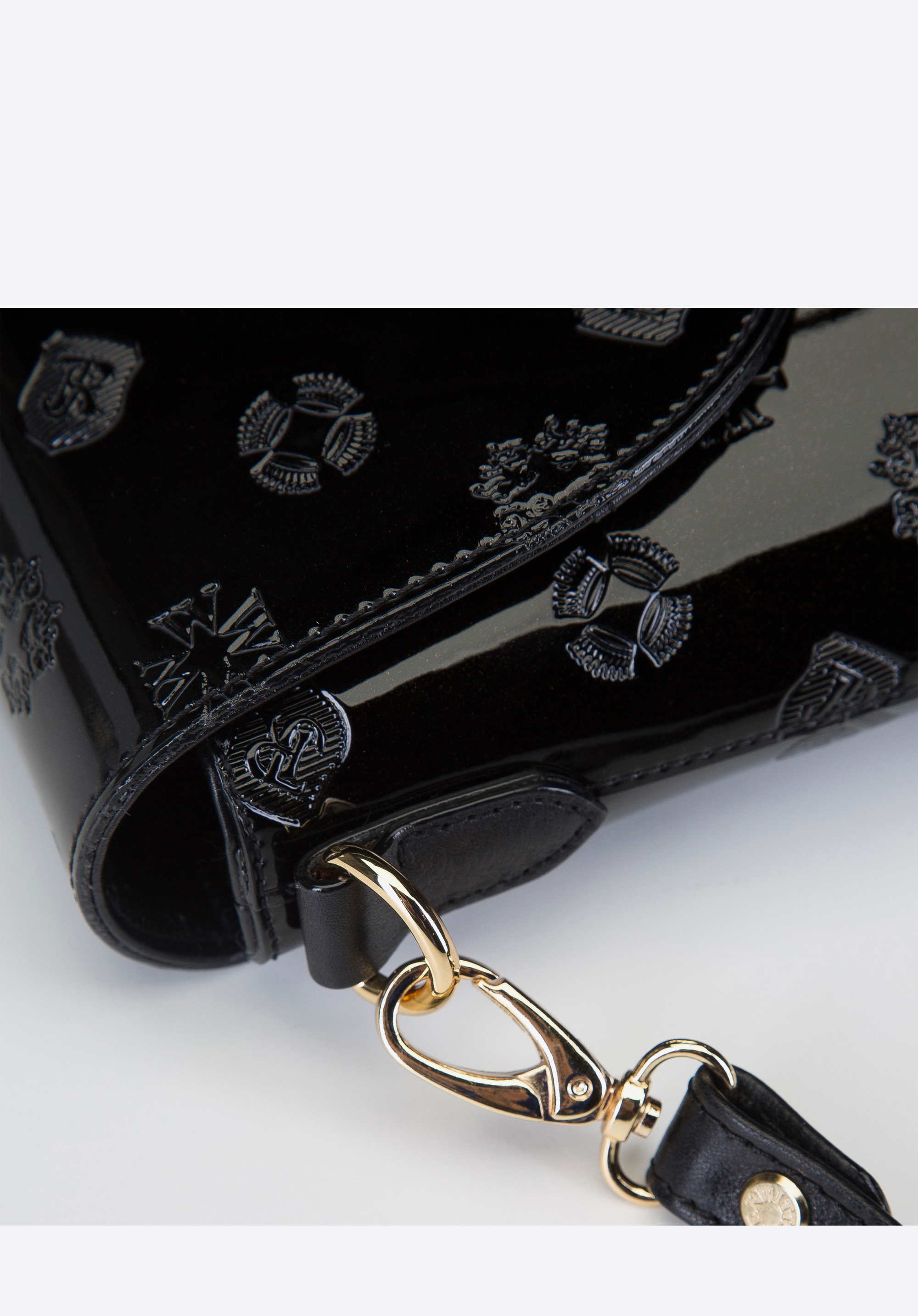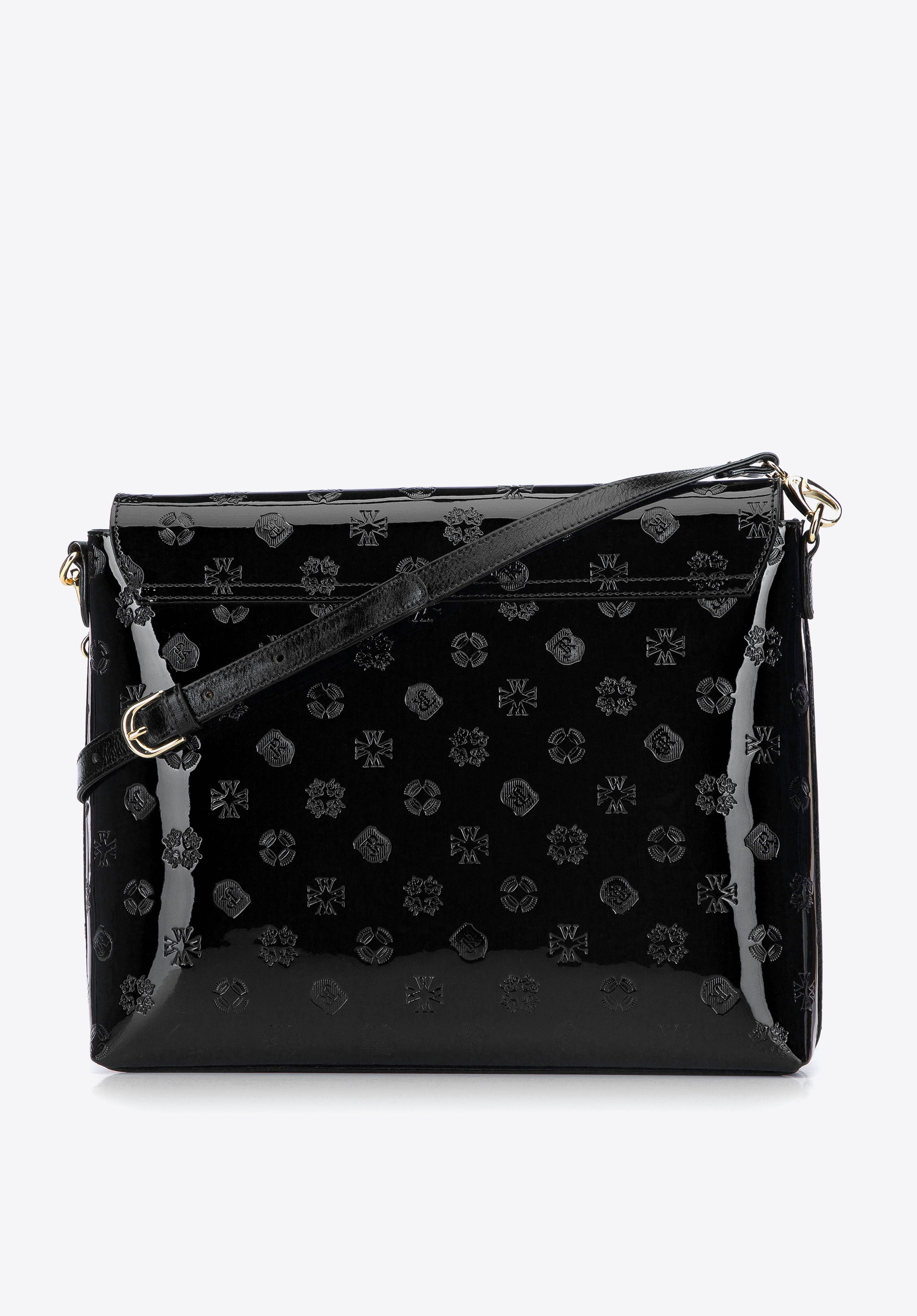 Női levéltáska lakkozott bőrből monogrammal és szalaggal.