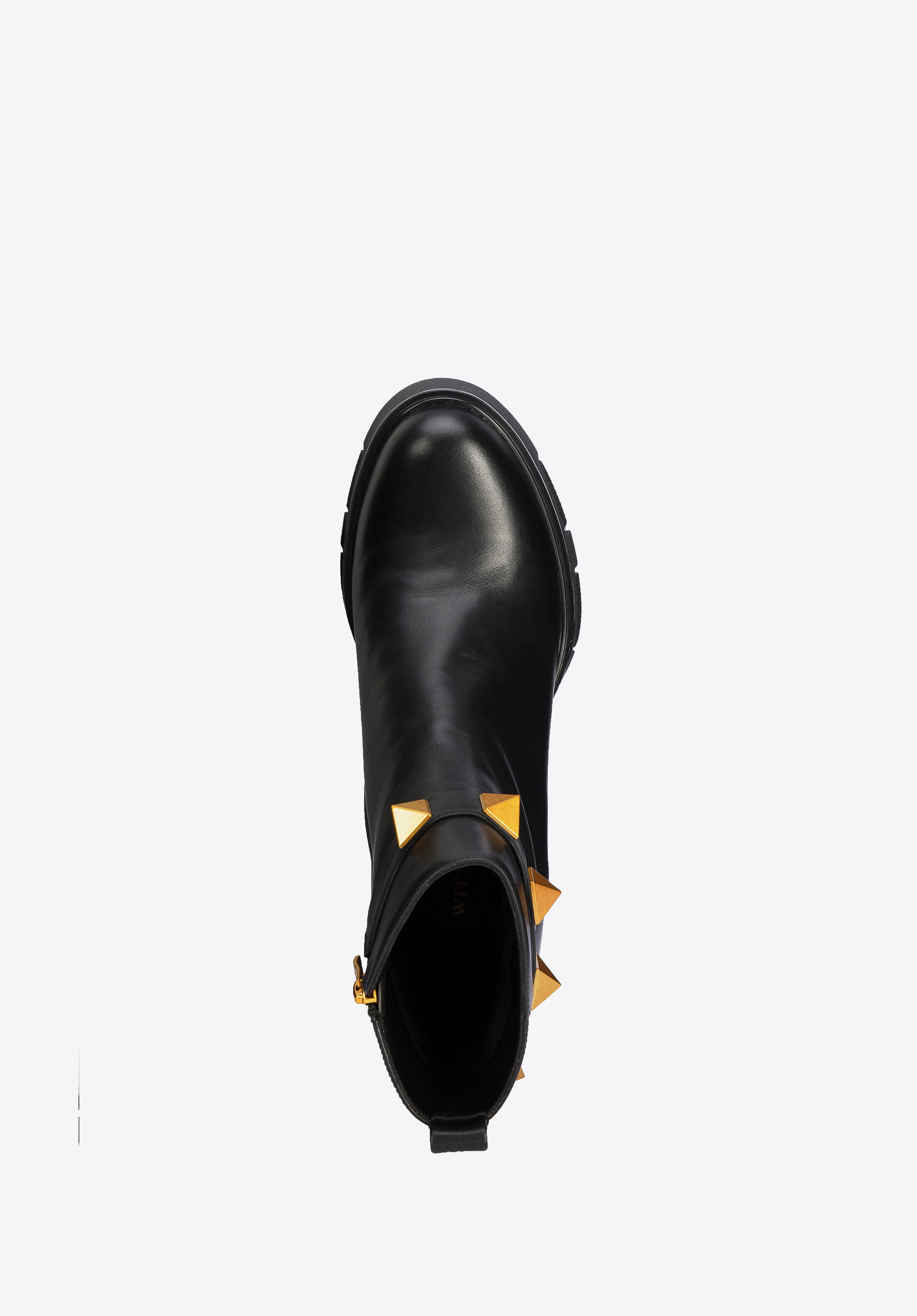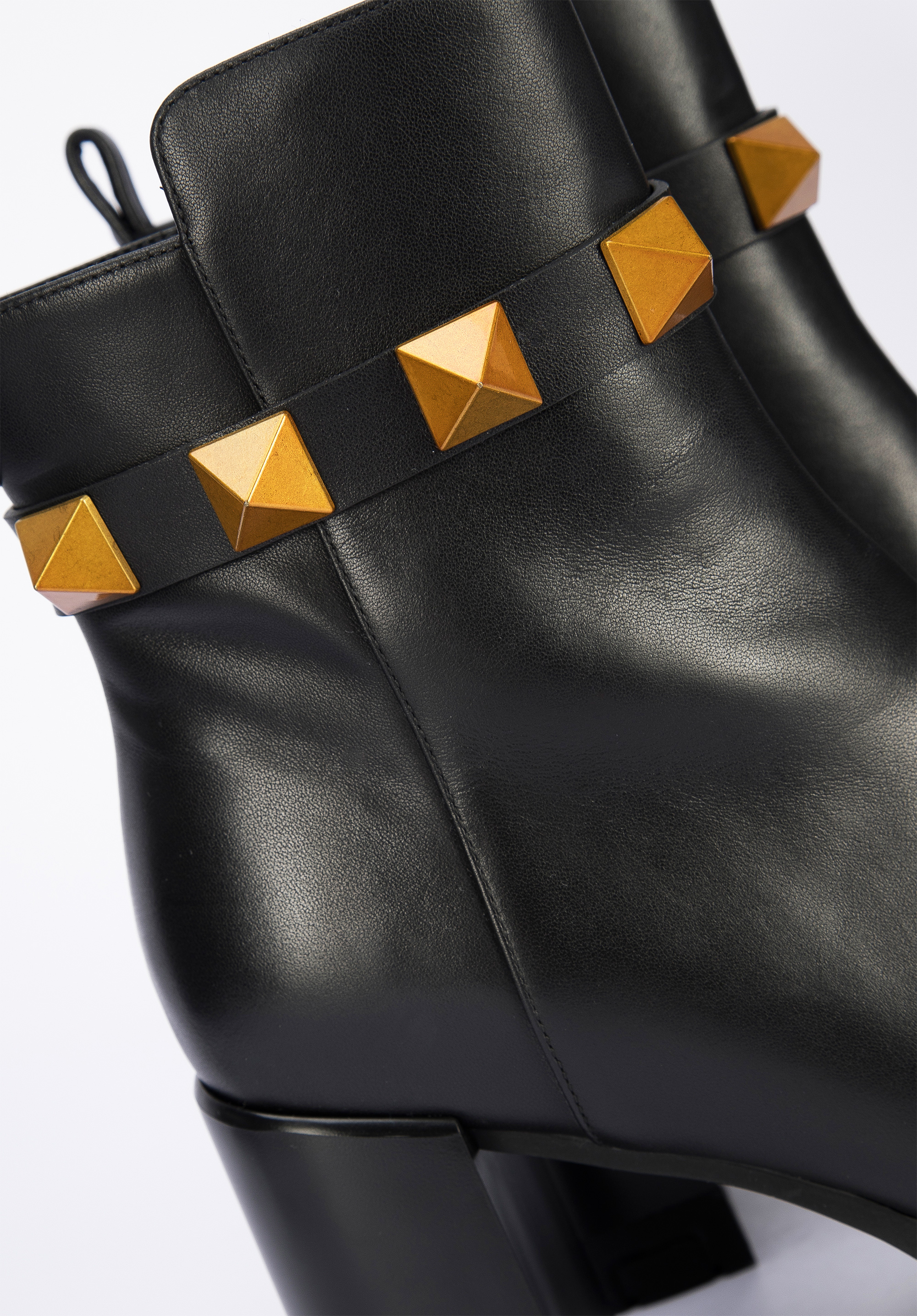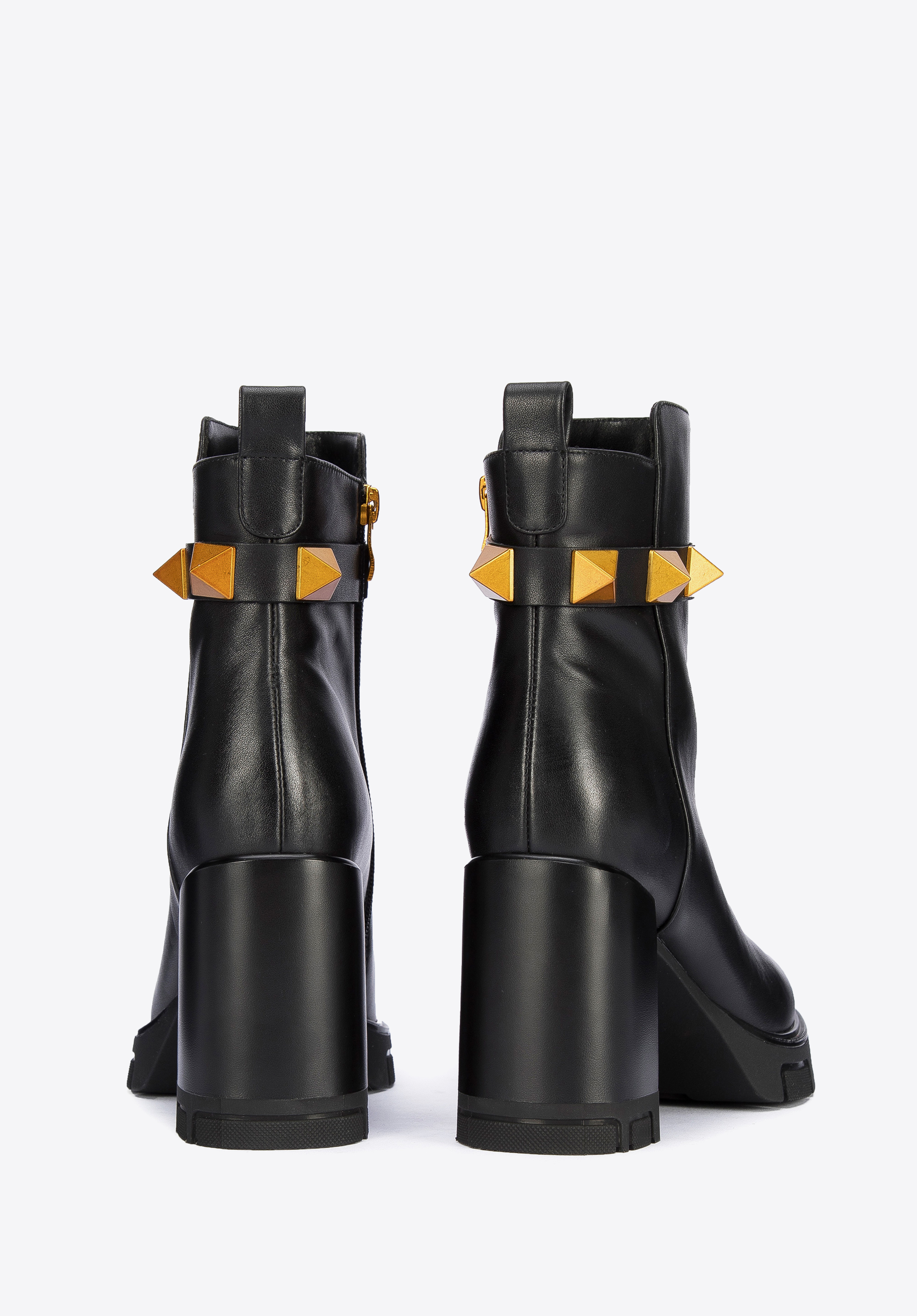A szegecselt pánt a vádli magasságában, új jelleget kölcsönöz a cipőnek.