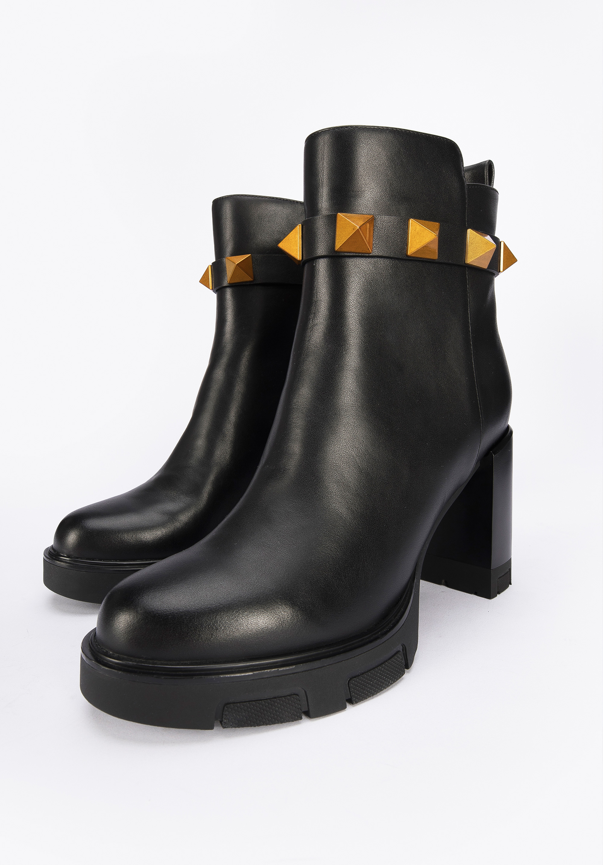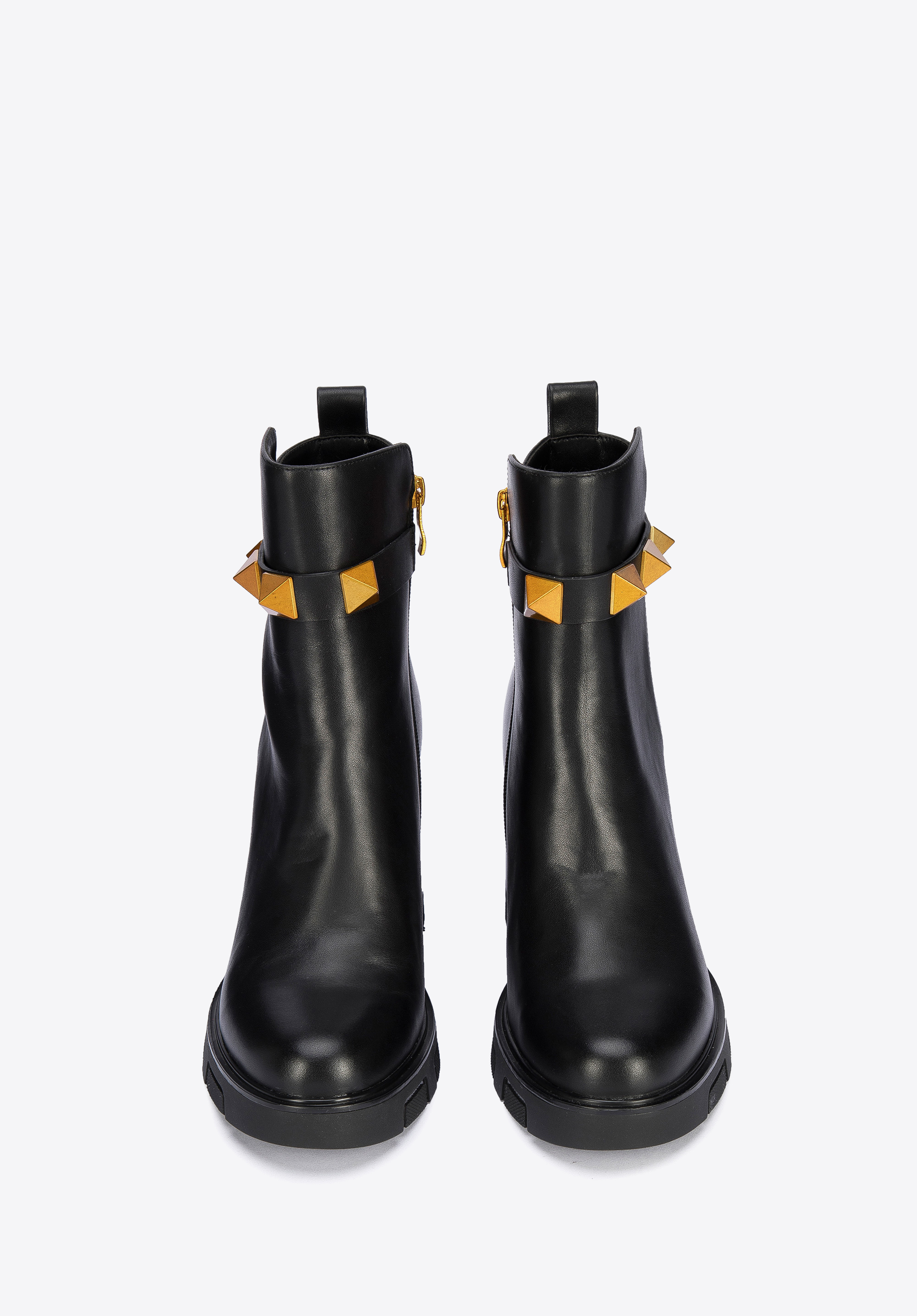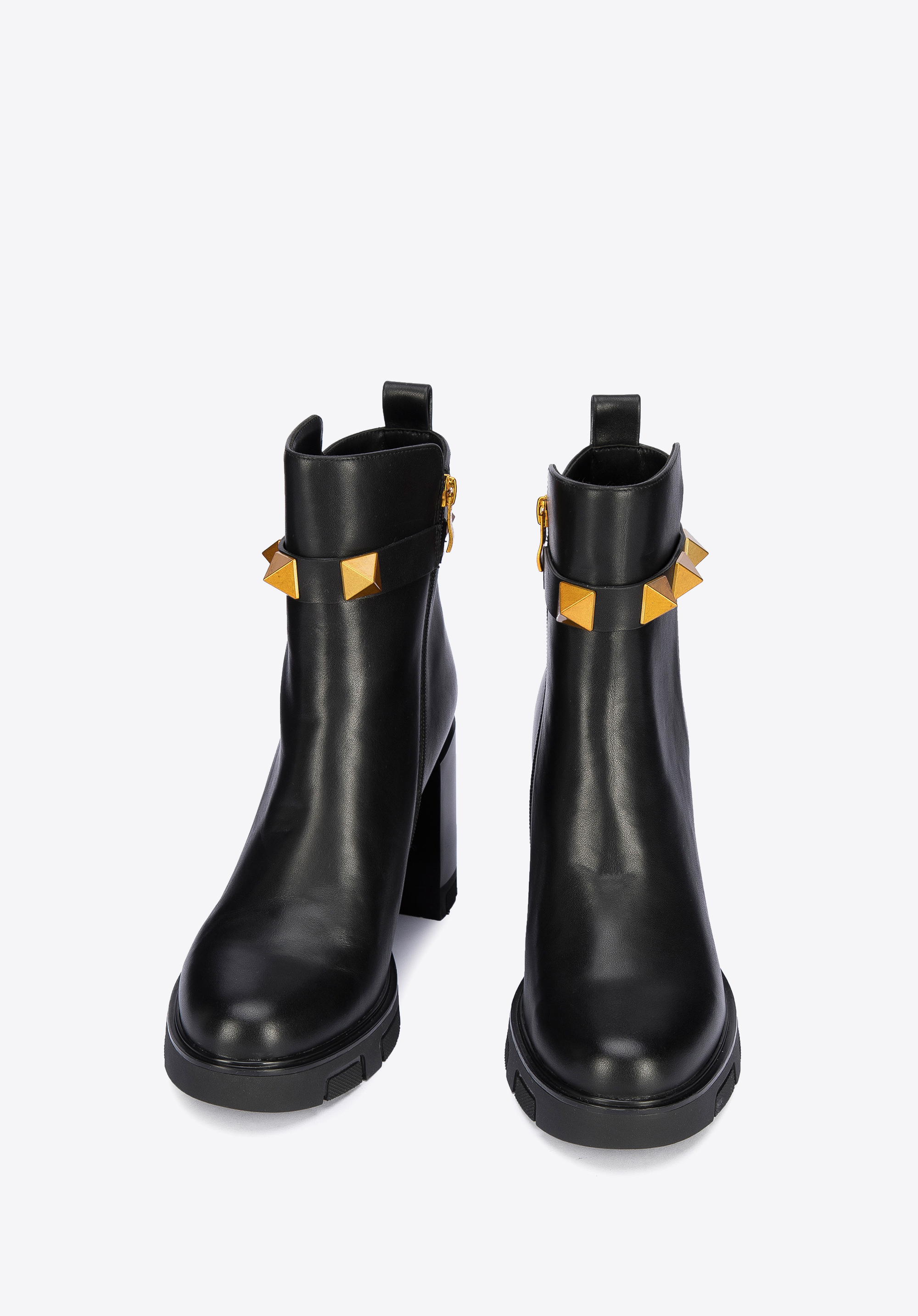 A szegecselt pánt a vádli magasságában, új jelleget kölcsönöz a cipőnek.