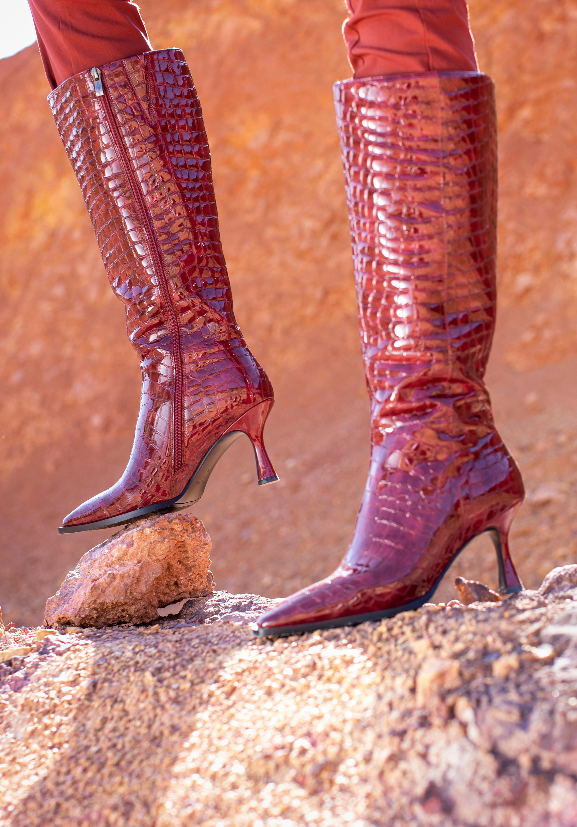 Ez az egyedi csizma karaktert kölcsönöz minden stílusnak. Krokodilbőr textúrájú lakkbőrből készült. Az időtlen dizájn enyhén kiszélesedő tűsarokkal szinte minden stílust kiegészít. Ezen kívül a hegyes orr karcsúsítja a lábat, a velúr talpbetétnek köszönhetően pedig kényelmesen sétálhatsz bennük több órán át. Kiszélesedő ruhával remekül mutatnak majd, de egy testhezálló nadrághoz is tökéletes választás. Ez a magassarkú női bőr csizma remek választás minden nő számára, aki szereti az egyedi kiegészítőket.