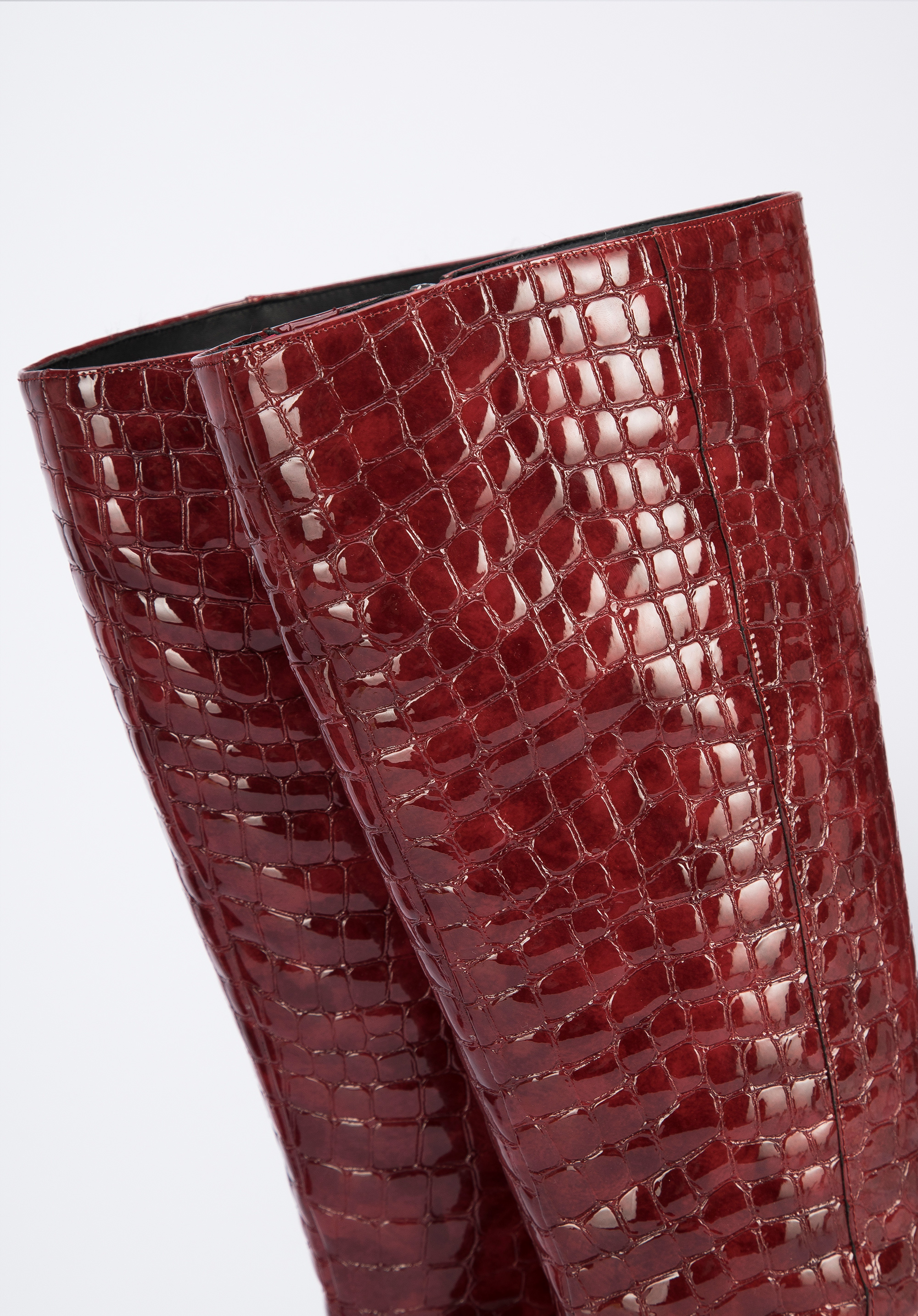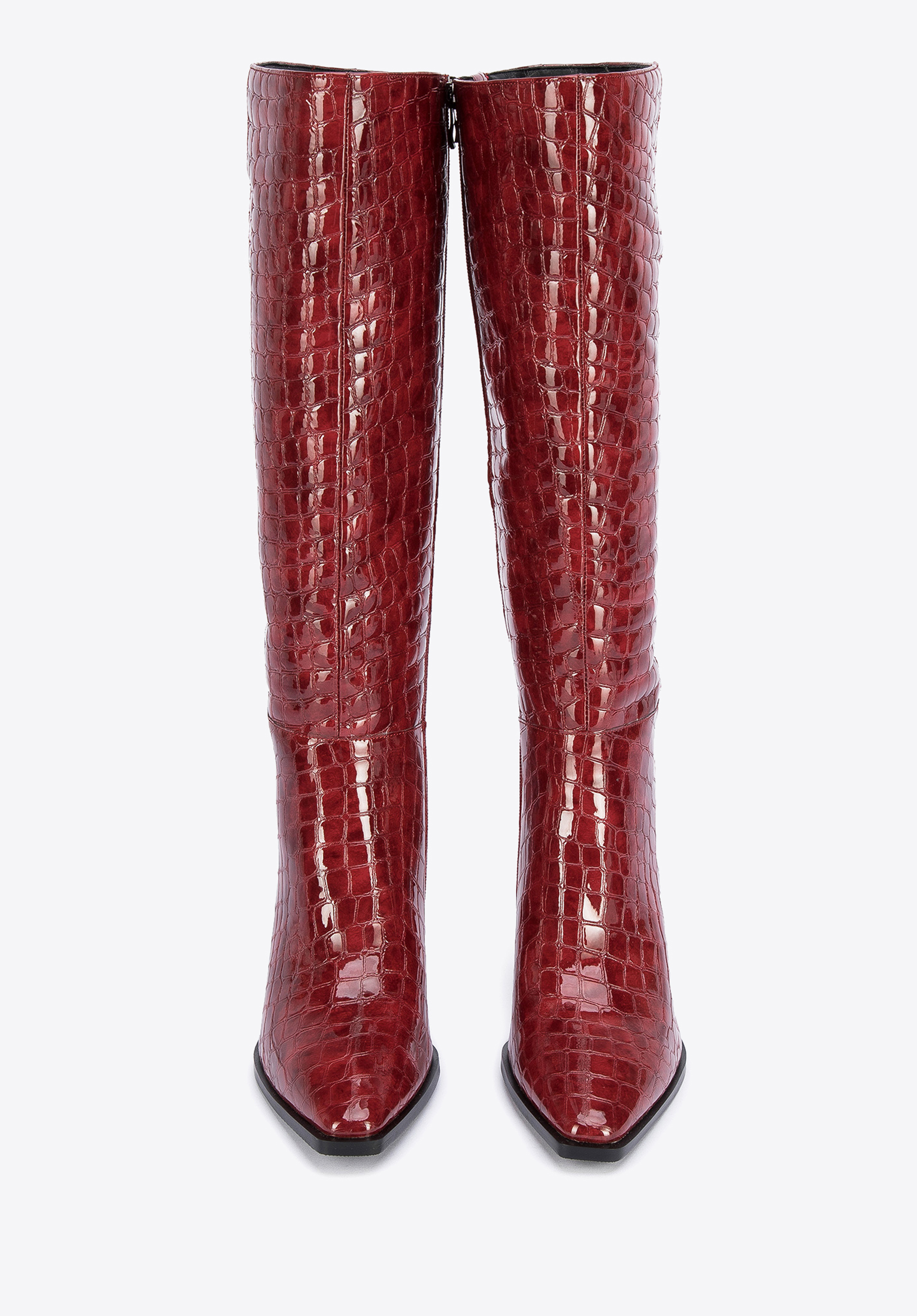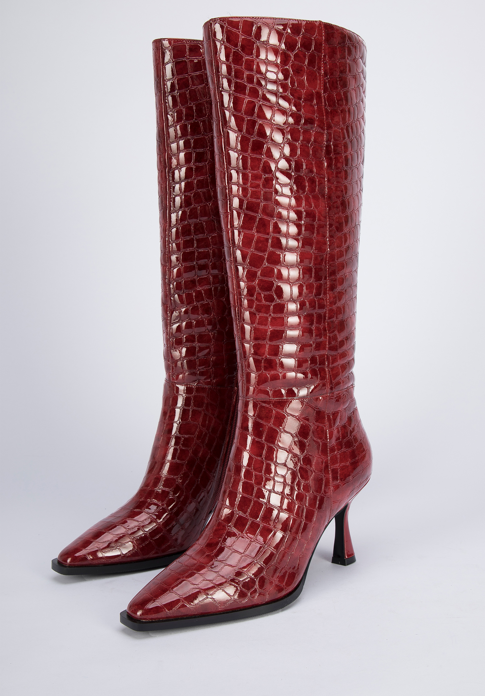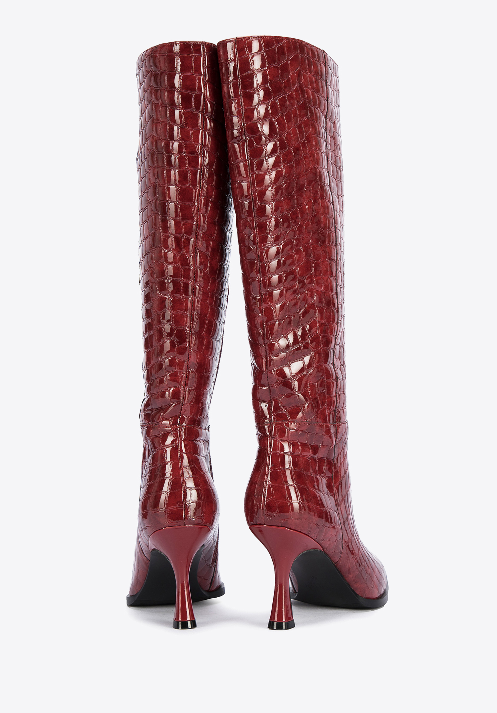 Női magassarkú bőr csizma krokodilbőr textúrával sötétvörös