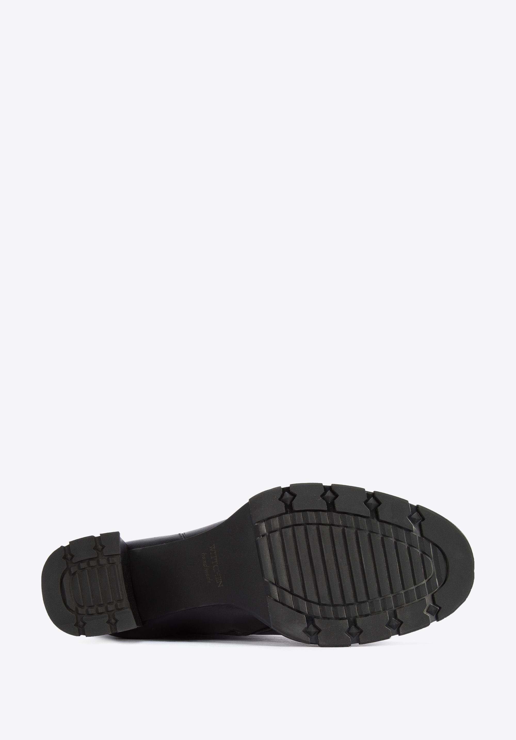 A klasszikus fazont vádli magasságában egy egymásba fonódó „W” betűkkel díszített pánttal tettük változatossá; utalva a WITTCHEN névre.Ezenkívül