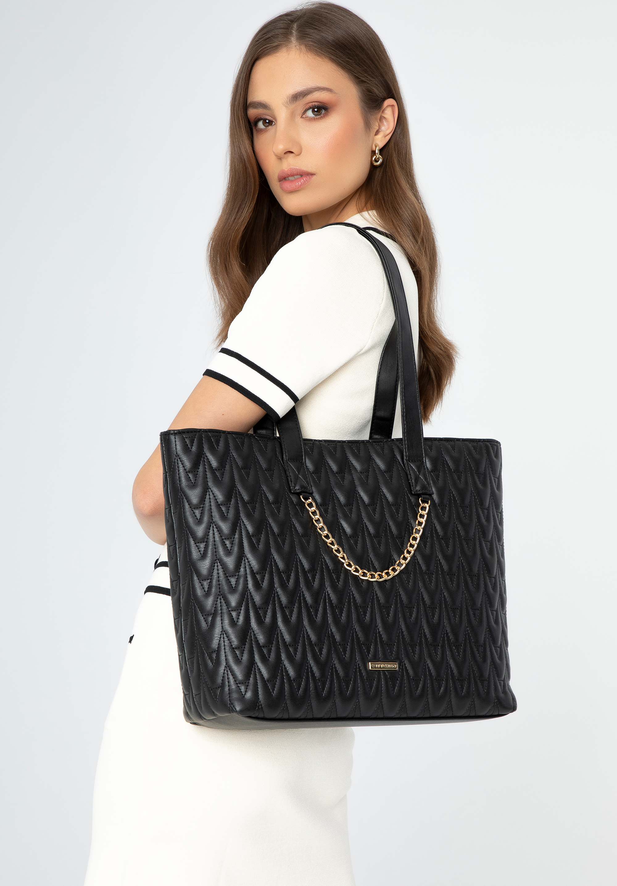 - Részletek: Geometrikus, steppelt minta, előlapon a gyártó logója és a dekoratív láncrészlet stílusos karaktert ad a táskának.