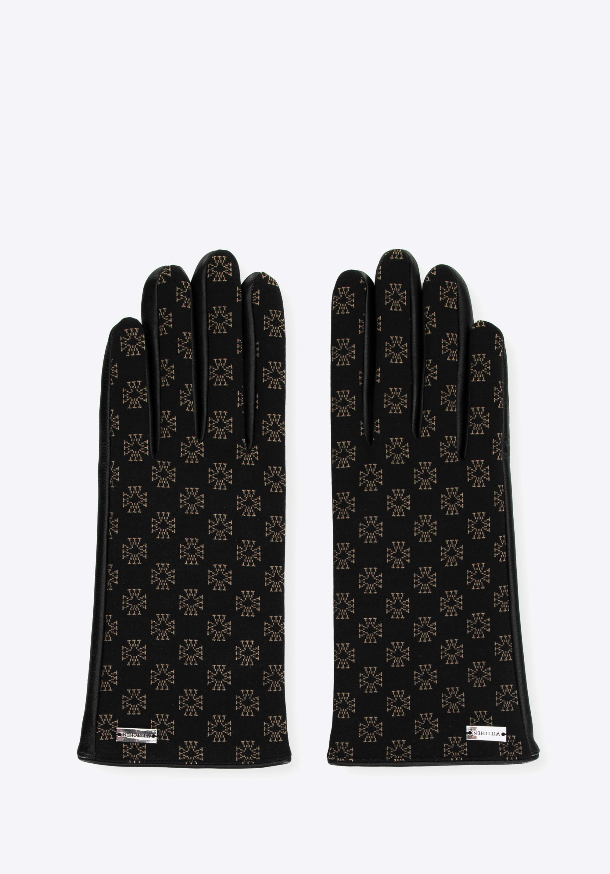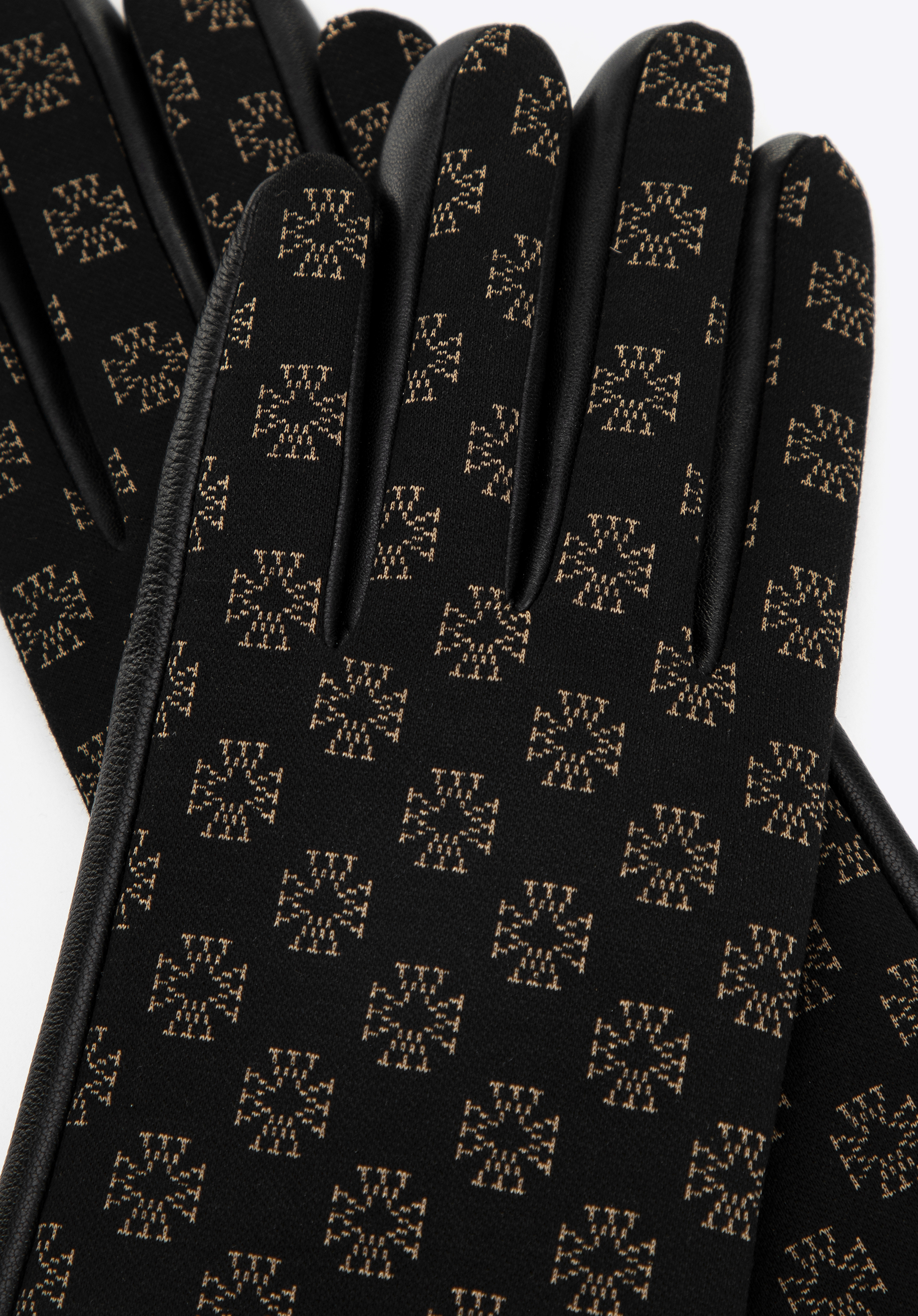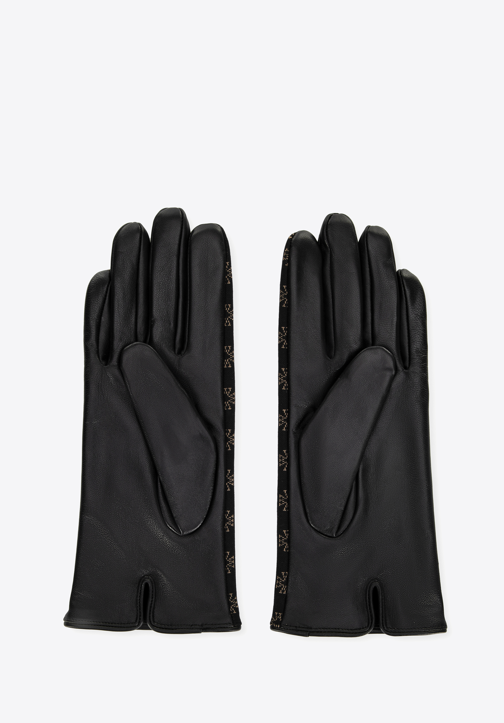 Ez a kiváló minőségű természetes bőrből és poliészterből készült női kesztyű az elegancia és a funkcionalitás tökéletes kombinációja. A külső oldalt finom márkás monogram díszíti, amely egy csipetnyi luxust ad, amely tökéletesen kiegészíti bármely ruhát. A szellőzőnyílás megkönnyíti a fel- és levételüket, praktikus kényelmet biztosítva a mindennapi viselethez. Ezen túlmenően a belső oldalon diszkréten elhelyezett kis logó kiemeli a termék egyedi karakterét.