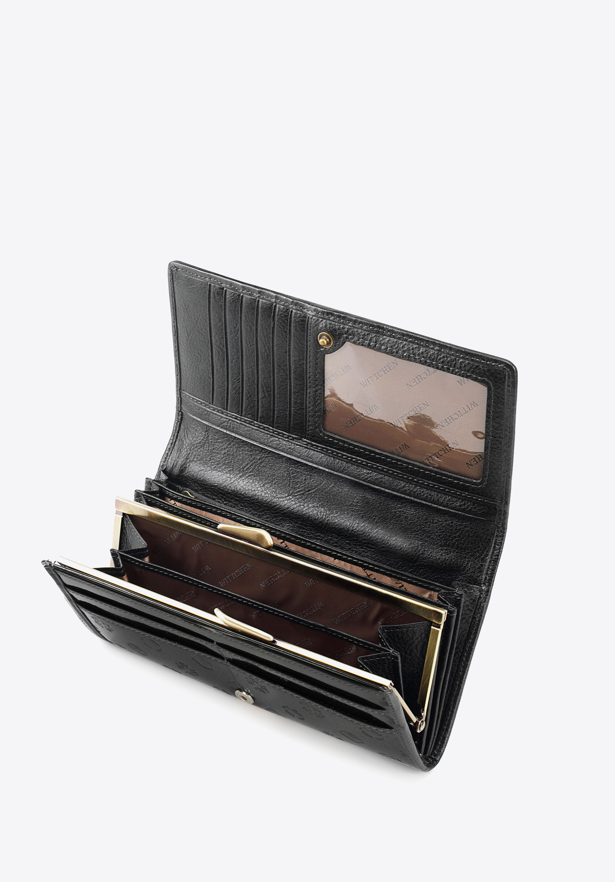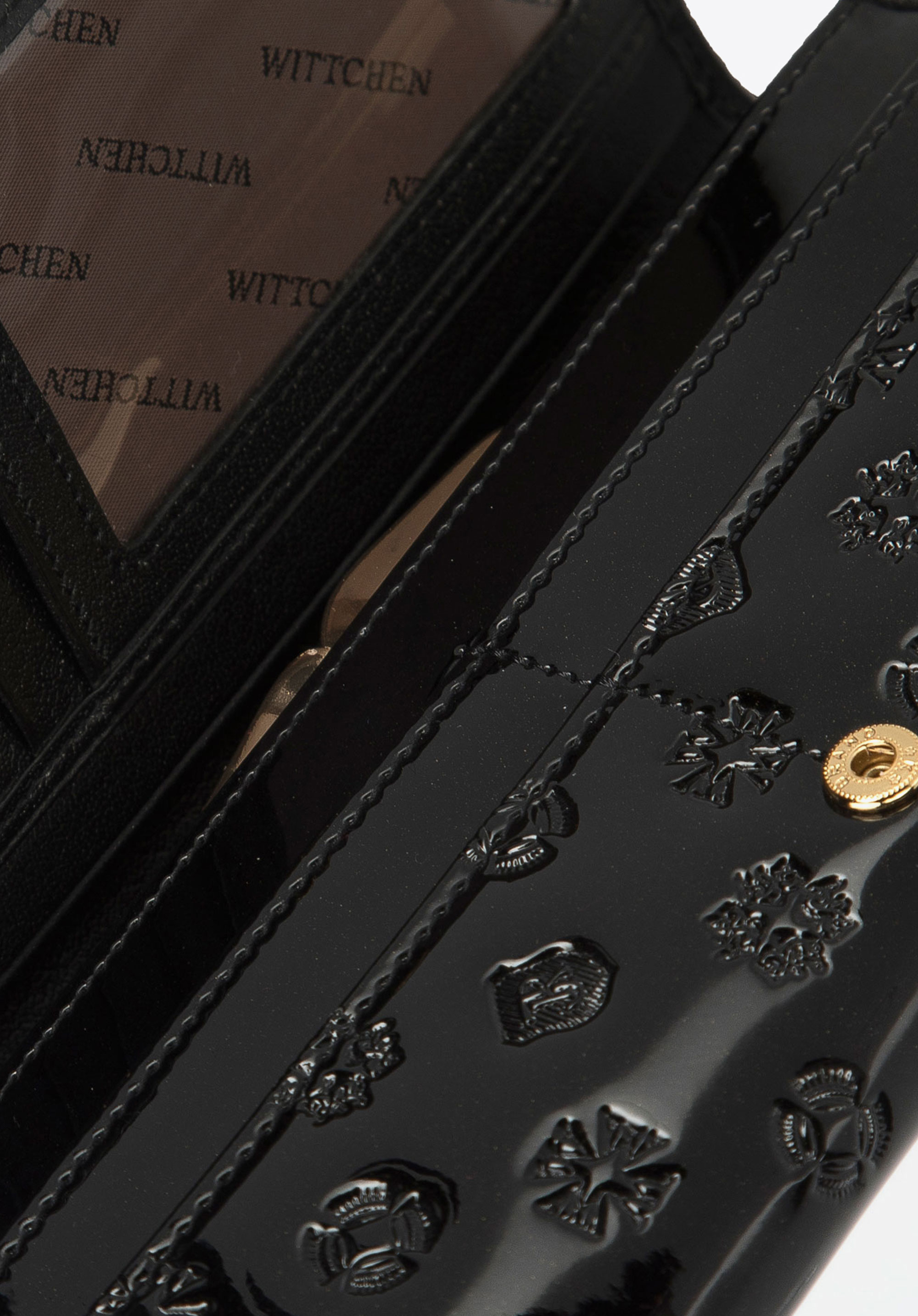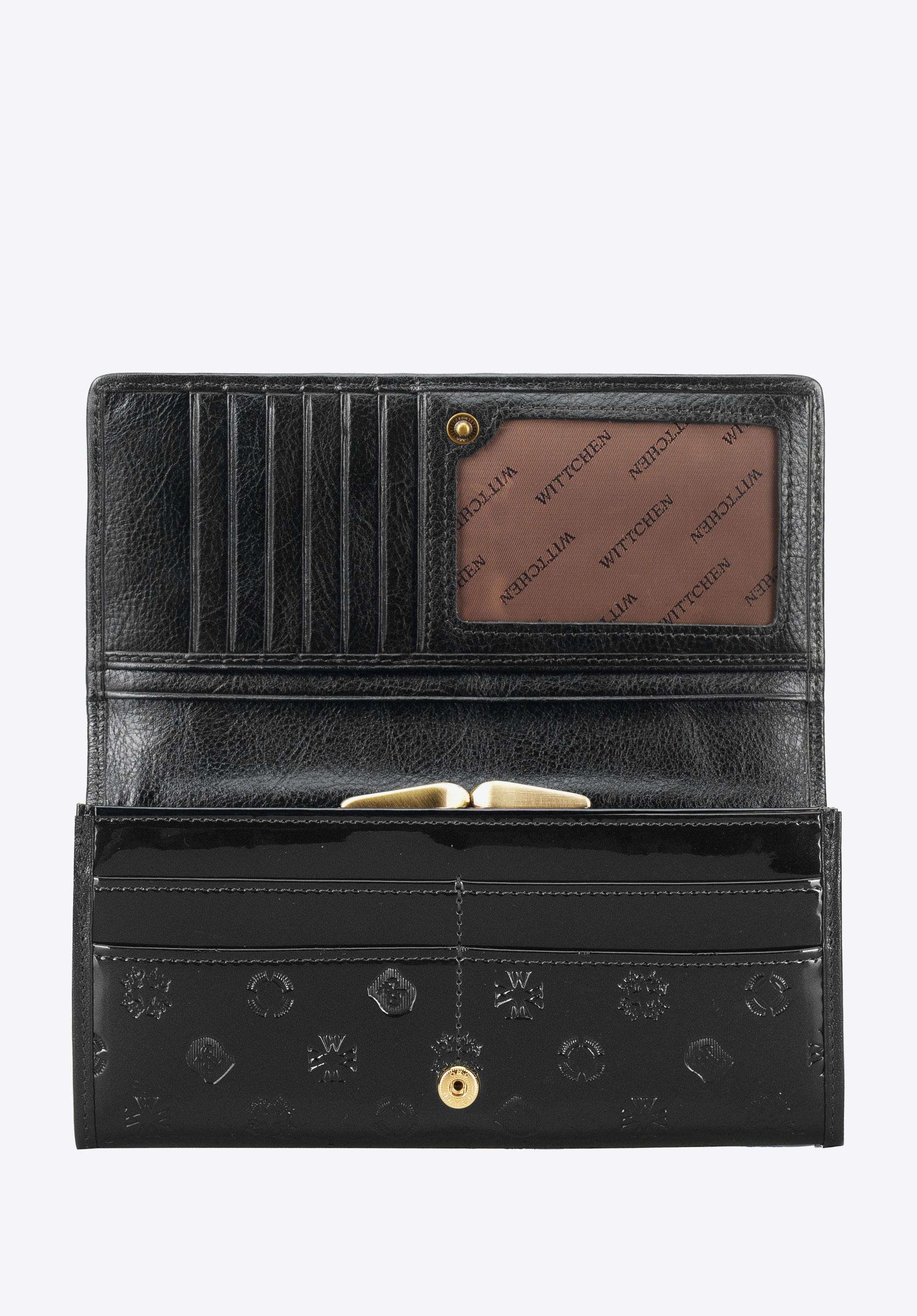 Ez a pénztárca minden elegáns nő egyedi kiegészítője. WITTCHEN monogrammal dombornyomott, lakkozott természetes bőrből készült. A pénztárca belseje jól rendezett, több nyitott zseb, egy csatos érmezseb, több kártyanyílás és egy átlátszó zseb található a fényképnek vagy jegynek. A pénztárca bélése RFID technológiával van felszerelve, amely blokkolja a kártyák adatainak leolvasásának lehetőségét. Ez a modell meglehetősen nagy, de nagyon praktikus. Ez a szalaggal díszített hosszúkás fazonú, lakkozott bőr pénztárca egy időtlen modell, mely hosszú éveken át veled tart majd.