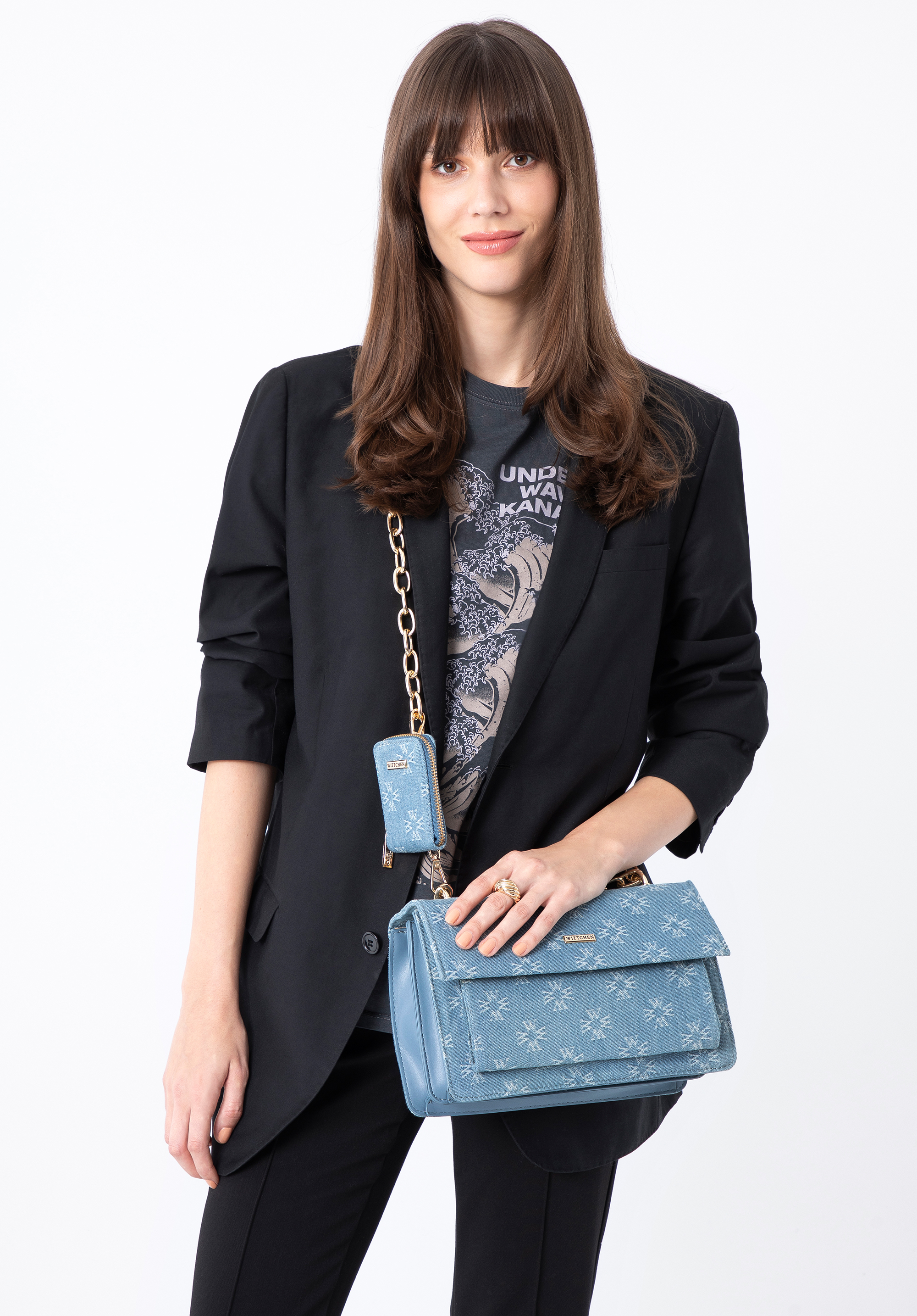 Ezzel a stílusos kiegészítővel sok figyelmet vonzol majd. WITTCHEN monogramos farmer bevonat fedi a táska elejét és fülét. Az oldalak kiváló minőségű ökológiai bőrből készültek. A belsejében két rekesz található, amelyek megkönnyítik a rendtartást és az illeszkedést: egy pénztárca, egy telefon, zsebkendők, kézkrém, egy kis naptár és néhány apróság. Hordhatod tetszés szerint: a válladon vagy a kezedben a hosszú lánc leválasztása után. Ez a modell szinte minden sima ruhát változatossá tesz és karaktert kölcsönöz kedvenc chinodnak és pólódnak. A női monogramos farmer crossbody táska egy divatos kiegészítő, amelyet sok évszakon át viselhetsz.