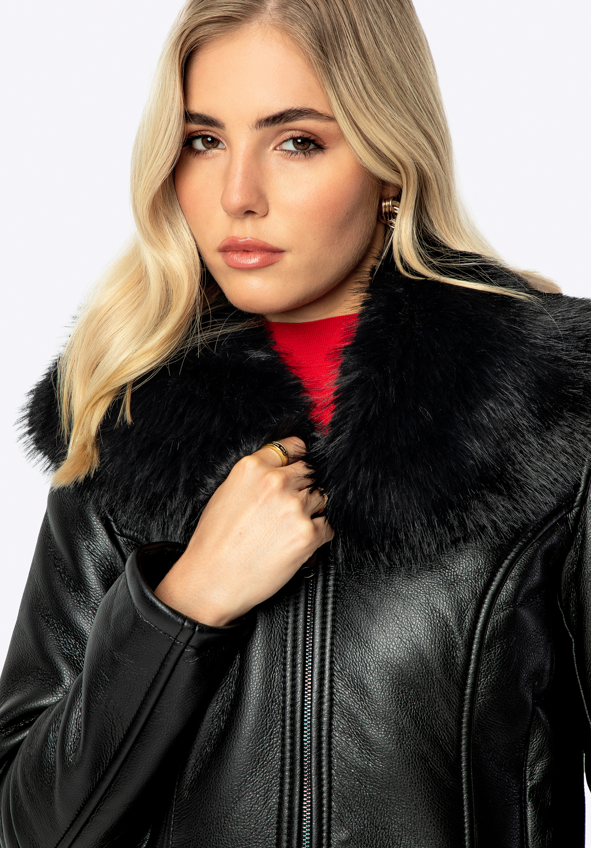 Női műbőr kabát prémes gallérral