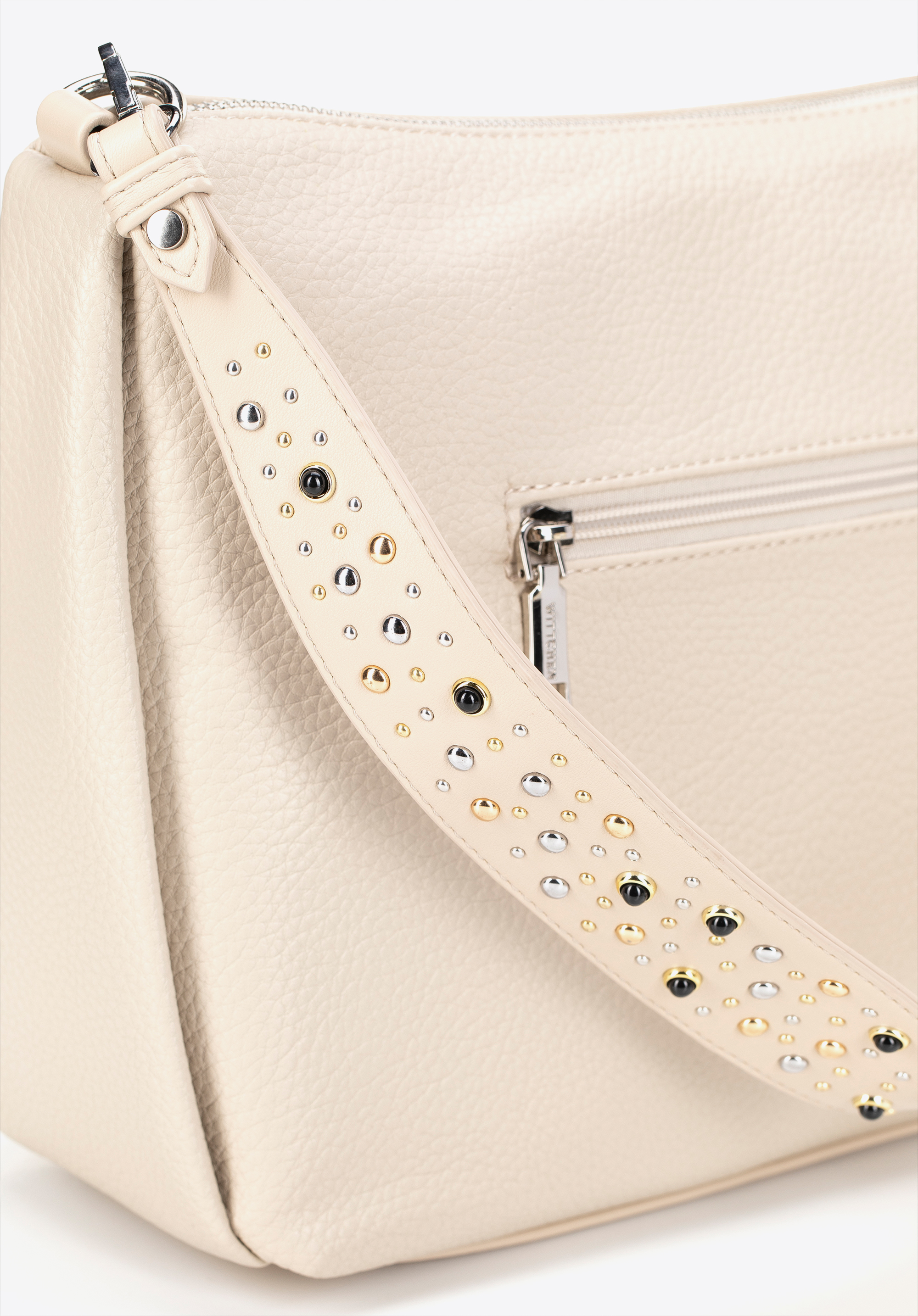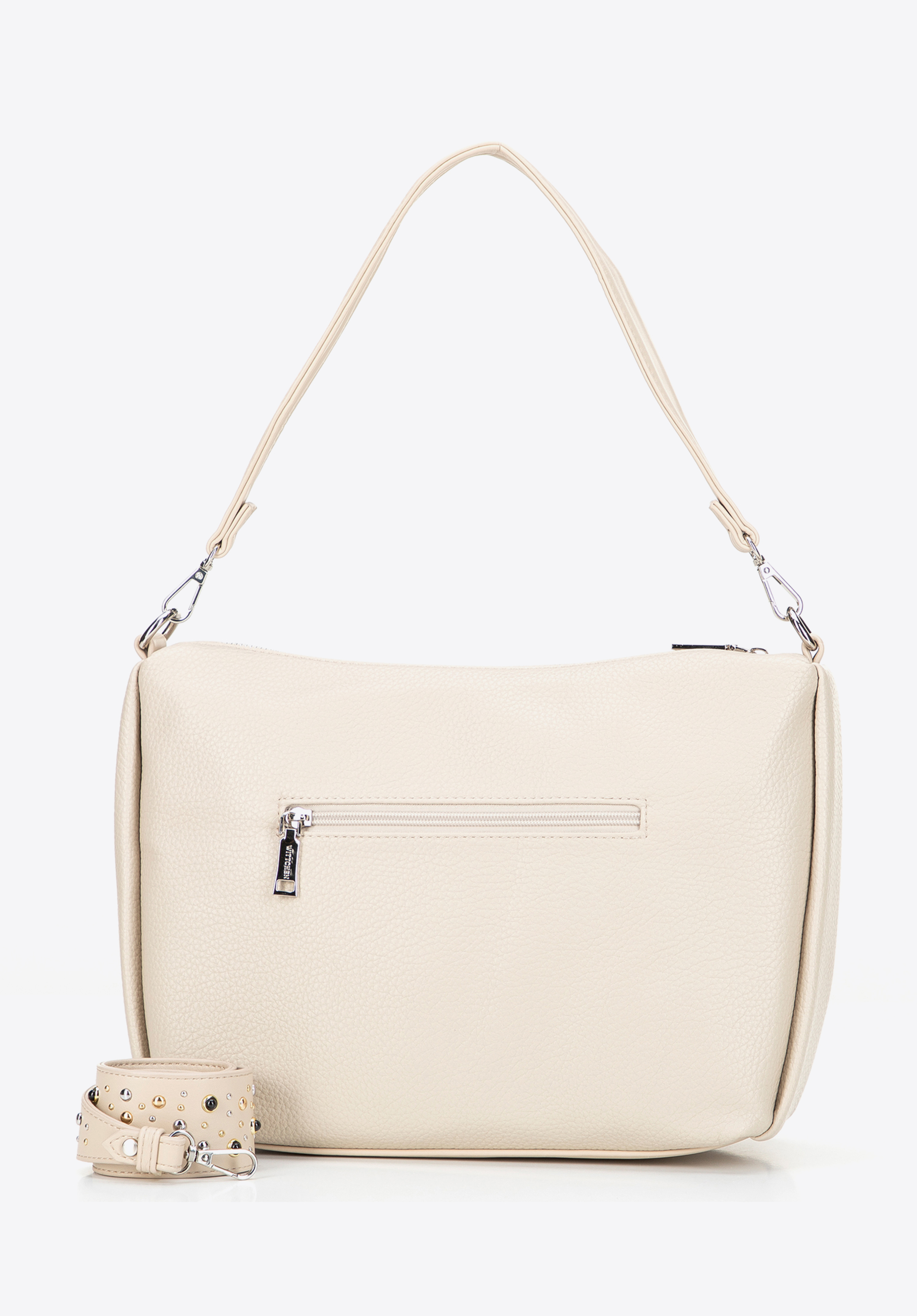 - Kényelmes viselet: Két levehető fogantyú, köztük egy díszes szegecsekkel díszített, lehetővé teszi a kézitáska hordozásának beállítását, és egyéniséget kölcsönöz az öltözékének.