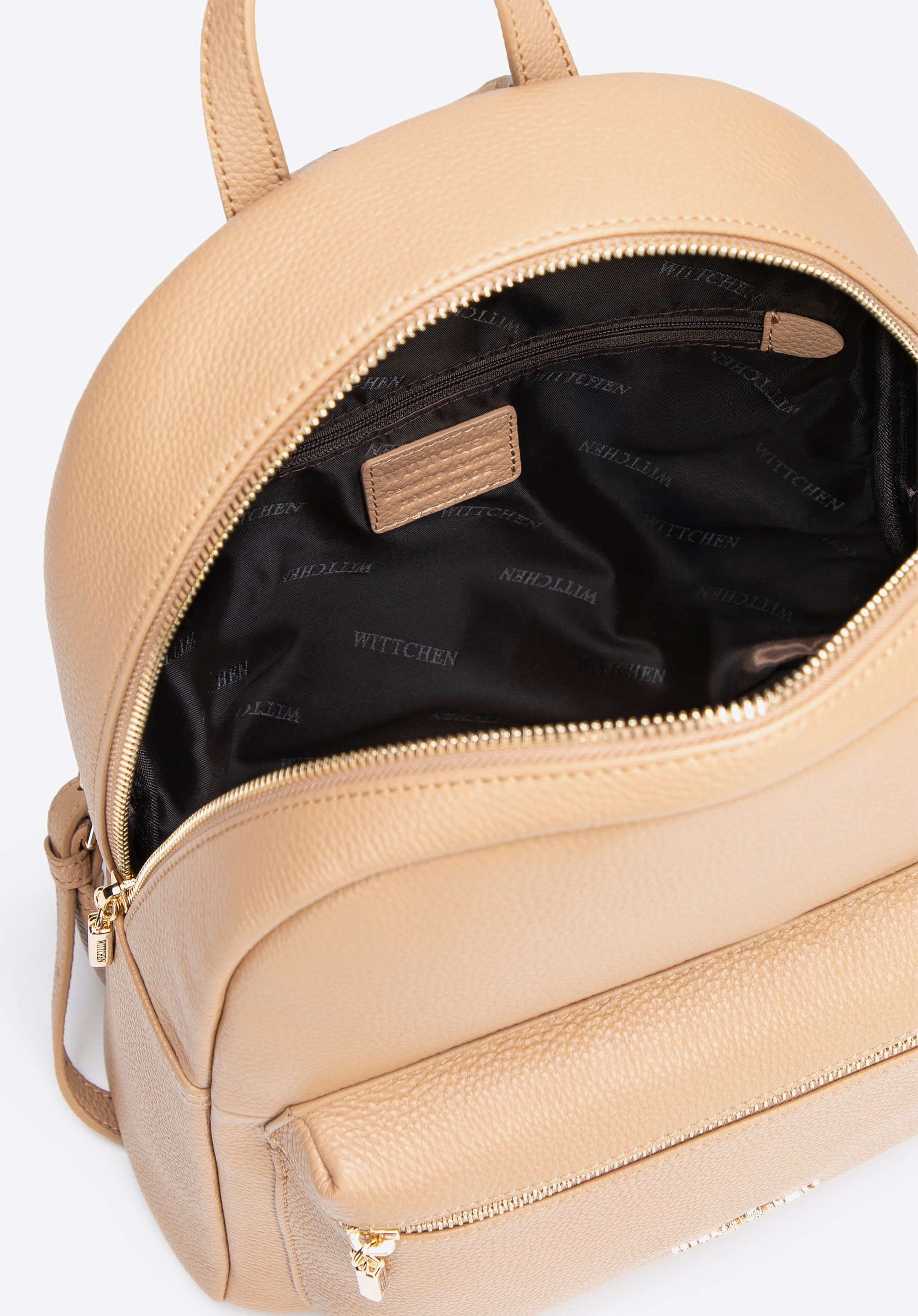 Ez a női hátizsák tökéletes választás, ha stílusos megjelenésre és olyan kényelmet keresel, amelyet minden nap értékelni fogsz. Természetes, kavicsos szemcséjű bőrből készült , kifinomult, időtlen hangulatot áraszt, amely remekül illik a városi öltözékekhez és a klasszikusabb megjelenésekhez egyaránt. A műbőr részletek – a fülek, a felső fogantyú, a pántok és a szegélyek – könnyű, modern megjelenést kölcsönöznek. Az állítható vállpántok segítségével megtalálhatod a tökéletes illeszkedést, míg a praktikus zsebek mindent kézközelben tartanak.