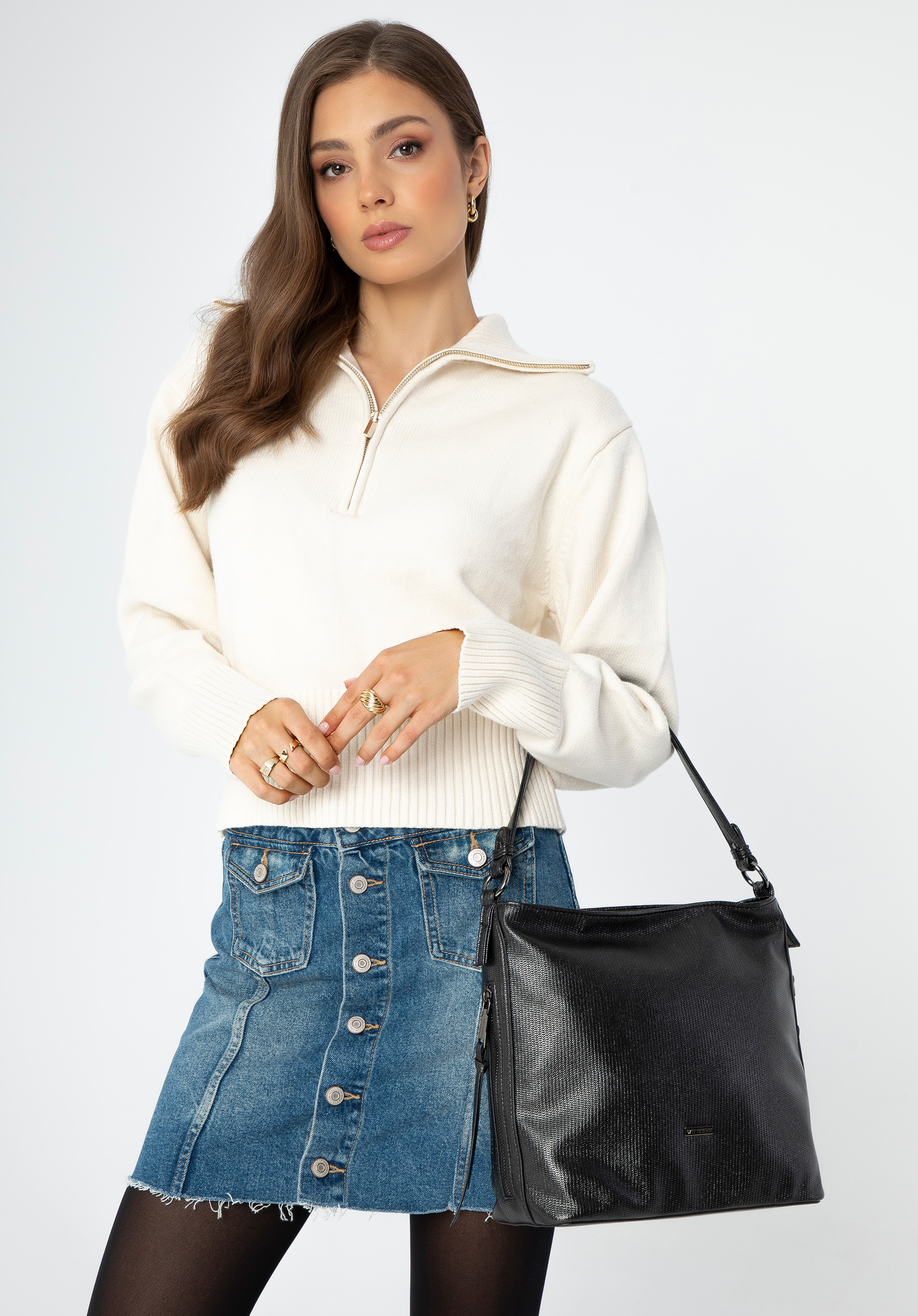 Ismerd meg az elegáns és funkcionális kézitáskát, amely forradalmasítja a mindennapok stílusát. A fényes öko-bőrből készült válltáska modell elegáns és modern megjelenést kölcsönöz. Az egykamrás belső tér tágasságot és rendet garantál, így könnyedén rendszerezhetsz minden lényeges dolgot. A párnázott alj biztosítja a táska stabilitását, így az kifogástalanul néz ki. A stílusos fogantyúnak köszönhetően kényelmesen hordozható akár a vállon, akár a kézben, az oldalán található, dekoratív kampókkal ellátott sekély zsebek pedig tovább növelik egyedi varázsát. A táska hátulján egy további cipzáras zseb található , amely tökéletes olyan dolgok számára, amelyeket kéznél szeretnél tartani, mint például egy jegy vagy pénztárca.